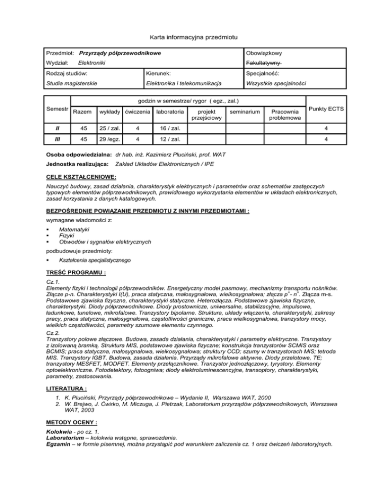 Karta informacyjna przedmiotu Przedmiot: Przyrządy półprzewodnikowe Obowiązkowy Wydział: Fakultatywny Elektroniki Rodzaj studiów: Kierunek: Specjalność: Studia magisterskie Elektronika i telekomunikacja Wszystkie specjalności godzin w semestrze/ rygor ( egz., zal.) Semestr Razem wykłady ćwiczenia laboratoria projekt przejściowy seminarium Pracownia problemowa Punkty ECTS II 45 25 / zal. 4 16 / zal. 4 III 45 29 /egz. 4 12 / zal. 4 Osoba odpowiedzialna: dr hab. inż. Kazimierz Pluciński, prof. WAT Jednostka realizująca: Zakład Układów Elektronicznych / IPE CELE KSZTAŁCENIOWE: Nauczyć budowy, zasad działania, charakterystyk elektrycznych i parametrów oraz schematów zastępczych typowych elementów półprzewodnikowych, prawidłowego wykorzystania elementów w układach elektronicznych, zasad korzystania z danych katalogowych. BEZPOŚREDNIE POWIĄZANIE PRZEDMIOTU Z INNYMI PRZEDMIOTAMI : wymagane wiadomości z: Matematyki Fizyki Obwodów i sygnałów elektrycznych podbudowuje przedmioty: Kształcenia specjalistycznego TREŚĆ PROGRAMU : Cz.1. Elementy fizyki i technologii półprzewodników. Energetyczny model pasmowy, mechanizmy transportu nośników. + + Złącze p-n. Charakterystyki I(U), praca statyczna, małosygnałowa, wielkosygnałowa; złącza p - n . Złącza m-s. Podstawowe zjawiska fizyczne, charakterystyki statyczne. Heterozłącza. Podstawowe zjawiska fizyczne, charakterystyki. Diody półprzewodnikowe. Diody prostownicze, uniwersalne, stabilizacyjne, impulsowe, ładunkowe, tunelowe, mikrofalowe. Tranzystory bipolarne. Struktura, układy włączenia, charakterystyki, zakresy pracy, praca statyczna, małosygnałowa, częstotliwości graniczne, praca wielkosygnałowa, tranzystory mocy, wielkich częstotliwości, parametry szumowe elementu czynnego. Cz.2. Tranzystory polowe złączowe. Budowa, zasada działania, charakterystyki i parametry elektryczne. Tranzystory z izolowaną bramką. Struktura MIS, podstawowe zjawiska fizyczne; konstrukcja tranzystorów SCMIS oraz BCMIS; praca statyczna, małosygnałowa, wielkosygnałowa; struktury CCD; szumy w tranzystorach MIS; tetroda MIS. Tranzystory IGBT. Budowa, zasada działania. Przyrządy mikrofalowe aktywne. Diody przelotowe, TE; tranzystory MESFET, MODFET. Elementy przełącznikowe. Tranzystor jednozłączowy, tyrystory. Elementy optoelektroniczne. Fotodetektory, fotoogniwa; diody elektroluminescencyjne, transoptory, charakterystyki, parametry, zastosowania. LITERATURA : 1. K. Pluciński, Przyrządy półprzewodnikowe – Wydanie II, Warszawa WAT, 2000 2. W. Brejwo, J. Ćwirko, M. Miczuga, J. Pietrzak, Laboratorium przyrządów półprzewodnikowych, Warszawa WAT, 2003 METODY OCENY : Kolokwia - po cz. 1. Laboratorium – kolokwia wstępne, sprawozdania. Egzamin – w formie pisemnej, można przystąpić pod warunkiem zaliczenia cz. 1 oraz ćwiczeń laboratoryjnych.
