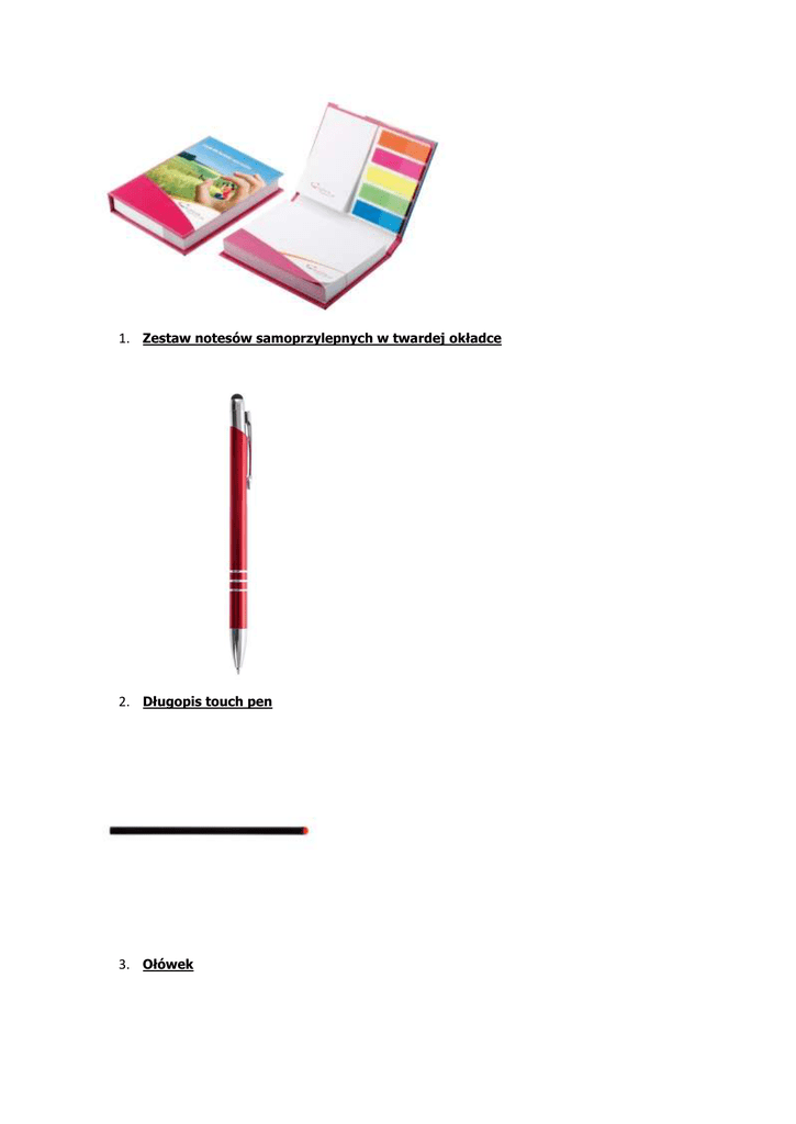 1. Zestaw notesów samoprzylepnych w twardej okładce 2. Długopis