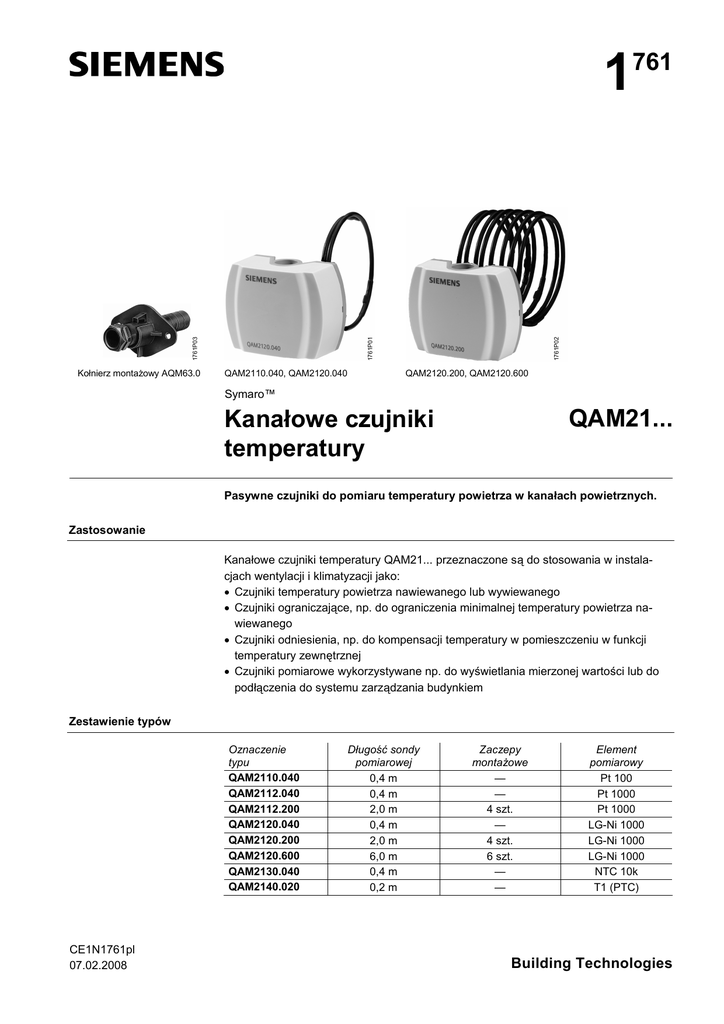 Kołnierz montażowy AQM63.0 QAM2110.040, QAM2120.040 1761P02 1761P01 1761P03 1 761 QAM2120.200, QAM2120.600 Symaro™ QAM21... Kanałowe czujniki temperatury Pasywne czujniki do pomiaru temperatury powietrza w kanałach powietrznych. Zastosowanie Kanałowe czujniki temperatury QAM21... przeznaczone są do stosowania w instalacjach wentylacji i klimatyzacji jako: • Czujniki temperatury powietrza nawiewanego lub wywiewanego • Czujniki ograniczające, np. do ograniczenia minimalnej temperatury powietrza nawiewanego • Czujniki odniesienia, np. do kompensacji temperatury w pomieszczeniu w funkcji temperatury zewnętrznej • Czujniki pomiarowe wykorzystywane np. do wyświetlania mierzonej wartości lub do podłączenia do systemu zarządzania budynkiem Zestawienie typów Oznaczenie typu QAM2110.040 QAM2112.040 QAM2112.200 QAM2120.040 QAM2120.200 QAM2120.600 QAM2130.040 QAM2140.020 CE1N1761pl 07.02.2008 Długość sondy pomiarowej 0,4 m 0,4 m 2,0 m 0,4 m 2,0 m 6,0 m 0,4 m 0,2 m Zaczepy montażowe — — 4 szt. — 4 szt. 6 szt. — — Element pomiarowy Pt 100 Pt 1000 Pt 1000 LG-Ni 1000 LG-Ni 1000 LG-Ni 1000 NTC 10k T1 (PTC) Building Technologies Wyposażenie dodatkowe (części zamienne) Nazwa Oznaczenie typu Zaczepy montażowe kapilary (6 szt.) do czujników z sondą pomiarową o długości 2 m lub 6 m AQM63.3 Kołnierz montażowy AQM63.0 Zamawianie i dostawa Przy zamawianiu należy podać nazwę i oznaczenie typu urządzenia, np.: Kanałowy czujnik temperatury QAM2120.040 Czujnik dostarczany jest z kołnierzem montażowym AQM63.0 oraz zaczepami montażowymi (jeśli są wymagane). Urządzenia współpracujące Wszystkie systemy lub urządzenia, do których można podłączyć pasywny sygnał wyjściowy czujnika. Działanie Czujnik dokonuje pomiaru temperatury powietrza za pomocą elementu pomiarowego, którego rezystancja zmienia się w funkcji temperatury. Sygnał pomiarowy z czujnika podłączany jest do odpowiedniego regulatora. Charakterystyka: Dokładność: R [Ω] 1400 ∆ϑ [K] 2.0 1200 1.0 1000 0.0 800 −1.0 600 −50 −40 −30 −20 −10 0 10 20 30 40 50 60 70 80 ϑ [°C] 1771D02 LG-Ni 1000 1771D01 −2.0 −50 −40 −30 −20 −10 ϑ 0 10 20 30 40 50 60 70 80 [°C] 1811D05 R [Ω] Pt 100 (klasa B) 140 120 ∆ϑ [K] 1811D06 Element pomiarowy 0.8 0.4 0.0 100 −0.4 80 −0.8 60 −50 −40 −30 −20 −10 0 10 20 30 40 50 60 70 ϑ 80 [°C] −50 −40 −30 −20 −10 0 10 20 30 40 50 60 70 80 ϑ [°C] 2/6 Siemens Building Technologies Kanałowe czujniki temperatury QAM21... CE1N1761pl 07.02.2008 Charakterystyka: Dokładność: 1400 1200 ∆ϑ [K] 1761D02 1761D01 R [Ω] Pt 1000 (klasa B) 0.8 0.4 0.0 1000 −0.4 800 −0.8 600 −50 −40 −30 −20 −10 0 10 ϑ 80 [°C] 20 30 40 50 60 70 0 ϑ [°C] 10 20 30 40 50 60 70 80 R [Ω] ∆ϑ [K] 3000 2800 5.0 4.0 3.0 2600 2.0 2400 1.0 2200 0.0 2000 −1.0 −2.0 1800 −3.0 1600 −4.0 1400 −40 −30 −20 −10 0 10 20 30 40 50 60 70 ϑ 80 [°C] R [Ω] NTC 10k 1811D09 100000 10000 1000 -40 -30 -20 -10 −5.0 −40 −30 −20 −10 ϑ 0 10 20 30 40 50 60 70 80 [°C] ∆ϑ [K] 1000000 R ϑ ∆ϑ 1864D02 1864D01 3200 0 10 20 30 40 50 60 70 80 ϑ [°C] 1.20 1.00 0.80 0.60 0.40 0.20 0.00 -0.20 -0.40 -0.60 -0.80 -1.00 -1.20 -40 -30 -20 -10 1811D08 T1 (PTC) Legenda −50 −40 −30 −20 −10 0 10 20 30 40 50 60 70 80 ϑ [°C] Rezystancja [Ω] Temperatura [°C] Różnica temperatury [K] Budowa Kanałowy czujnik temperatury QAM21... składa się z następujących elementów: • Dwuczęściowej obudowy z tworzywa sztucznego, w skład której wchodzi podstawa z zaciskami podłączeniowymi oraz zdejmowana pokrywa (mocowana zatrzaskowo) • W pełni aktywnej, giętkiej sondy pomiarowej z elementem pomiarowym mierzącym średnią temperaturę Zaciski podłączeniowe dostępne są po zdjęciu pokrywy. Kabel podłączeniowy doprowadzany jest przez przepust, który w razie potrzeby można zamienić na dławik kablowy M16 (IP54). Po zamocowaniu kołnierza montażowego, czujnik może być montowany w 6 różnych pozycjach, tak by obudowa czujnika znajdowała się na zewnątrz warstwy izolacyjnej, której grubość może wynosić do 70 mm. Sonda pomiarowa o długości 2 lub 6 m mo- 3/6 Siemens Building Technologies Kanałowe czujniki temperatury QAM21... CE1N1761pl 07.02.2008 cowana jest w poprzek kanału powietrznego za pomocą zaczepów montażowych dostarczanych z czujnikiem. Wskazówki do montażu Miejsce montażu • Przy regulacji temperatury powietrza nawiewanego: Za wentylatorem, jeśli wentylator umieszczony jest za ostatnim urządzeniem przygotowania powietrza. W przeciwnym wypadku w odległości min. 0,5 m za ostatnim urządzeniem przygotowania powietrza. • Przy regulacji temperatury powietrza wywiewanego: Zawsze przed wentylatorem powietrza wywiewanego. • Jako czujnik ograniczający temperaturę powietrza nawiewanego: Jak najbliżej miejsca nawiewu (wlotu) powietrza do pomieszczenia. • Jako czujnik punktu rosy: Tuż za osuszaczem komory zraszania, Sondę pomiarową czujnika należy wygiąć ręcznie tak, aby przebiegała ukośnie w poprzek kanału lub tak, aby jej równo wygięte odcinki rozmieszczone były w całym przekroju kanału. Sonda pomiarowa nie może stykać się ze ścianą kanału. Instrukcja montażu wydrukowana jest na opakowaniu. Dopuszczalne: Niedopuszczalne: 1761Z03 Pozycje montażu Przykłady montażu 0 m m m 0 m m A 1761Z05 1 .7 ax 2 A 1761Z09 20 1761Z07 n. mi Dane techniczne Dane funkcjonalne Zakres pomiarowy Dane ochronne Element pomiarowy Sonda pomiarowa Długość Minimalny promień zgięcia Stała czasowa Czas zwłoki Dokładność pomiaru Stopień ochrony obudowy Z dławikiem kablowym M16 x 1,5 Klasa bezpieczeństwa Zaciski śrubowe do przewodów Doprowadzenie kabla Przepust Dławik kablowy Dopuszczalne długości przewodów Połączenie elektryczne −40...+80 °C dla czuiników NTC −50...+80 °C pozostałe typy patrz „Zestawienie typów” patrz „Zestawienie typów” 10 mm 30 s przy