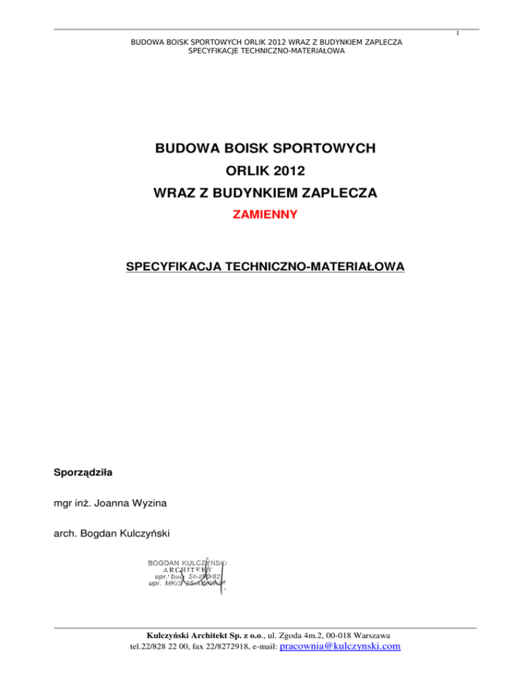 1 BUDOWA BOISK SPORTOWYCH ORLIK 2012 WRAZ Z BUDYNKIEM ZAPLECZA SPECYFIKACJE TECHNICZNO-MATERIAŁOWA BUDOWA BOISK SPORTOWYCH ORLIK 2012 WRAZ Z BUDYNKIEM ZAPLECZA ZAMIENNY SPECYFIKACJA TECHNICZNO-MATERIAŁOWA Sporządziła mgr inż. Joanna Wyzina arch. Bogdan Kulczyński Kulczyński Architekt Sp. z o.o., ul. Zgoda 4m.2, 00-018 Warszawa tel.22/828 22 00, fax 22/8272918, e-mail: [email protected] 2 BUDOWA BOISK SPORTOWYCH ORLIK 2012 WRAZ Z BUDYNKIEM ZAPLECZA SPECYFIKACJE TECHNICZNO-MATERIAŁOWA SPECYFIKACJA TECHNICZNO-MATERIAŁOWA 1.. ROBOTY ZIEMNE 1.1. Informacje ogólne Wykonawca jest zobowiązany przestrzegać postanowień polskich norm (np. PN-B-06050:1999 Geotechnika. Roboty ziemne. Wymagania ogólne) oraz zaleceń „Warunków technicznych wykonania i odbioru robót budowlano-montażowych” - wydawnictwo ARKADY. − Wykonawca potwierdza pełną znajomość warunków gruntowo-wodnych. Ewentualne wątpliwości dotyczące tych warunków Oferent powinien samodzielnie rozstrzygnąć na etapie przygotowania oferty (np. dodatkowe wiercenia, badania laboratoryjne, drenaż itp.) − Oferta na wykonanie robót ziemnych powinna zawierać wszystkie techniczne i materiałowe rozwiązania konieczne do wydajnej i bezpiecznej pracy oraz gwarantujące wykonanie robót ziemnych zgodnie z wymaganiami projektu i obowiązujących przepisów. Podstawowe rozwiązania podano poniżej. − Cena robót ziemnych ma charakter ryczałtowy i jest niezmienna. 1.2. Dokumentacja geotechniczna i powykonawcza − Wyniki badań geotechnicznych powinny zostać zweryfikowana przez Wykonawcę na budowie w celu ustalenia warunków posadowienia, nośności podłoża, parametrów geotechnicznych i przydatności gruntu dla celów budowlanych. Wszelkie odstępstwa od założeń projektowych należy natychmiast zgłaszać Projektantowi. Odstępstwa te nie zmieniają zasady ryczałtu robót ziemnych. − Wyniki testów kontrolnych należy załączyć do dokumentacji powykonawczej. − Podczas wykonywania robót ziemnych, Wykonawca powinien prowadzić dokumentację powykonawczą, która powinna zawierać wyniki badań laboratoryjnych i polowych podłoża, wyniki kontroli i aktualny projekt części podziemnej budynku. − Wszystkie roboty ziemne powinny być wykonywane pod stałym nadzorem geotechnicznym i muszą zostać - jako roboty zanikające - odebrane przez Inspektora Nadzoru przed rozpoczęciem następnego etapu prac związanych z podłożem. Kulczyński Architekt Sp. z o.o., ul. Zgoda 4m.2, 00-018 Warszawa tel.22/828 22 00, fax 22/8272918, e-mail: [email protected] 3 BUDOWA BOISK SPORTOWYCH ORLIK 2012 WRAZ Z BUDYNKIEM ZAPLECZA SPECYFIKACJE TECHNICZNO-MATERIAŁOWA 1.3. Przydatność gruntu − Badania kontrolne gruntu pod względem przydatności do robót ziemnych należy wykonać przed jego zastosowaniem. − Do zasypywania wykopów i formowania nasypów należy używać zasypki strukturalnej, mechanicznie zagęszczanej warstwami o grubości zależnej od zastosowanych urządzeń, wskaźnik zagęszczenia musi wynosić przynajmniej 0,98 dla wszystkich elementów konstrukcyjnych ( fundamenty, drogi, miejsca parkingowe, place rozładunkowe, i 0,70 dla terenów zielonych. − Zasypywanie wykopów powinno być wykonywane pod stałym nadzorem geotechnicznym. W trakcie wykonywania tych prac należy prowadzić powykonawczą inwentaryzacje nasypów. − Grunty zawierające zanieczyszczenia takie jak np. odpady materiałów budowlanych czy części organiczne (więcej niż 2%) nie nadają się do celów budowlanych. 1.4. Roboty przygotowawcze − Przed rozpoczęciem robót ziemnych, należy wytyczyć budynek w oparciu o realizacyjny plan zagospodarowania. − W obrębie robót ziemnych jako pierwszą pracę należy wykonać usunięcie humusu i nasypów. − Wykopany grunt należy składować w miejscu uzgodnionym z Inspektorem Nadzoru. Nadmiar gruntu należy natychmiast wywozić. 1.5. Odwadnianie terenu dla robót ziemnych − Do obowiązków Wykonawcy należy opracowanie projektu powierzchniowego odwodnienia placu budowy i przedstawienie go do akceptacji Inspektora Nadzoru. − Na podstawie uzgodnionego projektu Wykonawca wykona odwodnienia placu budowy na cały okres trwania budowy. − Grunt spoisty nie może zostać uplastyczniony lub nawodniony podczas wykonywania robót; grunt naruszony należy usunąć i zastąpić chudym betonem lub piaskiem stabilizowanym (około 100 kg cementu na 1 m3 piasku). − Roboty ziemne należy prowadzić w sposób, który zapewni łatwy i szybki powierzchniowy odpływ wód deszczowych poza teren prac. − Dno wykopu fundamentowego należy zabezpieczyć przed szkodliwym działaniem wód opadowych i gruntowych. − Roboty ziemne w wykopie fundamentowym należy wykonywać w kolejności, która zapewni szybki i łatwy odpływ wód opadowych i gruntowych. − Obniżenie poziomu wód gruntowych nie może naruszać struktury podłoża wznoszonego lub sąsiedniego budynku. Pompowanie wody z cząstkami gruntu jest zabronione. − Na podstawie odwiertów geologicznych należy stwierdzić że w rejonach odwiertów kontrolnych 10, 14, 16, 27, 38 występuje napięte zwierciadło wody gruntowej. Na etapie robót ziemnych należy w tym rejonie przewidzieć wykonanie drenażu, celem uchwycenia wody gruntowej. Rzędne drenażu powinny Kulczyński Architekt Sp. z o.o., ul. Zgoda 4m.2, 00-018 Warszawa tel.22/828 22 00, fax 22/8272918, e-mail: [email protected] 4 BUDOWA BOISK SPORTOWYCH ORLIK 2012 WRAZ Z BUDYNKIEM ZAPLECZA SPECYFIKACJE TECHNICZNO-MATERIAŁOWA wynosić ok. 92-93m.n.p.m.. W rejonie odwiertów kontrolnych 37-38 ok. 92-93m.n.p.m., w rejonie odwiertów 14-27 ok. 90m.n.p.m., a w rejonie odwiertów 7-12 ok. 87m.n.p.m. Drugim obszarem gdzie występuje woda gruntowa lecz o swobodnym zwierciadle jest obszar punktów 69-70. Ten rejon wydaje się możliwy do osuszenia z wody gruntowej przy pomocy rowu otwartego na rzędnej ok. 90m.n.p.m. Z uwagi na docelową rzędną terenu po wykonaniu prac makroniwelacyjnych wy