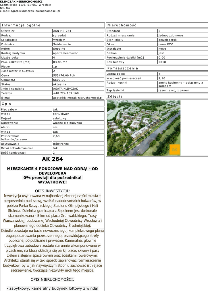 KLIMCZAK NIERUCHOMOŚCI Kazimierska 11/6, 51-657 Wrocław tel. fax. e-mail:[email protected] Informacje ogólne Nieruchomość Oferta nr AKN-MS-264 Standard 5 Rodzaj sprzedaż Rodzaj mieszkania jednopoziomowe Lokalizacja Wrocław Stan lokalu deweloperski Dzielnica Śródmieście Okna nowe PCV Rejon Sępolno Instalacje nowe Rodzaj budynku apartamentowiec Balkon jest Liczba pokoi 4 Powierzchnia działki [m2] 0.00 Pow. całkowita [m2] 83.86 m² Rok budowy 2018 Piętro 1p Ilość pięter w budynku 2 Cena 553476.00 PLN Cena/m2 6600.00 Status aktualna Imię i nazwisko AGATA KLIMCZAK Telefon +48 724 169 168 E-mail [email protected] Opis Plac zabaw tak Widok park/skwer Dojazd asfaltowy Ogrzewanie własne dla budynku Alarm nie Winda tak Powierzchnia balkonów/tarasów 7,60 Usytuowanie trójstronne Drzwi antywłamaniowe tak Ilość kondygnacji 2 AK 264 MIESZKANIE 4 POKOJOWE NAD ODRĄ! - OD DEVELOPERA 0% prowizji dla pośrednika! WYJĄTKOWE! OPIS INWESTYCJI: Inwestycja usytuowana w najbardziej zielonej części miasta – bezpośrednio nad rzeką, wzdłuż nadodrzańskich bulwarów, w pobliżu Parku Szczytnickiego, Stadionu Olimpijskiego i Hali Stulecia. Dzielnica granicząca z Sępolnem jest doskonale skomunikowana - 5 km od placu Grunwaldzkiego, Trasy Warszawskiej, budowanej Wschodniej Obwodnicy Wrocławia i planowanego odcinka Obwodnicy Śródmiejskiej. Osiedle powstaje na bazie nowoczesnego, kompleksowego planu zagospodarowania przestrzennego, przewidującego strefy publiczne, półpubliczne i prywatne. Kameralna, głównie trzypiętrowa zabudowa została starannie wkomponowana w przestrzeń, na którą składają się parki, place, skwery i pasy zieleni z alejami spacerowymi oraz ścieżkami rowerowymi. Architekci starali się w taki sposób zaplanować rozmieszczenie budynków, by w jak największym stopniu zachować istniejące zadrzewienie, tworzące niezwykły urok tego miejsca. OPIS NIERUCHOMOŚCI: - zabytkowy, kameralny budynek loftowy z windą! Pomieszczenia Liczba pokoi 4 Wysokość pomieszczeń 2,90 Rodzaj kuchni aneks kuchenny - połączony z salonem Typ łazienki razem z wc, z oknem Zdjęcia - mieszkanie o powierzchni 83,86m2, 4 pokoje, I piętro w budynku II piętrowym - trójstronne - kuchnia w formie aneksu (można wydzielić kuchnię widną) - taras o pow. 7,60m2, - łazienka z oknem, dodatkowa toaleta - ogrzewanie w lokalnej kotłowni - niskie koszty utrzymania - ciepłe i słoneczne - przyjazna osiedlowa społeczność, dla ceniących spokój i zieleń, - monitoring, fitness, ochrona, winda, garaż podziemny - elastyczne formy płatności dla developera - możliwość realizacji gotowej do zamieszkania "POD KLUCZ" - termin realizacji 28.02.2018r. ZAPRASZAM! WIĘCEJ SZCZEGÓŁÓW: AGATA KLIMCZAK KLIMCZAK NIERUCHOMOŚCI tel: 724 169 168 © Wszelkie prawa zastrzeżone - KLIMCZAK NIERUCHOMOŚCI