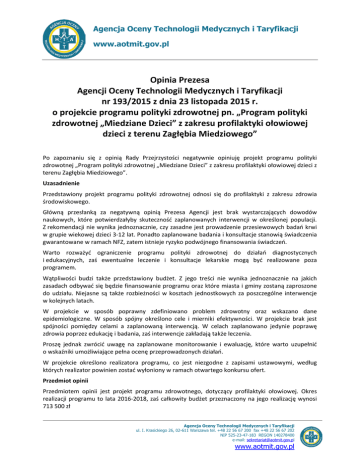 Agencja Oceny Technologii Medycznych i Taryfikacji www.aotmit.gov.pl Opinia Prezesa Agencji Oceny Technologii Medycznych i Taryfikacji nr 193/2015 z dnia 23 listopada 2015 r. o projekcie programu polityki zdrowotnej pn. „Program polityki zdrowotnej „Miedziane Dzieci” z zakresu profilaktyki ołowiowej dzieci z terenu Zagłębia Miedziowego” Po zapoznaniu się z opinią Rady Przejrzystości negatywnie opiniuję projekt programu polityki zdrowotnej „Program polityki zdrowotnej „Miedziane Dzieci” z zakresu profilaktyki ołowiowej dzieci z terenu Zagłębia Miedziowego”. Uzasadnienie Przedstawiony projekt programu polityki zdrowotnej odnosi się do profilaktyki z zakresu zdrowia środowiskowego. Główną przesłanką za negatywną opinią Prezesa Agencji jest brak wystarczających dowodów naukowych, które potwierdzałyby skuteczność zaplanowanych interwencji w określonej populacji. Z rekomendacji nie wynika jednoznacznie, czy zasadne jest prowadzenie przesiewowych badań krwi w grupie wiekowej dzieci 3-12 lat. Ponadto zaplanowane badania i konsultacje stanowią świadczenia gwarantowane w ramach NFZ, zatem istnieje ryzyko podwójnego finansowania świadczeń. Warto rozważyć ograniczenie programu polityki zdrowotnej do działań diagnostycznych i edukacyjnych, zaś ewentualne leczenie i konsultacje lekarskie mogą być realizowane poza programem. Wątpliwości budzi także przedstawiony budżet. Z jego treści nie wynika jednoznacznie na jakich zasadach odbywać się będzie finansowanie programu oraz które miasta i gminy zostaną zaproszone do udziału. Niejasne są także rozbieżności w kosztach jednostkowych za poszczególne interwencje w kolejnych latach. W projekcie w sposób poprawny zdefiniowano problem zdrowotny oraz wskazano dane epidemiologiczne. W sposób spójny określono cele i mierniki efektywności. W projekcie brak jest spójności pomiędzy celami a zaplanowaną interwencją. W celach zaplanowano jedynie poprawę zdrowia poprzez edukację i badania, zaś interwencje zakładają także leczenia. Proszę jednak zwrócić uwagę na zaplanowane monitorowanie i ewaluację, które warto uzupełnić o wskaźniki umożliwiające pełna ocenę przeprowadzonych działań. W projekcie określono realizatora programu, co jest niezgodne z zapisami ustawowymi, według których realizator powinien zostać wyłoniony w ramach otwartego konkursu ofert. Przedmiot opinii Przedmiotem opinii jest projekt programu zdrowotnego, dotyczący profilaktyki ołowiowej. Okres realizacji programu to lata 2016-2018, zaś całkowity budżet przeznaczony na jego realizację wynosi 713 500 zł Agencja Oceny Technologii Medycznych i Taryfikacji ul. I. Krasickiego 26, 02-611 Warszawa tel. +48 22 56 67 200 fax +48 22 56 67 202 NIP 525-23-47-183 REGON 140278400 e-mail: [email protected] www.aotmit.gov.pl Opinia Prezesa AOTMiT nr 193/2015 z dnia 23 listopada 2015r. Opinia Prezesa Agencji została przygotowana w oparciu o ocenę technologii medycznej proponowanej w ramach programu polityki zdrowotnej zgodnie z kryteriami zawartymi w art. 31a ust. 1 i art. 48 ust. 4 ustawy o świadczeniach wraz z oceną założeń projektu programu polityki zdrowotnej, które wspierają efektywność kliniczną i kosztową technologii medycznej planowanej w programie. Ocena projektu programu polityki zdrowotnej Znaczenie problemu zdrowotnego Projekt programu dotyczy istotnego problemu zdrowotnego jakim jest nadmierna ekspozycja środowiskowa na ołów. Problem zdrowotny opisany został w sposób bardzo szczegółowy. W opisie skoncentrowano się na powikłaniach zdrowotnych wynikających z nadmiernej ekspozycji środowiskowej na ołów. Podkreślić należy, że opisany problem zdrowotny skupia się na lokalnych uwarunkowaniach środowiskowych. Programy polityki zdrowotnej z zakresu przeciwdziałania negatywnym skutkom oddziaływania ołowiu na organizm dzieci wpisują się w 6-sty cel operacyjny Narodowego Programu Zdrowia na lata 20072015 dotyczący czynników ryzyka i działań w zakresie promocji zdrowia – Zmniejszenie narażenia na czynniki szkodliwe w środowisku życia i pracy oraz ich skutków zdrowotnych i poprawa stanu sanitarnego kraju. Programy zdrowotne z zakresu profilaktyki ołowiowej u dzieci były przedmiotem opinii AOTMiT. Dotychczas wydano dwie pozytywne opinie Prezesa (42/2012, oraz 43/2012 z 27.03.2012 r.). W opiniach podkreślano, że programy „uwzględniały charakterystykę i potrzeby grupy docelowej. Skutki zdrowotne wynikające z ekspozycji dzieci na ołów (jako populacji krytycznej) są poważniejsze, niż w przypadku osób dorosłych. Zaproponowane przez autorów interwencje są rekomendowane w światowych wytycznych (interwencje dotyczyły: działań edukacyjnych dla dzieci i rodziców, przeprowadzenia ankiety środowiskowej, badania laboratoryjnego na obecność ołowiu w surowicy krwi, przyp. analityka); również w opinii ekspertów były to działania o udowodnionej skuteczności w określonej w programie populacji (programy dotyczyły populacji dzieci, przyp. analityka)”. Projekt programu zawiera szczegółowe dane epidemiologiczne skupiające się przede wszystkim na terenie Legnicko-Głogowskim Okręgu Miedziowym (LGOM). Z treści projektu wynika, że w wyniku badań w latach siedemdziesiątych wykazano, że na terenie LGOM istnieje wysokie narażenie dzieci na przewlekłą intoksykację ołowiem. Tylko ok. 20% badanej populacji dziecięcej miało stężenie ołowiu we krwi (Pb) mniejsze niż 10 pg/dl, natomiast pozostałe badane dzieci (80%) wykazywały stężenie wyższe, w tym połowa powyżej 40 pg/dl. W okresie 1994-2014 średni odsetek dzieci z wysokim poziomem ołowiu wynosił odpowiednio: 8% w gminie Polkowice, 9,5% w gminie Lubin, 16% w Chojnowie, 16% w gminie Legnica, 22% w gminie Głogów. Cele i efekty programu Głównym celem programu jest poprawa stanu zdrowia dzieci z gmin i miast Zagłębia Miedziowego poprzez przeprowadzenie monitoringu zawartości