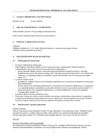 CHARAKTERYSTYKA PRODUKTU LECZNICZEGO 1. NAZWA PRODUKTU LECZNICZEGO Piramil 10 mg, 2. 10 mg, tabletki SKŁAD JAKOŚCIOWY I ILOŚCIOWY Jedna tabletka zawiera 10 mg ramiprylu (Ramiprilum). Pełny wykaz substancji pomocniczych, patrz punkt 6.1. 3. POSTAĆ FARMACEUTYCZNA Tabletka Podłużna tabletka (15 x 6,5 mm), biała lub biaława, z nacięciem po jednej stronie. Tabletkę można podzielić na połowy. 4. 4.1 4.2 SZCZEGÓŁOWE DANE KLINICZNE Wskazania do stosowania Leczenie nadciśnienia tętniczego. Zapobieganie chorobom układu sercowo-naczyniowego: zmniejszenie zachorowalności i umieralności z przyczyn sercowo-naczyniowych u pacjentów z: o jawną chorobą układu sercowo-naczyniowego pochodzenia miażdżycowego (z chorobą niedokrwienną serca lub udarem mózgu, lub z chorobą naczyń obwodowych w wywiadzie) lub o cukrzycą i co najmniej jednym czynnikiem ryzyka dla choroby sercowo-naczyniowej (patrz punkt 5.1). Leczenie chorób nerek: o początkowe stadium cukrzycowej nefropatii kłębuszkowej stwierdzone na podstawie obecności mikroalbuminurii o jawna cukrzycowa nefropatia kłębuszkowa stwierdzona na podstawie białkomoczu u pacjentów z co najmniej jednym czynnikiem ryzyka dla choroby sercowo-naczyniowej (patrz punkt 5.1) o jawna niecukrzycowa nefropatia kłębuszkowa, w której białkomocz wynosi co najmniej 3 g/dobę (patrz punkt 5.1). Leczenie objawowej niewydolności serca. Prewencja wtórna po ostrym zawale mięśnia sercowego: zmniejszenie umieralności u pacjentów z klinicznymi objawami niewydolności serca po ostrej fazie zawału mięśnia sercowego. Produkt leczniczy należy włączyć do leczenia po upływie 48 godzin od ostrej fazy zawału. Dawkowanie i sposób podawania Podanie doustne. Zaleca się przyjmowanie produktu Piramil 10 mg codziennie o tej samej porze dnia. Tabletki można przyjmować przed, w trakcie lub po posiłku, gdyż pokarm nie zmienia biodostępności produktu leczniczego (patrz punkt 5.2). Tabletki należy popijać płynem. Nie wolno ich żuć ani kruszyć. Dorośli Pacjenci otrzymujący leki moczopędne Po rozpoczęciu leczenia produktem Piramil 10 mg może wystąpić niedociśnienie tętnicze; jest ono bardziej prawdopodobne u pacjentów leczonych jednocześnie lekami moczopędnymi. Należy 1 zachować ostrożność, gdyż w tej grupie pacjentów może występować odwodnienie i (lub) hiponatremia. Jeśli to możliwe, leki moczopędne należy odstawić 2 do 3 dni przed rozpoczęciem leczenia produktem Piramil 10 mg (patrz punkt 4.4). U pacjentów z nadciśnieniem tętniczym, u których nie odstawiono leku moczopędnego, leczenie produktem Piramil 10 mg należy rozpocząć od dawki 1,25 mg. Należy kontrolować czynność nerek i stężenie potasu w surowicy. Dalsze dawkowanie produktu Piramil 10 mg należy ustalać w zależności od docelowych wartości ciśnienia tętniczego. Nadciśnienie tętnicze Dawkę należy zindywidualizować w zależności od profilu pacjenta (patrz punkt 4.4) i kontroli ciśnienia tętniczego. Produkt Piramil 10 mg może być stosowany w monoterapii lub w skojarzeniu z lekami przeciwnadciśnieniowymi z innych grup. Dawka początkowa Produkt Piramil 10 mg należy włączać do leczenia stopniowo, z zalecaną dawką początkową 2,5 mg na dobę. U pacjentów z silną aktywacją układu renina-angiotensyna-aldosteron może wystąpić nadmierne obniżenie ciśnienia tętniczego po podaniu dawki początkowej. U tych pacjentów zaleca się zastosowanie dawki początkowej 1,25 mg i rozpoczęcie leczenia pod nadzorem lekarza (patrz punkt 4.4). Ustalanie dawki i dawka podtrzymująca Dawkę można podwajać co 2 do 4 tygodni w celu osiągnięcia docelowego ciśnienia tętniczego; maksymalna dozwolona dawka produktu Piramil 10 mg wynosi 10 mg/dobę. Produkt leczniczy podaje się zwykle raz na dobę. Zapobieganie chorobom układu sercowo-naczyniowego Dawka początkowa Zalecana dawka początkowa produktu Piramil 10 mg wynosi 2,5 mg raz na dobę. Ustalanie dawki i dawka podtrzymująca Dawkę należy zwiększać stopniowo w zależności od tolerancji substancji czynnej przez pacjenta. Zaleca się podwojenie dawki po jednym lub dwóch tygodniach leczenia, a po kolejnych dwóch do trzech tygodni zwiększenie jej do docelowej dawki podtrzymującej, wynoszącej 10 mg produktu Piramil 10 mg raz dobę. Patrz także wyżej dawkowanie u pacjentów leczonych lekami moczopędnymi. Leczenie choroby nerek U pacjentów z cukrzycą i mikroalbuminurią: Dawka początkowa Zalecana dawka początkowa produktu Piramil 10 mg wynosi 1,25 mg raz na dobę. Ustalanie dawki i dawka podtrzymująca Dawkę należy zwiększać stopniowo w zależności od tolerancji substancji czynnej przez pacjenta. Po dwóch tygodniach leczenia zalecane jest podwojenie dawki do 2,5 mg raz na dobę, a po kolejnych dwóch tygodniach do 5 mg. U pacjentów z cukrzycą i co najmniej jednym czynnikiem ryzyka sercowo-naczyniowego Dawka początkowa Zalecana dawka początkowa produktu Piramil 10 mg wynosi 2,5 mg raz na dobę. 2 Ustalanie dawki i dawka podtrzymująca Dawkę należy zwiększać stopniowo w zależności od tolerancji substancji czynnej przez pacjenta. Po jednym lub dwóch tygodniach leczenia zaleca się podwojenie dawki do 5 mg raz na dobę, a po kolejnych dwóch lub trzech tygodniach do 10 mg. Docelowa dawka dobowa wynosi 10 mg. U pacjentów z nefropatią o etiologii innej niż cukrzycowa, określoną na podstawie białkomoczu ≥3 g/dobę Dawka początkowa Zalecana dawka początkowa produktu Piramil 10 mg wynosi 1,25 mg raz na dobę. Ustalanie dawkowania i dawka podtrzymująca Dawkę należy zwiększać stopniowo w zależności od tolerancji substancji czynnej przez pacjenta. Po dwóch tygodniach zaleca się podwojenie dawki do 2,5 mg raz na dobę, a po kolejnych dwóch tygodniach do 5 mg. Objawowa niewydolność serca Dawka początkowa U pacjentów, których stan ustabilizowano lekiem moczopędnym, zalecana dawka początkowa wynosi 1,25 mg na dobę. Ustalanie dawki i d