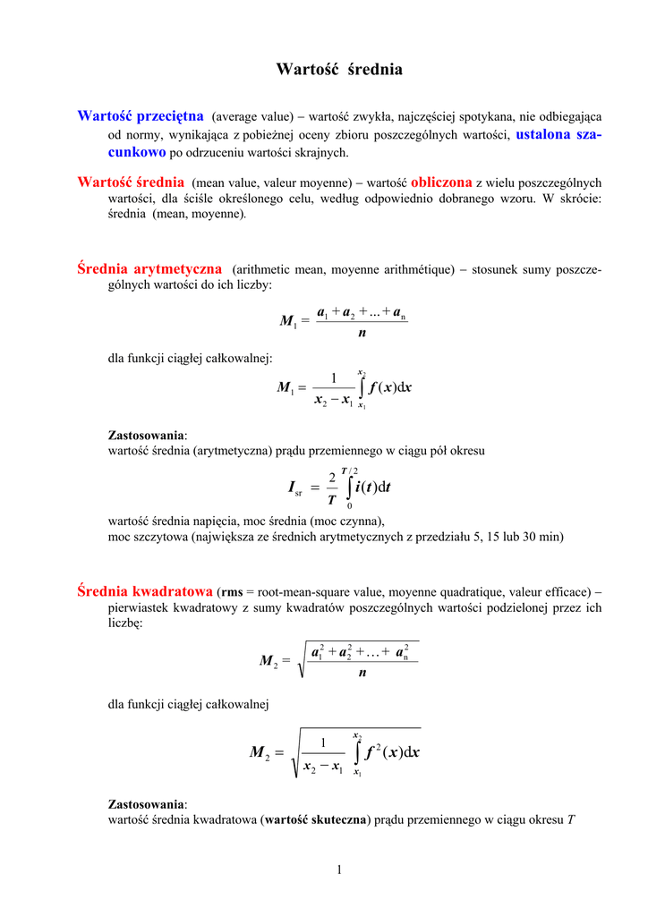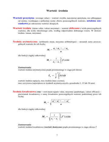 Wartość średnia Wartość przeciętna (average value) − wartość zwykła, najczęściej spotykana, nie odbiegająca od normy, wynikająca z pobieżnej oceny zbioru poszczególnych wartości, ustalona szacunkowo po odrzuceniu wartości skrajnych. Wartość średnia (mean value, valeur moyenne) − wartość obliczona z wielu poszczególnych wartości, dla ściśle określonego celu, według odpowiednio dobranego wzoru. W skrócie: średnia (mean, moyenne). Średnia arytmetyczna (arithmetic mean, moyenne arithmétique) − stosunek sumy poszczególnych wartości do ich liczby: a1 + a 2 + ... + a n n M1 = dla funkcji ciągłej całkowalnej: x2 1 M1 = x 2 − x1 ∫ f ( x )dx x1 Zastosowania: wartość średnia (arytmetyczna) prądu przemiennego w ciągu pół okresu 2 I sr = T /2 ∫ i (t )dt T 0 wartość średnia napięcia, moc średnia (moc czynna), moc szczytowa (największa ze średnich arytmetycznych z przedziału 5, 15 lub 30 min) Średnia kwadratowa (rms = root-mean-square value, moyenne quadratique, valeur efficace) − pierwiastek kwadratowy z sumy kwadratów poszczególnych wartości podzielonej przez ich liczbę: M2 = a12 + a22 + . . . + a n2 n dla funkcji ciągłej całkowalnej M2 = x2 1 x2 − x1 ∫f 2 ( x )dx x1 Zastosowania: wartość średnia kwadratowa (wartość skuteczna) prądu przemiennego w ciągu okresu T 1 1 I = T T ∫i 2 ( t ) dt 0 wartość skuteczna napięcia, prąd zwarciowy zastępczy cieplny, prąd roboczy zastępczy cieplny, moment oporowy zastępczy silnika Średnia kwadratowa jest nie mniejsza niż średnia arytmetyczna! Średnia geometryczna, średnia proporcjonalna (geometric mean, moyenne géométrique) − pierwiastek stopnia równego liczbie poszczególnych wartości z iloczynu tych wartości: n G = a1 ⋅ a2 ⋅ .... ⋅ an Przykład: wyzwalacz wyłącznika różnicowoprądowego, którego zakres tolerancji prądu zadziałania wynosi (0,5÷1)IΔn, a odchyłki dodatnie i ujemne są równie prawdopodobne, powinien być fabrycznie nastawiony na prąd równy średniej geometrycznej dolnej i górnej granicy zakresu tolerancji: G ( I Δn ) = 2 0,5 I Δn ⋅ I Δn = 0,707 I Δn ≈ 0,71 I Δn Średnia geometryczna jest nie większa niż średnia arytmetyczna! Uogólnienie pojęcia średniej potęgowej Średnia potęgowa rzędu k liczb dodatnich a1, a2, . . an ⎛ a + a + ... + a M k = ⎜⎜ n ⎝ k 1 k 2 k n ⎞ ⎟⎟ ⎠ 1 k gdzie k≠0 M −∞ = lim M k = min (a1 , a 2 ... a n ) jeśli k →-∞ otrzymuje się jeśli k = -1 otrzymuje się średnią harmoniczną jeśli k → 0 otrzymuje się średnią geometryczną G = M 0 = lim M k jeśli k = 1 otrzymuje się średnią arytmetyczną M1 jeśli k = 2 otrzymuje się średnią kwadratową M2 jeśli k →∞ otrzymuje się M ∞ = lim M k = max (a1 , a 2 ... a n ) k→−∞ M -1 k →0 k →∞ Zachodzi zależność M -∞ ≤ . . . ≤ M-1 ≤ M0 ≤ M1 ≤ M2 ≤ . . . ≤ M ∞ 2 Średnia ważona (weighted mean, moyenne pondérée) z wagami p1, p2, . . . pn (pj > 0) liczb odpowiednio a1, a2, . . . an Mw = p1 ⋅ a1 + p2 ⋅ a2 + . . . + pn ⋅ an p1 + p2 + . . . + pn Przykłady: Średnia ważona ocen studenta za semestr, za cały okres studiów (wagą zwykle jest liczba godzin przeznaczona na przedmiot lub jej podwielokrotność, tzn. liczba modułów 15- albo 10godzinnych). Średnie ważone natężenie oświetlenia w pomieszczeniu (np. z wagami: 0,25 w narożnikach, 0,50 w pasach przyściennych, 1,0 w pozostałych miejscach). Edward Musiał 3