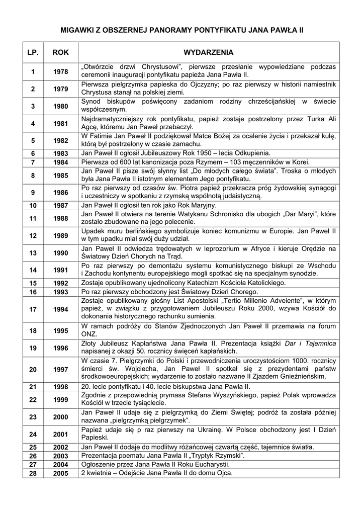 MIGAWKI Z OBSZERNEJ PANORAMY PONTYFIKATU JANA PAWŁA II LP. ROK 1 1978 2 1979 3 1980 4 1981 5 1982 6 7 1983 1984 8 1985 9 1986 10 1987 11 1988 12 1989 13 1990 14 1991 15 16 1992 1993 17 1994 18 1995 19 1996 20 1997 21 1998 22 1999 23 2000 24 2001 25 26 27 28 2002 2003 2004 2005 WYDARZENIA „Otwórzcie drzwi Chrystusowi”, pierwsze przesłanie wypowiedziane podczas ceremonii inauguracji pontyfikatu papieża Jana Pawła II. Pierwsza pielgrzymka papieska do Ojczyzny; po raz pierwszy w historii namiestnik Chrystusa stanął na polskiej ziemi. Synod biskupów poświęcony zadaniom rodziny chrześcijańskiej w świecie współczesnym. Najdramatyczniejszy rok pontyfikatu, papież zostaje postrzelony przez Turka Ali Agcę, któremu Jan Paweł przebaczył. W Fatimie Jan Paweł II podziękował Matce Bożej za ocalenie życia i przekazał kulę, którą był postrzelony w czasie zamachu. Jan Paweł II ogłosił Jubileuszowy Rok 1950 – lecia Odkupienia. Pierwsza od 600 lat kanonizacja poza Rzymem – 103 męczenników w Korei. Jan Paweł II pisze swój słynny list „Do młodych całego świata”. Troska o młodych była Jana Pawła II istotnym elementem Jego pontyfikatu. Po raz pierwszy od czasów św. Piotra papież przekracza próg żydowskiej synagogi i uczestniczy w spotkaniu z rzymską wspólnotą judaistyczną. Jan Paweł II ogłosił ten rok jako Rok Maryjny. Jan Paweł II otwiera na terenie Watykanu Schronisko dla ubogich „Dar Maryi”, które zostało zbudowane na jego polecenie. Upadek muru berlińskiego symbolizuje koniec komunizmu w Europie. Jan Paweł II w tym upadku miał swój duży udział. Jan Paweł II odwiedza trędowatych w leprozorium w Afryce i kieruje Orędzie na Światowy Dzień Chorych na Trąd. Po raz pierwszy po demontażu systemu komunistycznego biskupi ze Wschodu i Zachodu kontynentu europejskiego mogli spotkać się na specjalnym synodzie. Zostaje opublikowany ujednolicony Katechizm Kościoła Katolickiego. Po raz pierwszy obchodzony jest Światowy Dzień Chorego. Zostaje opublikowany głośny List Apostolski „Tertio Millenio Adveiente”, w którym papież, w związku z przygotowaniem Jubileuszu Roku 2000, wzywa Kościół do dokonania historycznego rachunku sumienia. W ramach podróży do Stanów Zjednoczonych Jan Paweł II przemawia na forum ONZ. Złoty Jubileusz Kapłaństwa Jana Pawła II. Prezentacja książki Dar i Tajemnica napisanej z okazji 50. rocznicy święceń kapłańskich. W czasie 7. Pielgrzymki do Polski i przewodniczenia uroczystościom 1000. rocznicy śmierci św. Wojciecha, Jan Paweł II spotkał się z prezydentami państw środkowoeuropejskich; wydarzenie to zostało nazwane II Zjazdem Gnieźnieńskim. 20. lecie pontyfikatu i 40. lecie biskupstwa Jana Pawła II. Zgodnie z przepowiednią prymasa Stefana Wyszyńskiego, papież Polak wprowadza Kościół w trzecie tysiąclecie. Jan Paweł II udaje się z pielgrzymką do Ziemi Świętej; podróż ta została później nazwana „pielgrzymką pielgrzymek”. Papież udaje się p raz pierwszy na Ukrainę. W Polsce obchodzony jest I Dzień Papieski. Jan Paweł II dodaje do modlitwy różańcowej czwartą część, tajemnice światła. Prezentacja poematu Jana Pawła II „Tryptyk Rzymski”. Ogłoszenie przez Jana Pawła II Roku Eucharystii. 2 kwietnia – Odejście Jana Pawła II do domu Ojca.