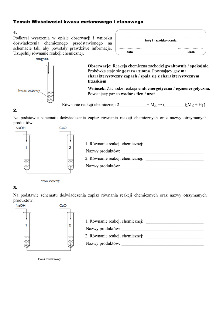 Temat: Właściwości kwasu metanowego i etanowego 1. Podkreśl wyrażenia w opisie obserwacji i wniosku doświadczenia chemicznego przedstawionego na schemacie tak, aby powstały prawdziwe informacje. Uzupełnij równanie reakcji chemicznej. Obserwacje: Reakcja chemiczna zachodzi gwałtownie / spokojnie. Probówka staje się gorąca / zimna. Powstający gaz ma charakterystyczny zapach / spala się z charakterystycznym trzaskiem. Wniosek: Zachodzi reakcja endoenergetyczna / egzoenergetyczna. Powstający gaz to wodór / tlen / azot. Równanie reakcji chemicznej: 2 ____________+ Mg → (_________)2Mg + H2↑ 2. Na podstawie schematu doświadczenia zapisz równania reakcji chemicznych oraz nazwy otrzymanych produktów. 1. Równanie reakcji chemicznej: __________________________ Nazwy produktów: _____________________________________ 2. Równanie reakcji chemicznej: __________________________ Nazwy produktów: _____________________________________ 3. Na podstawie schematu doświadczenia zapisz równania reakcji chemicznych oraz nazwy otrzymanych produktów. 1. Równanie reakcji chemicznej: __________________________ Nazwy produktów: _____________________________________ 2. Równanie reakcji chemicznej: __________________________ Nazwy produktów: _____________________________________ kwas mrówkowy