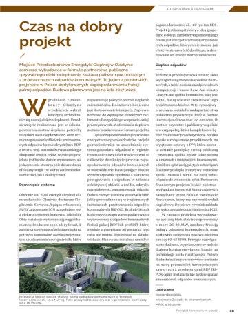 GOSPODARK A ODPADAMI Czas na dobry projekt zagospodarowanie ok. 100 tys. ton RDF . Projekt jest kompatybilny z ideą gospodarki o obiegu zamkniętym ponieważ jego celem jest energetyczne wykorzystanie tych odpadów, których nie można już efektywnie zawrócić do obiegu, a składowanie ich byłoby marnotrawstwem. Miejskie Przedsiębiorstwo Energetyki Cieplnej w Olsztynie zamierza wybudować w formule partnerstwa publiczno-prywatnego elektrociepłownię zasilaną paliwem pochodzącym z przetworzonych odpadów komunalnych. To jeden z pionierskich projektów w Polsce dedykowanych zagospodarowaniu frakcji palnej odpadów. Budowa planowana jest na lata 2017-2020. Ciepło z odpadów W Olsztyn, ani spółka komunalna, jaką jest Realizacja przedsięwzięcia o takiej skali wymaga zaangażowania środków finansowych, a także posiadania odpowiednich kompetencji i know-how. Ani miasto grudniu ub. r. miesz- zagwarantuje pokrycie potrzeb cieplnych MPEC, nie są w stanie zrealizować tego kańcy Olsztyna mieszkańców. Dodatkowo konieczne projektu samodzielnie. W tej sytuacji wy- w plebiscycie wybrali jest dostosowanie istniejącej, Ciepłowni pracowana została formuła partnerstwa koncepcję architekto- Kortowo do wymogów dyrektywy Par- publiczno-prywatnego (PPP) w formie niczną nowej elektrociepłowni. Przed- lamentu Europejskiego w sprawie emisji instytucjonalizowanej, co oznacza, iż sięwzięcie realizowane jest w celu za- przemysłowych. Modernizacja ciepłowni partner prywatny i publiczny wspólnie pewnienia dostaw ciepła na potrzeby zostanie zrealizowana w ramach projektu. utworzą spółkę, która kompleksowo bę- miejskiej sieci ciepłowniczej oraz ter- Oprócz zapewnienia bezpieczeństwa dzie realizować przedsięwzięcie. Spółka micznego unieszkodliwienia przetworzo- energetycznego mieszkańców projekt będzie stroną umów projektowych, za nych odpadów komunalnych (tzw. RDF) pozwoli również na uzupełnienie sys- wyjątkiem umowy o PPP, która zawar- z terenu woj. warmińsko-mazurskiego. temu gospodarki odpadami w regionie. ta zostanie pomiędzy stroną publiczną Skupienie dwóch celów w jednym pro- Powstanie nowej elektrociepłowni to i prywatną. Spółka będzie także stroną jekcie jest bardzo dużym wyzwaniem, ale całkowite domknięcie procesu zago- w umowach z instytucjami finansowymi, jednocześnie stwarza pole do uzyskania spodarowania odpadów komunalnych a źródłem spłat zaciągniętych zobowiązań efektu synergii – w sferze zarówno eko- w województwie. Funkcjonujący obecnie finansowych będą przepływy pieniężne nomicznej, jak i ekologicznej. system zapewnia zgodność z hierarchią spółki. Miasto i MPEC nie będą zobo- postępowania z odpadami w zakresie wiązane do wnoszenia opłat. Partnerem selektywnej zbiórki u źródła, odzysku finansowym projektu będzie państwo- materiałowego, kompostowania i odzysku wy Fundusz Inwestycji Samorządowych Obecnie ok. 50% energii cieplnej dla frakcji energetycznej w procesach MBP, zarządzany przez Polskie Inwestycje mieszkańców Olsztyna dostarcza Cie- jakie prowadzone są w regionalnych Rozwojowe, który ma zapewnić wkład płownia Kortowo, będąca własnością instalacjach przetwarzania odpadów kapitałowy. Docelowo również zakłada MPEC, a pozostałe 50% uzupełniane jest komunalnych (RIPOK). Brakuje jednak się wykorzystanie dotacji unijnych z POIŚ. z elektrociepłowni koncernu Michelin. końcowego etapu zagospodarowania W ramach projektu wybudowa- Obie instalacje wykorzystują węgiel ka- wytworzonej z odpadów komunalnych ne zostaną blok elektrociepłowniczy mienny. Producent opon zdecydował, iż frakcji palnej (RDF lub preRDF), której o mocy 25-30 MW, zasilany frakcją zamierza zrezygnować z dostaw ciepła na zgodnie z przepisami od początku tego palną z odpadów komunalnych, oraz potrzeby komunalne. Niezbędne jest za- roku nie można deponować na składo- kotłownia szczytowa gazowo-olejowa tem uruchomienie nowego źródła, które wiskach. Planowana instalacja umożliwi o mocy 60-65 MWt. Przyjęte rozwiąza- Domknięcie systemu Maciej Powązka Architekt nie techniczne, wypracowane w trakcie dialogu konkurencyjnego, bazuje na technologii kotła rusztowego. Paliwo dla instalacji zagwarantowane zostanie na mocy porozumień horyzontalnych zawartych z producentami RDF (RIPOK-ami). Instalacja nie będzie spalać zmieszanych odpadów komunalnych. Lidia Warnel Instalacja spalać będzie frakcję palną odpadów komunalnych o średniej kaloryczności ok. 13,5 MJ/kg. Pole pracy kotła zawiera się w przedziale pomiędzy 10 a 16 MJ/kg. kierownik projektu, wiceprezes Zarządu ds. ekonomicznych, MPEC w Olsztynie Przegląd Komunalny nr 4/2016 35