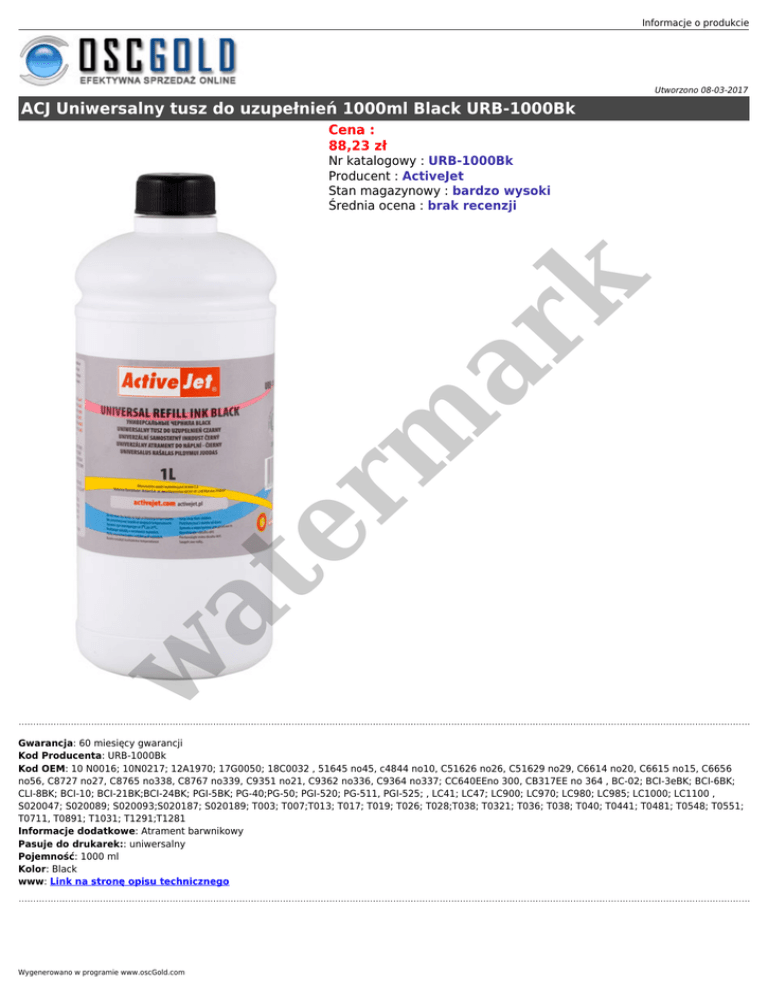 Informacje o produkcie Utworzono 08-03-2017 ACJ Uniwersalny tusz do uzupełnień 1000ml Black URB-1000Bk Cena : 88,23 zł w at er m ar k Nr katalogowy : URB-1000Bk Producent : ActiveJet Stan magazynowy : bardzo wysoki Średnia ocena : brak recenzji Gwarancja: 60 miesięcy gwarancji Kod Producenta: URB-1000Bk Kod OEM: 10 N0016; 10N0217; 12A1970; 17G0050; 18C0032 , 51645 no45, c4844 no10, C51626 no26, C51629 no29, C6614 no20, C6615 no15, C6656 no56, C8727 no27, C8765 no338, C8767 no339, C9351 no21, C9362 no336, C9364 no337; CC640EEno 300, CB317EE no 364 , BC-02; BCI-3eBK; BCI-6BK; CLI-8BK; BCI-10; BCI-21BK;BCI-24BK; PGI-5BK; PG-40;PG-50; PGI-520; PG-511, PGI-525; , LC41; LC47; LC900; LC970; LC980; LC985; LC1000; LC1100 , S020047; S020089; S020093;S020187; S020189; T003; T007;T013; T017; T019; T026; T028;T038; T0321; T036; T038; T040; T0441; T0481; T0548; T0551; T0711, T0891; T1031; T1291;T1281 Informacje dodatkowe: Atrament barwnikowy Pasuje do drukarek:: uniwersalny Pojemność: 1000 ml Kolor: Black www: Link na stronę opisu technicznego Wygenerowano w programie www.oscGold.com