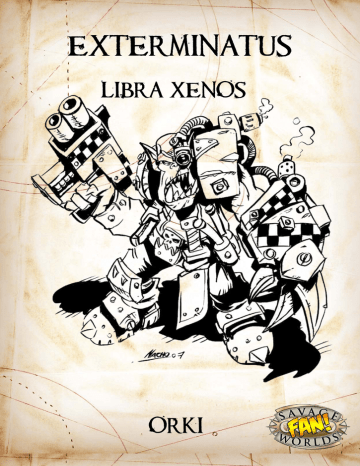 EXTERMINATUS LIBRA XENOS ORKI Wypiski z archiwum Ordo Xenos udostępnione za zgodą (tajne) Poniższe notatki stanowią zbiór spostrzeżeń na temat różnych zazwyczaj wrogich Ludzkości Xeno. Zbiór ma charakter dość chaotyczny z uwagi na niemożność usystematyzowania źródeł i stylu w czasie jaki przydzielono do utworzenia poniższej kompilacji. Nadmienić należy , iż poniższe teksty poddane zostały tylko pobieżnej, dwuetapowej cenzurze. "Te słowa piszem ja Grzdyl - albowiem pisać umiem. I jeszcze te dobre ludzie z Imkfiz.. inkzfi.. no te w płaszczach z kapturami powiedzieli że jak napiszem wszystko co wiem to przestaną mnie kopać prundem i wbijać igły w (cenz.) i (cenz.) Tedy piszem. Orki som jakie som i każden widzi. Że som duże i zielone i śmierdzom. Ale mało kto wie, że ich społe...Że sa one nie takie proste. bo tak taki zwykły ork co go wołają chopak, albo chłopek to wygląda tak: Ork Cechy: Duch k4, Siła k10, Spryt k4, Wigor k8, Zręczność k6 Umiejętności: Odwaga k10, Spostrzegawczość k4, Strzelanie k4, Walka k8, , Zastraszanie k6, Charyzma: he? ; Tempo: 6; Obrona: 6; Wytrzymałość: 9 Zawady: Krwiożerczy, Wredny, Chojrak, Tępak , Analfabeta Zalety: Infrawizja - orki otrzymują połowę kary za walkę w ciemnościach (przeciwko żywym przeciwnikom), Końskie Zdrowie Taki chopak to jak widzita niczego się specjalnie nie boja, za mundry nie jest ale silny jak cholera i jak przypieprzy to bedzieta lecieć aż do dnia gdy wasz Imperator z Trunu zstąpi. Orki za bystre nie są i wzrok maja taki trochę do dupy. To i strzelanie im nie idzie. Ale strzelać lubiają bo głośno, dymi i śmierdzi. Tedy takiemu chopakowi zazwyczaj dają po pierwsze Masakrowni2 ce (siła+ k8) to je taki wielki tasak co to jak cie nie zabije to i tak tężca złapiesz. Do drugiej łapy dostaje albo drugą Maskrownicę, albo Lutlampę , coby wrogów z bliska piec (zasięg: 1/2/4; obrażenia: 2k6+2), albo jak go Szefu lubia - Szczelbe (zasięg: 10/20/40; obrażenia: 2k8). Szczelba to je taka jak ludziowy mały bolter broń i tak samo mocna jeno czasem (test przed strzałem rzuć k10 na 1 broń rozrywa sie w rekach i zadaje strzelcowi 1k4 ran) to wybucha i zazwyczaj łapę urywa. Bywa że razem ze łbem. Zbroi chopak nie nasza bo i po co. Jeszcze by pomyśleli że cykor Zupełnie inna para butków to Szefy. Szefy to duże, mundre orki. Szefu Cechy: Duch k6, Siła k10, Spryt k6, Wigor k10, Zręczność k6 Umiejętności: Odwaga k10, Spostrzegawczość k6, Strzelanie k6, Walka k10, , Zastraszanie k8, Charyzma: 6 ; Tempo: 6; Obrona: 6; Wytrzymałość: 10 Zawady: Krwiożerczy, Wredny, Zalety: Infrawizja - orki otrzymują połowę kary za walkę w ciemnościach (przeciwko żywym przeciwnikom) ,Końskie Zdrowie, Zamaszyste Cięcie, wybrana zaleta dowódcza. Szefy czasem noszą się w kumbinowanych zbrojach (+2 P korpus, łeb, ręce) a czasem nawet w zmajstrowanych przez mekaniaka elektrozbrojach takich jak te wasze kosmiczne chopaki. No może trochem bardziej fikuśnych i powolnych ale zawsze (PP+8, ruch 1+3 do Siły ) Taki Szefu jak nie ma zbroicy to biega z Zembatym Toporcem (siła +k12) i wymachuje Spluwom (zasięg: (zasięg: 15/30/45; obrażenia: 2k10 PP-3). To taki nasz bolter jeno ładniejszy. Za to w zbroicach to Szefy zazwyczaj mają albo Rozdziera3 cze (siła+k10, 2 ataki) to som takie wielgachne pazury z prundem. Albo majstujom se tam Wielkom Spluwę (20/40/80 3k10 pp4 Automat) , albo Ognioruchacza (wzornik - stożek, 2d10+2 50% na zapalenie celu ) co to zionie ogniem jak Dywalijska Larwa. Albo i jedno i drugie. No ale poza Szefani i chopakami jest jeszcze kupa inkszych takich jak Pancerwały i Szczelce które są kepsze w Strzelaniu (k6) niż chopaki ale poza tym się nie różnią. Pancerwały to tachają ze sobom te ichnie Rakity , co to z nich jak Gog da można i tankietke rozpierniczyć (24/48/96 4k10 PP20 Broń ciężka). Szczelce to majom jeno takie Spluwy jak Szefu , ino nie pomalowane tak fikuśnie i im się tyle trofeów i cudeńków nie dynda. No som jeszcze Szturmiacze. Te za cholere strzelać nie potrafiom ale w papę dać - poezja (Statystyki orka ze zmianami : Zręczność k8. Zaleta Berserk, walka wręcz k8 Umiejętność Podwójne Uderzenie,) Szturmiacze owe, powiadam, do pleców troczą takowe niby rakity co to je Skikami nazywają i dzięki nim raz na jakiś czas mogą przeskiknąć kawał drogi i na łeb przeciwnikowi spaść i w locie z dupy nogi powyrywać. (Plecaki skokowe raz na 4 tury mogą wykonać skok o 20 cm (lub mniejszy) , należy wtedy rzucić k8, naturalna 1 oznacza że przy starcie rokita eksplodowała zabijając Szturmiacza a innym osobom w promieniu wybuch zadając straty zgodnie z charakterystyką granatu zaczepnego).Szturmiacze czasem mają ze sobą Lutlampy ale woleją w każdom łapę wziąść Wyrwiflakę(siła +k8).To jest taka pokręcona ni to szabla ni to toporzysko. Dobry Szturmiacz to potrafi i dwa razy na turę po łbie zdzielić. 4 A tera trza o najważniejszych wśród orków powiedzieć. My gobliny som krwiom i ciałem orkowskiego Whaaagh! Bywa że dosłownie. A taki goblin to nie byle co: (Goblin) Cechy: Duch k4, Siła k4, Spryt k4, Wigor k4, Zręczność k6 Umiejętności: Odwaga k2 , Spostrzegawczość k8, Walka k4, Strzelanie k4 Charyzma: -10; Tempo: 7; Obrona: 4; Wytrzymałość: 4 Zawady: Krwiożerczy, Wredny, Konus Zalety: Infrawizja Sprzęt: Majcher (Si), to co się uda podnieść na polu walki Ze co? Że do dupy?! Bywa! Ale co począć nie każdy może być Wielki Szefu. O! na Magoga zapomniałem o Wielkim Szefu. Ale bymi dał!. Więc tak... nasz Wielki Szefu nazywa się Szrama Na Ryju. Czemu? Bo ma szramę .Na ryju. Wielki Szefu Szrama Na Ryju (- Figura - 4 rany) Cechy: Duch k8, Siła k12, Spryt k10, Wigor k12, Zręczność k8 Umiejętności: Odwaga k12, Spostrzegawczość k8, Strzelanie k8, Walka k12, , Zastraszanie k12, Charyzma: 10 ; Tempo: 5; Obrona: 8; Wytrzymałość: 12 Zawady: Krwiożerczy, Wredn