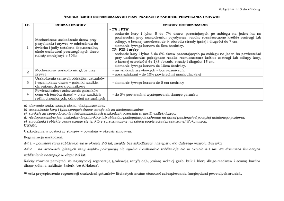 Załącznik nr 3 do Umowy TABELA SZKÓD DOPUSZCZALNYCH PRZY PRACACH Z ZAKRESU POZYSKANIA I ZRYWKI LP. 1 2 3 4 RODZAJ SZKODY Mechaniczne uszkodzenie drzew przy pozyskaniu i zrywce (w odniesieniu do świerka i jodły ustaloną dopuszczalną skalę uszkodzeń poszczególnych drzew należy zmniejszyć o 50%) Mechaniczne uszkodzenie gleby przy zrywce Uszkodzenia cennych obiektów, gatunków i egzemplarzy drzew – gatunki rzadkie, chronione, drzewa pomnikowe Powierzchniowe zniszczenia gatunków cennych (oprócz drzew) – płaty rzadkich roślin chronionych, odnowień naturalnych SZKODY DOPUSZCZALNE - TW i PTW obdarcie kory i łyka: 5 do 7% drzew pozostających po zabiegu na jeden ha na powierzchni przy uszkodzeniu: pojedyncze, rzadko rozmieszczone krótkie zestrugi lub odłupy, o łącznej szerokości do ¼ obwodu strzały (pnia) i długości do 7 cm; złamanie żywego konara do 5cm średnicy. - TP, PTP i zręby obdarcie kory i łyka: 6 do 8% drzew pozostających po zabiegu na jeden ha powierzchni przy uszkodzeniu: pojedyncze rzadko rozmieszczone krótkie zestrugi lub odłupy kory, o łącznej szerokości do 1/3 obwodu strzały i długości 15 cm; złamanie żywego konara do 10cm średnicy. na szlakach zrywkowych – bez ograniczeń; poza szlakami – do 10% powierzchni manipulacyjnej złamanie żywego konara do 5 cm średnicy do 5% powierzchni występowania danego gatunku a) złamanie czuba uznaje się za niedopuszczalne; b) uszkodzenie kory i łyka cennych drzew uznaje się za niedopuszczalne; c) sankcje za spowodowanie niedopuszczalnych uszkodzeń pozostają w gestii nadleśniczego; d) niedopuszczalne jest uszkodzenie gatunków lub obiektów podlegających ochronie na danej powierzchni powyżej ustalonego poziomu; e) za gatunki i obiekty cenne uznaje się te, które są zaznaczone na szkicu powierzchni przekazanej Wykonawcy. UWAGI: Uszkodzenia w postaci ze strugów – powstają w okresie zimowym. Regeneracja uszkodzeń: Ad.1. – powstałe rany zabliźniają się w okresie 2-3 lat, zwykle bez szkodliwych następstw dla dalszego rozwoju drzewka. Ad.2. – na drzewach iglastych rany szybko pokrywają się żywicą i całkowicie zabliźniają się w okresie 3-4 lat. Na drzewach liściastych zabliźnienie następuje w ciągu 2-3 lat. Należy również pamiętać, że najszybciej regenerują („zalewają rany”) dąb, jesion; wolniej grab, buk i klon; długo-modrzew i sosna; bardzo długo-jodła; a najdłużej świerk (wg A.Habera). W celu przyspieszenia regeneracji uszkodzeń gatunków liściastych można stosować zabezpieczania fungicydami powstałych zranień.