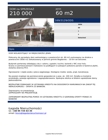 Jenin DOM na SPRZEDAŻ 60 m2 210 000 169/3129/ODS 3056 60 1 2 Detached Opis DOM WOLNOSTOJĄCY W MIEJSCOWOŚCI JENIN. Polecamy do sprzedaży dom wolnostojący o powierzchni ok. 60 m2 usytuowany na działce o powierzchni 3056 m2 zlokalizowany w Jeninie gminie Bogdaniec – 10 km od Gorzowa. Budynek parterowy składający się z: salonu, sypialni, kuchni, łazienki z WC oraz holu. Ściany w pomieszczeniach malowane na podłogach w pokojach położono panele w łazience płytki, stolarka okienna PCV. Ogrzewanie i ciepła woda z pieca węglowego. Dostępne media: woda, prąd, kanalizacja. Na posesji znajduje się pomieszczenie gospodarcze o pow. ok. 100 m2. Działka w kształcie prostokąta, posesja ogrodzona i zagospodarowana. Spokojna okolica w bliskim sąsiedztwie domy jednorodzinne. BEZPŁATNIE POMAGAMY W UZYSKANIU KREDYTU NA DOGODNYCH WARUNKACH NA ZAKUP TEJ NIERUCHOMOŚCI - OFERTA 25 BANKÓW. Zapraszamy na prezentację. ZAPRASZAMY NA PREZENTACJĘ ZAPEWNIAMY BEZPŁATNĄ POMOC W UZYSKANIU KREDYTU Z SZEROKIEJ OFERTY PONAD 25 BANKÓW Łagoda Nieruchomości tel. +48 95 725 63 35 email: [email protected] Łagoda Nieruchomości Powered by TCPDF (www.tcpdf.org)