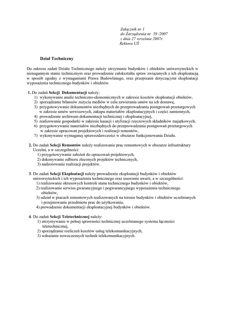 Załącznik nr 1 do Zarządzenia nr 59 /2007 z dnia 27 września 2007r. Rektora UŚ Dział Techniczny Do zakresu zadań Działu Technicznego naleŜy utrzymanie budynków i obiektów uniwersyteckich w nienagannym stanie technicznym oraz prowadzenie całokształtu spraw związanych z ich eksploatacją w sposób zgodny z wymaganiami Prawa Budowlanego, oraz przepisami dotyczącymi eksploatacji wyposaŜenia technicznego budynków i obiektów. 1. Do zadań Sekcji Dokumentacji naleŜy: 1) wykonywanie analiz techniczno-ekonomicznych w zakresie kosztów eksploatacji obiektów, 2) sporządzanie bilansów zuŜycia mediów w celu zawierania umów na ich dostawę, 3) przygotowywanie dokumentów niezbędnych do przeprowadzania postępowań przetargowych w zakresie umów serwisowych, zakupu materiałów eksploatacyjnych i części zamiennych, 4) prowadzenie archiwum dokumentacji technicznej i eksploatacyjnej, 5) realizowanie gospodarki w zakresie kasacji i utylizacji rzeczowych składników majątkowych, 6) przygotowywanie materiałów niezbędnych do przeprowadzania postępowań przetargowych w zakresie opracowań projektowych i realizacji remontów, 7) wykonywanie wymaganej sprawozdawczości w obszarze funkcjonowania Działu. 2. Do zadań Sekcji Remontów naleŜy realizowanie prac remontowych w obszarze infrastruktury Uczelni, a w szczególności: 1) przygotowywanie załoŜeń do opracowań projektowych, 2) dokonywanie odbioru zleconych projektów technicznych, 3) nadzorowanie realizacji projektów. 3. Do zadań Sekcji Eksploatacji naleŜy prowadzenie eksploatacji budynków i obiektów uniwersyteckich i ich wyposaŜenia technicznego oraz usuwanie awarii, a w szczególności: 1) realizowanie okresowych kontroli stanu technicznego budynków i obiektów, 2) realizowanie serwisu gwarancyjnego i pogwarancyjnego wyposaŜenia technicznego obiektów, 3) udział w pracach remontowych realizowanych na terenie budynków i obiektów uczelnianych i przejmowanie przedmiotu prac do uŜytkowania, 4) prowadzenie dokumentacji eksploatacyjnej budynków i obiektów. 4. Do zadań Sekcji Teletechnicznej naleŜy: 1) utrzymywanie w pełnej sprawności technicznej uczelnianego systemu łączności teletechnicznej, 2) sporządzanie rozliczeń kosztów usług telekomunikacyjnych, 3) wdraŜanie nowoczesnych technik telekomunikacyjnych.
