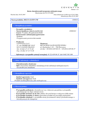 Strona 1 z 6 Karta charakterystyki preparatu niebezpiecznego Stosowane do 91/155 EEC Wydruk dnia 28.05.2007 Data dokumentu źródłowego 02.02.2004 Aktualizacja dnia 05.05.2007 Nazwa produktu: DELTA SATIN FM 850010 1. Identyfikacja produktu: − − − − Szczegóły o produkcie: Nazwa handlowa: DELTA SATIN FM Użycie: Produkty dla galwanotechniki Zastosowanie substancji/przygotowanie: Dodatek Przygotowanie powierzchni metalu − Producent: COVENTYA S.A.S 51, rue PIERRE-BP 310 F 92111 CLICHY-FRANCE Tel: 33 (0)1 47 15 73 48 Fax: 33 (0)1 47 15 73 49 850010/2 Dostawca: BETACHEM GALWANOTECHNIKA ul. Duchnicka 3, 01 – 796 Warszawa tel./fax:+48 (022) 639 86 35; +48 (022) 639 86 37 − Informacje w przypadku sytuacji awaryjnej: (0 22) 639 86 35 lub 0 602 583 308 2. Skład / informacja o składnikach: − Charakterystyka chemiczna: − Opis: mieszanina składników nienależących do substancji niebezpiecznych z nieszkodliwymi dodatkami. 3. Identyfikacja zagrożeń: − Symbol zagrożenia: brak − Symbole ostrzegawcze: brak Produkt niesklasyfikowany jako niebezpieczny. 4. Pierwsza pomoc: − W przypadku połknięcia: skontaktować się z lekarzem specjalistą w przypadku utrzymującego się złego samopoczucia. − W przypadku dostania się do oka: płukać oko pod bieżąca wodą przez kilka minut. − W przypadku kontaktu ze skórą: generalnie produkt nie powoduje podrażnień. − W przypadku inhalacji: w przypadku utraty przytomności ułożyć poszkodowanego w bocznej pozycji do transportu. Strona 2 z 6 Karta charakterystyki preparatu niebezpiecznego Stosowane do 91/155 EEC Wydruk dnia 28.05.2007 Data dokumentu źródłowego 02.02.2004 Aktualizacja dnia 05.05.2007 Nazwa produktu: DELTA SATIN FM 850010 5. Postępowanie w przypadku pożaru: − Odpowiednie środki gaśnicze: CO2, proszek gaśniczy lub natryskiem wody. Większy pożar gasić natryskiem wody lub pianą gaśniczą odporną na działanie alkoholu. − Szczególne zagrożenia: brak. − Środki ochrony indywidualnej dla strażaków: niewymagane. − Inne informacje: chłodzić zbiorniki znajdujące się w pobliżu przez spryskiwanie dużą ilością wody. 6. Postępowanie w przypadku uwolnienia do środowiska: − Osobiste środki ostrożności: założyć ubranie ochronne. Ewakuować z obszaru zagrożenia personel nieuczestniczący w akcji ratowniczej. − Metody oczyszczania: zaabsorbować przy pomocy piasku, trocin lub ziemi. − Ekologiczne środki ostrożności: rozcieńczyć dużą ilością wody. − Inne informacje: brak. 7. Obchodzenie się z preparatem i przechowywanie: − Postępowanie z preparatem: chronić przed nagrzaniem. − Przechowywanie: magazynować w chłodnym miejscu. 8. Kontrola narażenia i środki ochrony indywidualnej: − Standardy narażenia w miejscu pracy: produkt nie zawiera znaczących ilości materiałów, których wartości graniczne musiałyby być kontrolowane pod kątem zgodności z przepisami ochrony pracy. − Ogólne zasady BHP: zwykłe środki ostrożności przy obchodzeniu się z chemikaliami. − Środki ochrony indywidualnej Ochrona dróg oddechowych: niewymagana w przypadku sprawnej wentylacji w pomieszczeniach Ochrona rąk: rękawice ochronne z bawełnianą wkładką antyalergiczną od wewnątrz Materiał, z jakiego są wykonane rękawice powinien być nieprzepuszczalny dla preparatu i odporny na jego działanie. Ze względu na brak badań, nie można udzielić żadnych zaleceń, co do materiału na rękawice odpowiednie dla preparatu. Dobór materiału rękawic pod względem czasu penetracji, szybkości dyfuzji i degradacji. Materiał rękawic: wybór odpowiednich rękawic zależy nie tylko od materiału, ale również od dalszych cech jakościowych wykonania i zmienia się od producenta do producenta. Ponieważ produkt jest preparatem złożonym z kilku substancji, odporności preparatu nie Strona 3 z 6 Karta charakterystyki preparatu niebezpiecznego Stosowane do 91/155 EEC Wydruk dnia 28.05.2007 Data dokumentu źródłowego 02.02.2004 Aktualizacja dnia 05.05.2007 Nazwa produktu: DELTA SATIN FM 850010 da się wyliczyć „z góry” i dlatego należy ją sprawdzić przed zastosowaniem. Czas penetracji materiału rękawic: dokładny czas przebicia powinien być wyznaczony przez producenta rękawic ochronnych i powinien być przestrzegany przez użytkownika. Ochrona oczu: okulary ochronne z osłoną boczną Ochrona ciała: pracować w odzieży ochronnej 9. Właściwości fizykochemiczne: − − − − − − − − − − − − − − − − Postać: płynna Zapach: charakterystyczny Barwa: bezbarwny Temperatura wrzenia: 100 ºC Temperatura topnienia: 0 ºC Punkt zapłonu: nieokreślony Samozapłon: brak Niebezpieczeństwo wybuchu: produkt nie stwarza szczególnego zagrożenia wybuchowego. Prężność par w 20 ºC: 23hPa Gęstość w 20 ºC: 0,980 – 1,050g/cm3 Rozpuszczalność w wodzie: całkowita Wartość pH w 20 ºC: 6 - 7 Skład roztworu: Rozpuszczalniki organiczne: 0,0 % Woda: 96,6 % Sucha masa: 7,0% 10. Stabilność i reaktywność: − Warunki, których należy unikać: rozkład nie występuje, jeśli produkt jest magazynowany i używany zgodnie z wymaganiami technicznymi. − Materiały, których należy unikać: nie są znane. − Niebezpieczne produkty rozkładu: nie są znane. Strona 4 z 6 Karta charakterystyki preparatu niebezpiecznego Stosowane do 91/155 EEC Wydruk dnia 28.05.2007 Data dokumentu źródłowego 02.02.2004 Aktualizacja dnia 05.05.2007 Nazwa produktu: DELTA SATIN FM 850010 11. Informacje toksykologiczne: − Toksyczność ostra: − Pierwotne działanie drażniące: na skórę: nie działa drażniąco na skórę na oczy: nie działa drażniąco na oczy − Uczulenie: żadne działanie uczulające nie jest znane. − Dodatkowe informacje toksykologiczne: Produkt został sklasyfikowany wg ostatniego wydania wytycznych UE oraz Rozporządzenia MZ z dnia 29.10.2004r. (Dz.U.Nr.243, poz.2440) w sprawie kryteriów i sposobu klasyfikacji substancji i