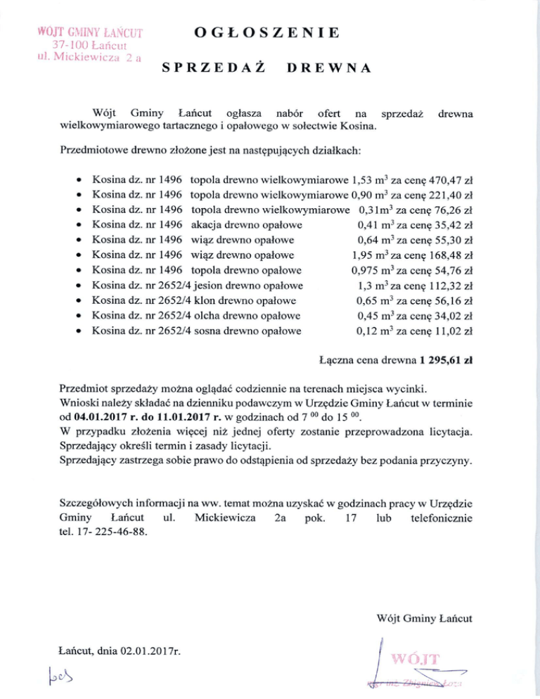 WÓJT GMINY ŁAŃCUT OGŁOSZENIE 37-100 Łańcut ul. Mickiewicza 2 a SPRZEDAŻ DREWNA Wójt Gminy Łańcut ogłasza nabór ofert na sprzedaż wielkowymiarowego tartacznego i opałowego w sołectwie Kosina. drewna Przedmiotowe drewno złożone jest na następujących działkach: dz. nr dz. nr dz. nr dz. nr dz. nr 1496 1496 1496 1496 1496 3 • • • • • Kosina Kosina Kosina Kosina Kosina topola drewno wielkowymiarowe 1,53 m za cenę 470,47 zł topola drewno wielkowymiarowe 0,90 m za cenę 221,40 zł topola drewno wielkowymiarowe 0,3 l m za cenę 76,26 zł akacja drewno opałowe 0,41 m za cenę 35,42 zł wiąz drewno opałowe 0,64 m za cenę 55,30 zł • Kosina dz. nr 1496 wiąz drewno opałowe 1,95 m za cenę 168,48 zł • Kosina dz. nr 1496 topola drewno opałowe 0,975 m za cenę 54,76 zł • Kosina dz. nr 2652/4 jesion drewno opałowe 1,3 m za cenę 112,32 zł • • Kosina dz. nr 2652/4 klon drewno opałowe Kosina dz. nr 2652/4 olcha drewno opałowe 0,65 m za cenę 56,16 zł 0,45 m za cenę 34,02 zł • Kosina dz. nr 2652/4 sosna drewno opałowe 0,12 m za cenę 11,02 zł 3 3 3 3 3 3 3 3 3 3 Łączna cena drewna 1 295,61 zł Przedmiot sprzedaży można oglądać codziennie na terenach miejsca wycinki. Wnioski należy składać na dzienniku podawczym w Urzędzie Gminy Łańcut w terminie od 04.01.2017 r. do 11.01.2017 r. w godzinach od 7 do 15 . W przypadku złożenia więcej niż jednej oferty zostanie przeprowadzona licytacja. Sprzedający określi termin i zasady licytacji. 0 0 0 0 Sprzedający zastrzega sobie prawo do odstąpienia od sprzedaży bez podania przyczyny. Szczegółowych informacji na ww. temat można uzyskać w godzinach pracy w Urzędzie Gminy Łańcut ul. Mickiewicza 2a pok. 17 lub telefonicznie tel. 17- 225-46-88. Wójt Gminy Łańcut Łańcut, dnia 02.01.2017r.