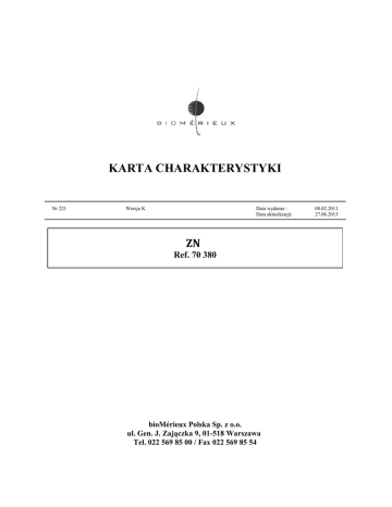 KARTA CHARAKTERYSTYKI Nr 221 Wersja K Data wydania : Data aktualizacji: ZN Ref. 70 380 bioMérieux Polska Sp. z o.o. ul. Gen. J. Zajączka 9, 01-518 Warszawa Tel. 022 569 85 00 / Fax 022 569 85 54 08.02.2011 27.06.2013 Karta Charakterystyki Ref. 70 380 1. Identyfikacja substancji: Identyfikacja producenta i dystrybutora 1.1. Identyfikator produktu: Nazwa: ZN Kod: 70 380 1.2. Istotne zidentyfikowane zastosowanie substancji oraz zastosowanie odradzane: Diagnostyka laboratoryjna – badania in-vitro. 1.3. Dane dotyczące dostawcy karty charakterystyki: Producent: BioMérieux sa, Chemin de l’Orme 69280 Marcy l’Etoile, Francja Tel.: 04 78 87 20 00 fax: 04 78 87 20 72 Dystrybutor: BioMérieux Polska Sp. z o.o. ul. Gen. J. Zajączka 9 01-518 Warszawa tel.: 022 569 85 00 fax: 022 569 85 54 Osoba odpowiedzialna: Jędrzej Pawłowski; [email protected] 1.4. Numer telefonu alarmowego tel: (22) 569 85 00, czynny w godz. 9:00 – 16:00 Data wykonania karty: 08.02.2011 r. Data aktualizacji karty: 27.06.2013 r. 2. Identyfikacja zagroŜeń 2.1. Klasyfikacja substancji: Klasyfikacja z tabelą 3.1 załącznika VI do Rozporządzenia Parlamentu Europejskiego i Rady (WE) nr 1272/2008 (rozporządzenie GHS) z uwzględnieniem 30 i 31 ATP do 67/548/EEC oraz na podstawie danych dostarczonych przez producenta: Ostre zagroŜenie dla środowiska wodnego (Kategoria 1): H400 Przewlekłe (długotrwałe) zagroŜenie dla środowiska wodnego (Kategoria 1): H410 Klasyfikacja z tabelą 3.2 załącznika VI do Rozporządzenia Parlamentu Europejskiego i Rady (WE) nr 1272/2008 (rozporządzenie GHS) z uwzględnieniem 30 i 31 ATP do 67/548/EEC oraz na podstawie danych dostarczonych przez producenta: N: R50/32 2.2. Elementy oznakowania: Cynk(proszek stabilizowany); Zinc (dust stabilised) (030-001-00-1) Hasło ostrzegawcze: Niebezpieczeństwo Piktogramy GHS: Wersja K 27.06.2013 Strona 2/11 Karta Charakterystyki Ref. 70 380 GHS09 Zwroty wskazujące rodzaj zagroŜenia: H400 Działa bardzo toksycznie na organizmy wodne H410 Działa bardzo toksycznie na organizmy wodne, powodując długotrwałe skutki Zwroty wskazujące środki ostroŜności: P273 Unikać uwolnienia do środowiska P391 Zebrać wyciek P501 Pojemnik i jego zawartość utylizować zgodnie z przepisami lokalnymi, regionalnymi, krajowymi lub międzynarodowymi 2.3. Inne zagroŜenia: Brak. Brzmienie uŜytych zwrotów – patrz p. 16. 3. Skład/informacja o składnikach 3.1. Substancje: Cynk (proszek stabilizowany) Nr Indeksowy: 030-001-00-1 Nr CAS: 7440-66-6 Nr WE: 231-175-3 3.2. Mieszaniny: Nie dotyczy. 4. Środki pierwszej pomocy 4.1. Opis środków pierwszej pomocy: 4.1.1 Wytyczne dotyczące pierwszej pomocy wg istotnych dróg naraŜenia: Kartę Charakterystyki okazać lekarzowi udzielającemu pomocy. W przypadku naraŜenia na pary i aerozole produktu osobę poszkodowaną przenieść do dobrze wentylowanego pomieszczenia zwrócić się o pomoc lekarską a) drogi oddechowe: osobę poszkodowaną natychmiast przenieść do dobrze wentylowanego pomieszczenia; osobę poszkodowaną umieścić w pozycji półleŜącej, rozluźnić ubranie, upewnić się czy w ustach osoby poszkodowanej nie zalegają przedmioty lub wydzielina utrudniające oddychanie; jęli poszkodowany nie oddycha – wykonać sztuczne oddychanie; niezwłocznie zwrócić się o pomoc lekarską. b) skóra: zdjąć zanieczyszczone ubranie; zabrudzoną skórę przemyć duŜą ilością wody z mydłem; do mycia skóry nie uŜywać Ŝadnych rozpuszczalników ani rozcieńczalników; po oczyszczeniu posmarować maścią borną lub zwilŜyć 6% roztworem taniny; jeŜeli wystąpi podraŜnienie skóry – skonsultować z lekarzem. c) oczy: zanieczyszczone oczy płukać, przy otwartych powiekach, ciągłym strumieniem bieŜącej Wersja K 27.06.2013 Strona 3/11 Karta Charakterystyki Ref. 70 380 wody przez 10 ÷ 15 minut; unikać silnego strumienia wody, który moŜe stworzyć ryzyko uszkodzenia rogówki; w przypadku utrzymującego się pieczenia lub podraŜnienia skonsultować się z lekarzem; nie uŜywać Ŝadnych płynów do przemywania oczu ani Ŝadnych maści przed konsultacją lekarską; w przypadku, gdy osoba poszkodowana nosi szkła kontaktowe zdjąć je, jeŜeli to moŜliwe; zwrócić się o pomoc lekarską jeŜeli wystąpi podraŜnienie oczu. d) przewód pokarmowy: wypłukać usta duŜą ilością bieŜącej wody; jeŜeli poszkodowany jest przytomny podać do wypicia wodę w małych porcjach (ok. 0,2÷0,3l); osobie nieprzytomnej nie podawać nic do ust ; niezwłocznie skonsultować z lekarzem – pokazać lekarzowi Kartę Charakterystyki lub etykietę 4.1.2. Inne: Brak. 4.2. NajwaŜniejsze ostre i opóźnione objawy oraz skutki naraŜenia: Objawy ostre: Produkt moŜe powodować mechaniczne podraŜnienie dróg oddechowych w efekcie inhalacji (kichanie, kaszel). Produkt moŜe takŜe mechanicznie podraŜnić oczy i skórę. Połknięcie produktu moŜe wywołać problemy gastryczne (ból brzucha, mdłości, wymioty i biegunkę). 4.3. Wskazania dotyczące wszelkiej natychmiastowej pomocy lekarskiej i szczególnego postępowania z poszkodowanym: W przypadku spoŜycia większej dawki lub wystąpienia podraŜnienia oczu lub skóry - naleŜy niezwłocznie skonsultować się z lekarzem. 5. Postępowanie w przypadku poŜaru 5.1. Środki gaśnicze: a) Zalecane środki gaśnicze: Rozproszone prądy wodne, gaśnice proszkowe. b) Niezalecane środki gaśnicze: Unikać silnych prądów wodnych, które mogą rozprzestrzenić ogień. 5.2. Szczególne zagroŜenia związane z substancją: Ogrzanie, iskra lub kontakt z ogniem mogą spowodować zapłon. Wydziela toksyczne gazy w warunkach poŜaru. 5.3. Informacje dla straŜy poŜarnej: NaleŜy nosić niezaleŜny aparat do oddychania i odpowiednią odzieŜ ochronną. 6. Postępowanie w przypadku niezamierzonego uwolnienia do środowiska 6.1. Indywidualne środki ostroŜności, wyposaŜenie ochronne i procedury w sytuacjach awaryjnych: 6.1.1. Dla osób nienaleŜących do personelu udzie