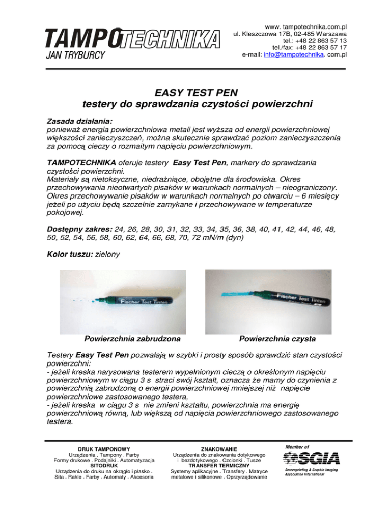 1 www. tampotechnika.com.pl ul. Kleszczowa 17B, 02-485 Warszawa tel.: +48 22 863 57 13 tel./fax: +48 22 863 57 17 e-mail: info@tampotechnika. com.pl JAN TRYBURCY EASY TEST PEN testery do sprawdzania czystości powierzchni Zasada działania: poniewaŜ energia powierzchniowa metali jest wyŜsza od energii powierzchniowej większości zanieczyszczeń, moŜna skutecznie sprawdzać poziom zanieczyszczenia za pomocą cieczy o rozmaitym napięciu powierzchniowym. TAMPOTECHNIKA oferuje testery Easy Test Pen, markery do sprawdzania czystości powierzchni. Materiały są nietoksyczne, niedraŜniące, obojętne dla środowiska. Okres przechowywania nieotwartych pisaków w warunkach normalnych – nieograniczony. Okres przechowywanie pisaków w warunkach normalnych po otwarciu – 6 miesięcy jeŜeli po uŜyciu będą szczelnie zamykane i przechowywane w temperaturze pokojowej. Dostępny zakres: 24, 26, 28, 30, 31, 32, 33, 34, 35, 36, 38, 40, 41, 42, 44, 46, 48, 50, 52, 54, 56, 58, 60, 62, 64, 66, 68, 70, 72 mN/m (dyn) Kolor tuszu: zielony Powierzchnia zabrudzona Powierzchnia czysta Testery Easy Test Pen pozwalają w szybki i prosty sposób sprawdzić stan czystości powierzchni: - jeŜeli kreska narysowana testerem wypełnionym cieczą o określonym napięciu powierzchniowym w ciągu 3 s straci swój kształt, oznacza Ŝe mamy do czynienia z powierzchnią zabrudzoną o energii powierzchniowej mniejszej niŜ napięcie powierzchniowe zastosowanego testera, - jeŜeli kreska w ciągu 3 s nie zmieni kształtu, powierzchnia ma energię powierzchniową równą, lub większą od napięcia powierzchniowego zastosowanego testera. DRUK TAMPONOWY Urządzenia . Tampony . Farby Formy drukowe . Podajniki . Automatyzacja SITODRUK Urządzenia do druku na okrągło i płasko . Sita . Rakle . Farby . Automaty . Akcesoria ZNAKOWANIE Urządzenia do znakowania dotykowego i bezdotykowego . Czcionki . Tusze TRANSFER TERMICZNY Systemy aplikacyjne . Transfery . Matryce metalowe i silikonowe . Oprzyrządowanie