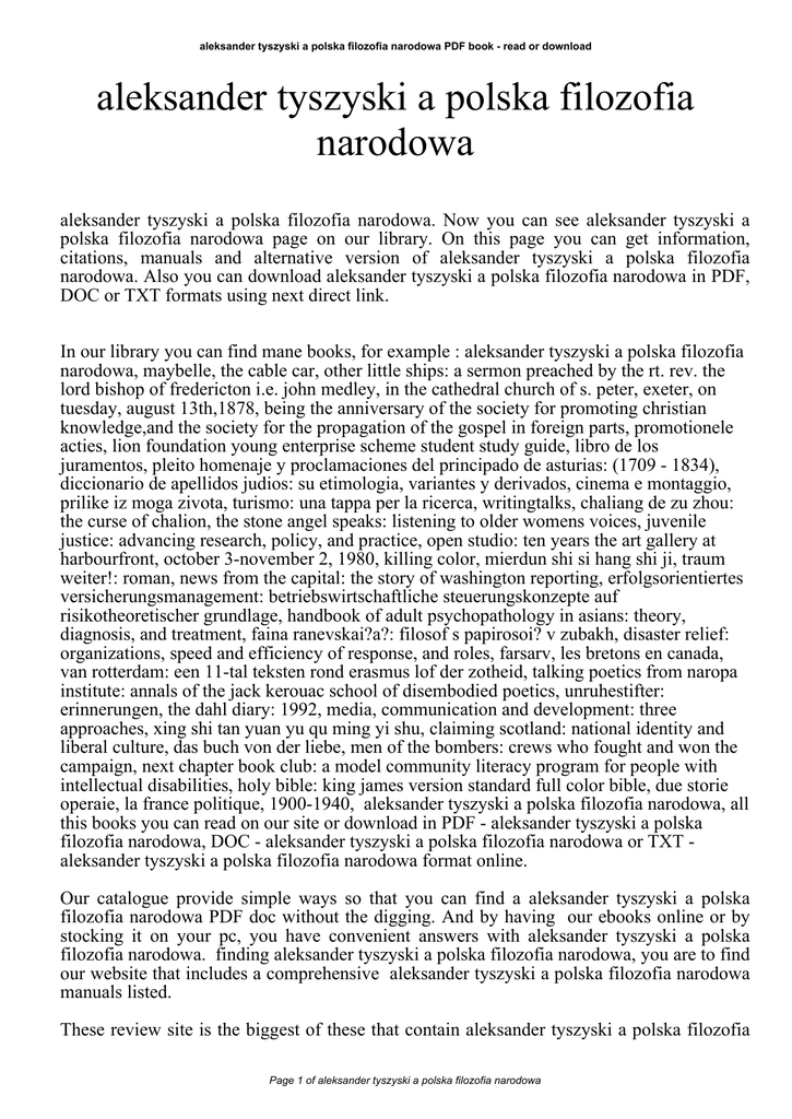aleksander tyszyski a polska filozofia narodowa PDF book - read or download aleksander tyszyski a polska filozofia narodowa aleksander tyszyski a polska filozofia narodowa. Now you can see aleksander tyszyski a polska filozofia narodowa page on our library. On this page you can get information, citations, manuals and alternative version of aleksander tyszyski a polska filozofia narodowa. Also you can download aleksander tyszyski a polska filozofia narodowa in PDF, DOC or TXT formats using next direct link. In our library you can find mane books, for example : aleksander tyszyski a polska filozofia narodowa, maybelle, the cable car, other little ships: a sermon preached by the rt. rev. the lord bishop of fredericton i.e. john medley, in the cathedral church of s. peter, exeter, on tuesday, august 13th,1878, being the anniversary of the society for promoting christian knowledge,and the society for the propagation of the gospel in foreign parts, promotionele acties, lion foundation young enterprise scheme student study guide, libro de los juramentos, pleito homenaje y proclamaciones del principado de asturias: (1709 - 1834), diccionario de apellidos judios: su etimologia, variantes y derivados, cinema e montaggio, prilike iz moga zivota, turismo: una tappa per la ricerca, writingtalks, chaliang de zu zhou: the curse of chalion, the stone angel speaks: listening to older womens voices, juvenile justice: advancing research, policy, and practice, open studio: ten years the art gallery at harbourfront, october 3-november 2, 1980, killing color, mierdun shi si hang shi ji, traum weiter!: roman, news from the capital: the story of washington reporting, erfolgsorientiertes versicherungsmanagement: betriebswirtschaftliche steuerungskonzepte auf risikotheoretischer grundlage, handbook of adult psychopathology in asians: theory, diagnosis, and treatment, faina ranevskai?a?: filosof s papirosoi? v zubakh, disaster relief: organizations, speed and efficiency of response, and roles, farsarv, les bretons en canada, van rotterdam: een 11-tal teksten rond erasmus lof der zotheid, talking poetics from naropa institute: annals of the jack kerouac school of disembodied poetics, unruhestifter: erinnerungen, the dahl diary: 1992, media, communication and development: three approaches, xing shi tan yuan yu qu ming yi shu, claiming scotland: national identity and liberal culture, das buch von der liebe, men of the bombers: crews who fought and won the campaign, next chapter book club: a model community literacy program for people with intellectual disabilities, holy bible: king james version standard full color bible, due storie operaie, la france politique, 1900-1940, aleksander tyszyski a polska filozofia narodowa, all this books you can read on our site or download in PDF - aleksander tyszyski a polska filozofia narodowa, DOC - aleksander tyszyski a polska filozofia narodowa or TXT aleksander tyszyski a polska filozofia narodowa format online. Our catalogue provide simple ways so that you can find a aleksander tyszyski a polska filozofia narodowa PDF doc without the digging. And by having our ebooks online or by stocking it on your pc, you have convenient answers with aleksander tyszyski a polska filozofia narodowa. finding aleksander tyszyski a polska filozofia narodowa, you are to find our website that includes a comprehensive aleksander tyszyski a polska filozofia narodowa manuals listed. These review site is the biggest of these that contain aleksander tyszyski a polska filozofia Page 1 of aleksander tyszyski a polska filozofia narodowa aleksander tyszyski a polska filozofia narodowa PDF book - read or download narodowa, literally hundreds of thousands of different products represented. You will see that there are specific sites catered to different product also categories or types, brands or niche categories related to aleksander tyszyski a polska filozofia narodowa. So depending on what exactly you are searching, you will be able to choose ebooks aleksander tyszyski a polska filozofia narodowa to suit your own needs, aleksander tyszyski a polska filozofia narodowa. Page 2 of aleksander tyszyski a polska filozofia narodowa