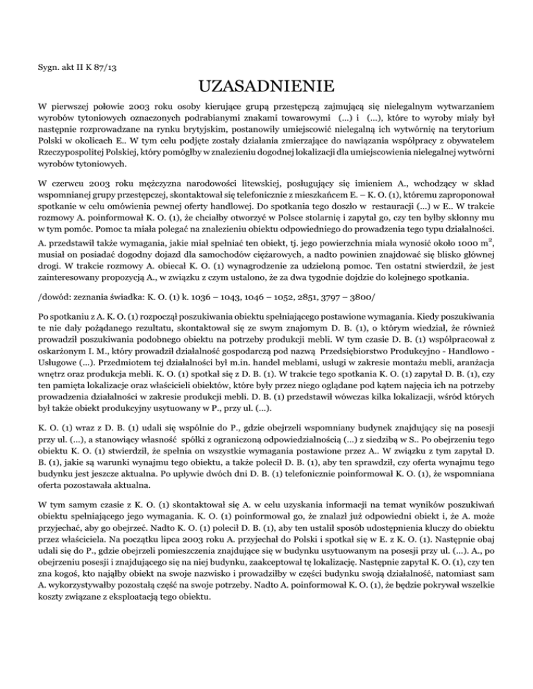 Sygn. akt II K 87/13 UZASADNIENIE W pierwszej połowie 2003 roku osoby kierujące grupą przestępczą zajmującą się nielegalnym wytwarzaniem wyrobów tytoniowych oznaczonych podrabianymi znakami towarowymi (...) i (...), które to wyroby miały był następnie rozprowadzane na rynku brytyjskim, postanowiły umiejscowić nielegalną ich wytwórnię na terytorium Polski w okolicach E.. W tym celu podjęte zostały działania zmierzające do nawiązania współpracy z obywatelem Rzeczypospolitej Polskiej, który pomógłby w znalezieniu dogodnej lokalizacji dla umiejscowienia nielegalnej wytwórni wyrobów tytoniowych. W czerwcu 2003 roku mężczyzna narodowości litewskiej, posługujący się imieniem A., wchodzący w skład wspomnianej grupy przestępczej, skontaktował się telefonicznie z mieszkańcem E. – K. O. (1), któremu zaproponował spotkanie w celu omówienia pewnej oferty handlowej. Do spotkania tego doszło w restauracji (...) w E.. W trakcie rozmowy A. poinformował K. O. (1), że chciałby otworzyć w Polsce stolarnię i zapytał go, czy ten byłby skłonny mu w tym pomóc. Pomoc ta miała polegać na znalezieniu obiektu odpowiedniego do prowadzenia tego typu działalności. A. przedstawił także wymagania, jakie miał spełniać ten obiekt, tj. jego powierzchnia miała wynosić około 1000 m2, musiał on posiadać dogodny dojazd dla samochodów ciężarowych, a nadto powinien znajdować się blisko głównej drogi. W trakcie rozmowy A. obiecał K. O. (1) wynagrodzenie za udzieloną pomoc. Ten ostatni stwierdził, że jest zainteresowany propozycją A., w związku z czym ustalono, że za dwa tygodnie dojdzie do kolejnego spotkania. /dowód: zeznania świadka: K. O. (1) k. 1036 – 1043, 1046 – 1052, 2851, 3797 – 3800/ Po spotkaniu z A. K. O. (1) rozpoczął poszukiwania obiektu spełniającego postawione wymagania. Kiedy poszukiwania te nie dały pożądanego rezultatu, skontaktował się ze swym znajomym D. B. (1), o którym wiedział, że również prowadził poszukiwania podobnego obiektu na potrzeby produkcji mebli. W tym czasie D. B. (1) współpracował z oskarżonym I. M., który prowadził działalność gospodarczą pod nazwą Przedsiębiorstwo Produkcyjno - Handlowo Usługowe (...). Przedmiotem tej działalności był m.in. handel meblami, usługi w zakresie montażu mebli, aranżacja wnętrz oraz produkcja mebli. K. O. (1) spotkał się z D. B. (1). W trakcie tego spotkania K. O. (1) zapytał D. B. (1), czy ten pamięta lokalizacje oraz właścicieli obiektów, które były przez niego oglądane pod kątem najęcia ich na potrzeby prowadzenia działalności w zakresie produkcji mebli. D. B. (1) przedstawił wówczas kilka lokalizacji, wśród których był także obiekt produkcyjny usytuowany w P., przy ul. (...). K. O. (1) wraz z D. B. (1) udali się wspólnie do P., gdzie obejrzeli wspomniany budynek znajdujący się na posesji przy ul. (...), a stanowiący własność spółki z ograniczoną odpowiedzialnością (...) z siedzibą w S.. Po obejrzeniu tego obiektu K. O. (1) stwierdził, że spełnia on wszystkie wymagania postawione przez A.. W związku z tym zapytał D. B. (1), jakie są warunki wynajmu tego obiektu, a także polecił D. B. (1), aby ten sprawdził, czy oferta wynajmu tego budynku jest jeszcze aktualna. Po upływie dwóch dni D. B. (1) telefonicznie poinformował K. O. (1), że wspomniana oferta pozostawała aktualna. W tym samym czasie z K. O. (1) skontaktował się A. w celu uzyskania informacji na temat wyników poszukiwań obiektu spełniającego jego wymagania. K. O. (1) poinformował go, że znalazł już odpowiedni obiekt i, że A. może przyjechać, aby go obejrzeć. Nadto K. O. (1) polecił D. B. (1), aby ten ustalił sposób udostępnienia kluczy do obiektu przez właściciela. Na początku lipca 2003 roku A. przyjechał do Polski i spotkał się w E. z K. O. (1). Następnie obaj udali się do P., gdzie obejrzeli pomieszczenia znajdujące się w budynku usytuowanym na posesji przy ul. (...). A., po obejrzeniu posesji i znajdującego się na niej budynku, zaakceptował tę lokalizację. Następnie zapytał K. O. (1), czy ten zna kogoś, kto nająłby obiekt na swoje nazwisko i prowadziłby w części budynku swoją działalność, natomiast sam A. wykorzystywałby pozostałą część na swoje potrzeby. Nadto A. poinformował K. O. (1), że będzie pokrywał wszelkie koszty związane z eksploatacją tego obiektu. Po tej rozmowie z A. K. O. (1) zaproponował D. B. (1), aby ten wraz ze swoim wspólnikiem, to jest oskarżonym I. M. zawarł umowę najmu obiektu usytuowanego w P., przy ul. (...). Ponadto ustalili oni, iż w części pomieszczeń prowadzona byłaby działalność gospodarcza w zakresie produkcji mebli, zaś pozostałą część obiektu wykorzystywałby A. na potrzeby swojej działalności. K. O. (1) przekazał także D. B. (1), że A. będzie ponosił wszelkie koszty związane z najmem oraz eksploatacją tych pomieszczeń. D. B. (1) wyraził zgodę na najęcie od właściciela w/w obiektu. W związku z tym, iż to oskarżony I. M. prowadził działalność gospodarczą, D. B. (1) poinformował go o ustaleniach dokonanych z K. O. (1), odnośnie wynajęcia przez nich budynku znajdującego się w P., przy ul. (...). Oskarżony I. M. wyraził zgodę na rozwiązanie zaproponowane D. B. (1) przez K. O. (1). /dowód: zeznania świadków: K. O. (1) k. 1036 – 1043, 1046 – 1052, 2851, 3797 – 3800, D. B. (1) k. 315 – 317, 491 – 495, 1098 – 1099, 1654 – 1658, 2381, 3801 – 3803, kserokopia wypisu z rejestru gruntów numer KW (...) dla działki usytuowanej w P. przy ul. (...) stanowiącej własność spółki z ograniczoną odpowiedzialnością(...) wydanego przez Starostwo Powiatowe w E., k. 1781 kserokopia zaświadczenia o wpisie do ewidencji działalności gospodarczej Przedsiębiorstwa – Produkcyjno - Handlowo – Usługowego '' M. ''I. M. z siedzibą w E. przy ul. (...) z dnia 19 lutego 2002 roku numer ewid