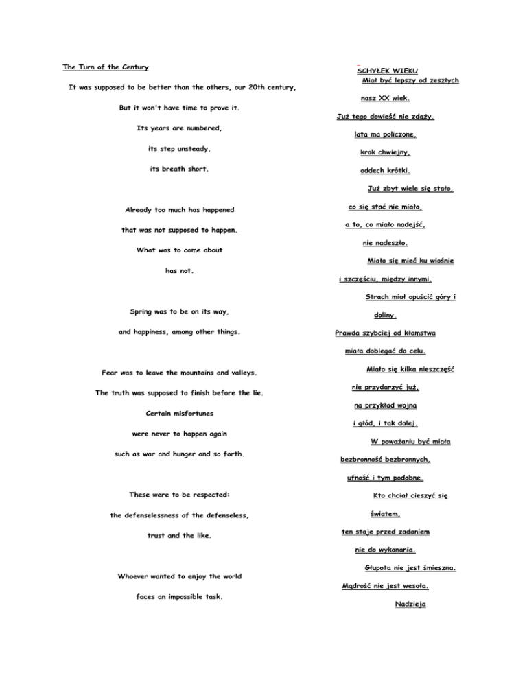 The Turn of the Century It was supposed to be better than the others, our 20th century, SCHYŁEK WIEKU Miał być lepszy od zeszłych nasz XX wiek. But it won't have time to prove it. Its years are numbered, its step unsteady, its breath short. Już tego dowieść nie zdąży, lata ma policzone, krok chwiejny, oddech krótki. Już zbyt wiele się stało, Already too much has happened that was not supposed to happen. What was to come about co się stać nie miało, a to, co miało nadejść, nie nadeszło. Miało się mieć ku wiośnie has not. i szczęściu, między innymi. Strach miał opuścić góry i Spring was to be on its way, and happiness, among other things. doliny. Prawda szybciej od kłamstwa miała dobiegać do celu. Fear was to leave the mountains and valleys. The truth was supposed to finish before the lie. Certain misfortunes Miało się kilka nieszczęść nie przydarzyć już, na przykład wojna i głód, i tak dalej. were never to happen again such as war and hunger and so forth. W poważaniu być miała bezbronność bezbronnych, ufność i tym podobne. These were to be respected: the defenselessness of the defenseless, trust and the like. Kto chciał cieszyć się światem, ten staje przed zadaniem nie do wykonania. Whoever wanted to enjoy the world Głupota nie jest śmieszna. Mądrość nie jest wesoła. faces an impossible task. Nadzieja to już nie jest ta młoda dziewczyna Stupidity is not funny. Wisdom isn't jolly. et cetera, niestety. Bóg miał nareszcie uwierzyć w człowieka dobrego i silnego, Hope Is no longer the same young girl et cetera. Alas. ale dobry i silny to ciągle jeszcze dwóch ludzi. Jak żyć - spytał mnie w liście ktoś, God was at last to believe in man: kogo ja zamierzałam spytać good and strong, o to samo. but good and strong are still two different people. Znowu i tak jak zawsze, co widać poniżej, nie ma pytań pilniejszych od pytań naiwnych. How to live--someone asked me this in a letter, someone I had wanted to ask that very thing. Again and as always, and as seen above there are no questions more urgent than the naive ones.