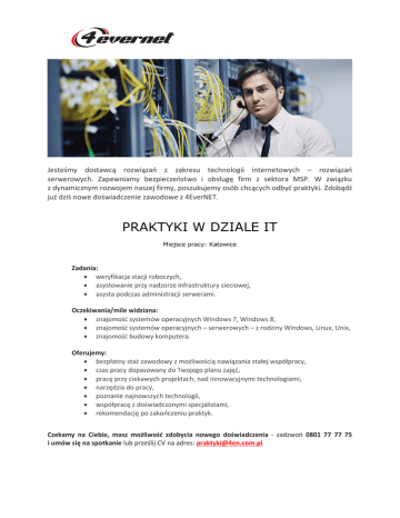 Jesteśmy dostawcą rozwiązań z zakresu technologii internetowych – rozwiązań serwerowych. Zapewniamy bezpieczeństwo i obsługę firm z sektora MSP. W związku z dynamicznym rozwojem naszej firmy, poszukujemy osób chcących odbyć praktyki. Zdobądź już dziś nowe doświadczenie zawodowe z 4EverNET. PRAKTYKI W DZIALE IT Miejsce pracy: Katowice Zadania: weryfikacja stacji roboczych, asystowanie przy nadzorze infrastruktury sieciowej, asysta podczas administracji serwerami. Oczekiwania/mile widziana: znajomość systemów operacyjnych Windows 7, Windows 8, znajomość systemów operacyjnych – serwerowych – z rodziny Windows, Linux, Unix, znajomość budowy komputera. Oferujemy: bezpłatny staż zawodowy z możliwością nawiązania stałej współpracy, czas pracy dopasowany do Twojego planu zajęć, pracę przy ciekawych projektach, nad innowacyjnymi technologiami, narzędzia do pracy, poznanie najnowszych technologii, współpracę z doświadczonymi specjalistami, rekomendację po zakończeniu praktyk. Czekamy na Ciebie, masz możliwość zdobycia nowego doświadczenia - zadzwoń 0801 77 77 75 i umów się na spotkanie lub prześlij CV na adres: [email protected] Prosimy o dodanie klauzuli: Wyrażam zgodę na przetwarzanie moich danych osobowych zawartych w ofercie pracy dla potrzeb procesu rekrutacji zgodnie z ustawą z dnia 27.08.1997 r. Dz. U. z 2002 r., Nr 101, poz. 923 ze zm.