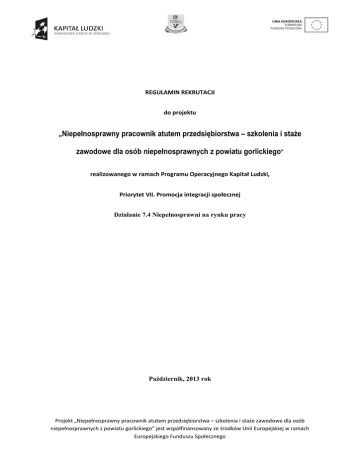 REGULAMIN REKRUTACJI do projektu „Niepełnosprawny pracownik atutem przedsiębiorstwa – szkolenia i staże zawodowe dla osób niepełnosprawnych z powiatu gorlickiego” realizowanego w ramach Programu Operacyjnego Kapitał Ludzki, Priorytet VII. Promocja integracji społecznej Działanie 7.4 Niepełnosprawni na rynku pracy Październik, 2013 rok Projekt „Niepełnosprawny pracownik atutem przedsiębiorstwa – szkolenia i staże zawodowe dla osób niepełnosprawnych z powiatu gorlickiego” jest współfinansowany ze środków Unii Europejskiej w ramach Europejskiego Funduszu Społecznego § 1. Definicje 1. Projekt - projekt „Niepełnosprawny pracownik atutem przedsiębiorstwa – szkolenia i staże zawodowe dla osób niepełnosprawnych z powiatu gorlickiego”, który jest realizowany w ramach Programu Operacyjnego Kapitał Ludzki Działanie 7.4. Niepełnosprawni na rynku pracy. Projekt współfinansowany ze środków Unii Europejskiej w ramach Europejskiego Funduszu Społecznego. 2. Beneficjent – Fundacja Pomocy Osobom Niepełnosprawnym w Stróżach, 33-331 Stróże 413 3. Instytucja Wdrażająca (Instytucja Pośrednicząca II stopnia) - Wojewódzki Urząd Pracy w Krakowie, Plac Na Stawach 1, 30-107 Kraków. 4. Uczestnik projektu – osoby niepełnosprawne (ON) (posiadające orzeczenie o niepełnosprawności) pozostające bez zatrudnienia (w tym zarejestrowane jako bezrobotne lub poszukujące pracy) zamieszkujące na terenie powiatu gorlickiego. 5. Osoba bezrobotna - oznacza osobę, o której mowa w art. 2 ust.1 pkt 2 lit. a-k ustawy z dnia 20 kwietnia 2004 r. o promocji zatrudnienia i instytucji rynku pracy (Dz. U. z 2008 r. Nr 69, poz. 415, z późn. Zm.) 6. Osoba pozostająca bez zatrudnienia – oznacza to osobę w wieku 15-64 lata niezatrudnioną, niewykonującą innej pracy zarobkowej, zdolną i gotową do podjęcia zatrudnienia lub innej pracy zarobkowej w co najmniej połowie wymiaru czasu pracy, w tym osobę zarejestrowaną we właściwym dla miejsca zamieszkania (stałego lub czasowego) Powiatowym Urzędzie Pracy jako bezrobotna, o której mowa w art. 2 ust.1 pkt 2 lit. a-k ustawy z dnia 20 kwietnia 2004 r. o promocji zatrudnienia i instytucji rynku pracy (Dz. U. z 2008 r. Nr 69, poz. 415, z późn. Zm.) 7. Osoba niepełnosprawna (ON)– niepełnosprawnymi są osoby, których stan fizyczny, psychiczny lub umysłowy trwale lub okresowo utrudnia, ogranicza bądź uniemożliwia wypełnianie ról, społecznych, a w szczególności ogranicza zdolności do wykonywania pracy zawodowej, jeżeli uzyskały orzeczenie (...) o rodzaju i stopniu niepełnosprawności (w rozumieniu ust. z dnia 27 sierpnia 1997 r. o rehabilitacji zawodowej i społecznej oraz zatrudnianiu osób niepełnosprawnych. Dz.U.97.123.776 z późn. zm.) 8. Osoba zamieszkująca na obszarze wiejskim- osoba zamieszkująca /zameldowana lub zamieszkująca/ w gminie wiejskiej ,wiejsko-miejskiej lub mieście do 25 tys. mieszkańców Projekt „Niepełnosprawny pracownik atutem przedsiębiorstwa – szkolenia i staże zawodowe dla osób niepełnosprawnych z powiatu gorlickiego” jest współfinansowany ze środków Unii Europejskiej w ramach Europejskiego Funduszu Społecznego (obszar ten należy rozumieć zgodnie z definicją GUS i jest to teren położony poza granicami administracyjnymi miast) 9. Komisja Rekrutacyjna - komisja powołana przez Kierownika Projektu w celu przeprowadzenia rekrutacji uczestników projektu. W skład Komisji wchodzą: asystent kierownika, specjalista ds. rekrutacji oraz sp. ds. monitoringu. § 2. Informacje ogólne 1. Regulamin określa proces rekrutacji uczestników do projektu "Niepełnosprawny pracownik atutem przedsiębiorstwa – szkolenia i staże zawodowe dla osób niepełnosprawnych z powiatu gorlickiego", realizowanego przez Fundację Pomocy Osobom Niepełnosprawnym w Stróżach w ramach Programu Operacyjnego Kapitał Ludzki, Działanie 7.4 Niepełnosprawni na rynku pracy. 2. Okres realizacji projektu: od 1 września 2013 do 30 czerwca 2015 roku. 3. Głównym celem projektu jest: Zwiększenie wskaźnika aktywności zawodowej, społecznej i edukacyjnej osób niepełnosprawnych z powiatu gorlickiego, poprzez szkolenia oraz podjęcie zatrudnienia przez 75% uczestników objętych projektem w okresie od 2013 do 2015r. 4. W ramach projektu przewiduje się: a) Opracowanie IPD poprzedzone analizą predyspozycji zawodowych dla 40 uczestników projektu 5 h po 45 minut: 1) „Analiza potrzeb klienta” (spotkanie indywidualne – 2 godz) 2) „Indywidualna ocena zawodowa” (spotkanie indywidualne – 2 godz) 3) „Przygotowanie IPD” (spotkanie indywidualne – 1 godz) b) Wsparcie specjalistyczne – poradnictwo psychologiczne: a. Warsztaty aktywizacyjne wyjazdowe dla uczestników projektu obejmujące: I. Blok psychologiczny (pozytywne myślenie i samoakceptacja, asertywność) II. Blok praktyczny (dokumenty aplikacyjne przy zatrudnieniu, symulacja rozmowy kwalifikacyjnej) III. Blok prawny (wybrane elementy prawa pracy, informacje o przysługujących świadczeniach dla ON) Zajęcia prowadzone w grupach 10 osobowych (4 grupy); 24 h/1 grupę, tj. przez 3 dni po 8h Projekt „Niepełnosprawny pracownik atutem przedsiębiorstwa – szkolenia i staże zawodowe dla osób niepełnosprawnych z powiatu gorlickiego” jest współfinansowany ze środków Unii Europejskiej w ramach Europejskiego Funduszu Społecznego b. Wsparcie indywidualne – zajęcia z psychologiem/doradcą zawodowym: dla uczestników projektu – 8 h , łącznie 320h. c) Program aktywizacji zawodowej: a. Szkolenia zawodowe – indywidualnie dobrane, skierowane do 30 uczestników projektu, trwać będą 6-8h dziennie, około 150h/m-c. Zajęcia odbywać się będą na terenie Powiatu Gorlickiego w miejscu dostosowanym do osób niepełnosprawnych. Każdy uczestnik otrzyma stypendium za udział w szkoleniu w wysokości nie większej niż 120% zasiłku o którym mowa w art. 72 ust.1 ustawy o promocji zatrudnienia i instytucjach r