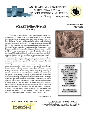 SANKTUARIUM NAJŚWIĘTSZEGO SERCA PANA JEZUSA JEZUICKI OŚRODEK MILENIJNY w Chicago www.jezuici.org 5 niedziela zwykła 8 luty 2015 odbiorcy bożego działania Mk 1, 29-39 Podczas wypełniania swej misji Jezus spotyka tłumy, które gromadzą się, by Go słuchać i doznać uzdrowienia na ciele i na duchu. Ale Pan spotyka także poszczególne osoby, które doświadczają mocy Jego działania. Pan jest wrażliwy na każdą ludzką biedę, z którą się spotyka, i porusza Go u ludzi zarówno opętanie przez demona, paraliż, jak i zwykła gorączka, taka jak ta, z powodu której cierpiała teściowa Szymona. Pan ujął ją za rękę, a gorączka ustąpiła. Kiedy stajemy przed Panem na modlitwie, to nieraz łatwiej poprosić o rozwiązanie wielkich problemów czy uzdrowienie z poważnych chorób niż po prostu powiedzieć Mu, że jest mi źle, że czuję się przygnębiony czy choćby zmęczony. Sądzimy, że nie warto Pana fatygować, zawracać Mu głowę takimi drobiazgami. A Pan chce być blisko nas, chce nas wspierać w każdym naszym utrapieniu. Czy potrafię spontanicznie mówić Panu o tym, co przeżywam, i prosić Go, aby mi pomagał, aby mnie umacniał? Znamienne jest, że Pan, po modlitwie na miejscu pustynnym, po rozmowie ze swym Ojcem wyrusza dalej w drogę, choć wielu Go szukało. Jezus poszukuje kolejne osoby, które jeszcze nie słyszały Dobrej Nowiny i nie doświadczyły miłości Boga. Czy to znaczy, że przestało Mu zależeć na tych, których już spotkał? Czy to znaczy, że ich opuścił? Żadną miarą. To znaczy, że jest czas Bożego nawiedzenia, kiedy doświadczamy intensywnie Bożego działania, i czas, w którym trzeba żyć tym nawiedzeniem, kiedy mamy dobrze używać naszej wolności, ćwiczyć się w wierności Bożym natchnieniom i wzrastać w wierze, nadziei i miłości. A Pan znowu przybędzie i udzieli nam swych kolejnych pomocy i darów. Boże działanie nie ma zwolnić nas z naszej aktywności, ale pobudzić do hojnej odpowiedzi i współpracy z Panem. Zaufanie to nie bierne poddanie. Jak przeżywam moje poddanie się Bogu? Czy nie prowadzi mnie ono do bierności i zrzucania odpowiedzialności za siebie i za życiowe decyzje? ,,ODBIERAMY COŚ BOGU, KIEDY NIEPOKOIMY SIĘ O PRZYSZŁOŚĆ. NIE DAJEMY MU WOLNEJ RĘKI I NIE POZWALAMY MU STWARZAĆ NAS TAKIMI, JAKIMI ON CHCE NAS MIEĆ" ŚW. TERESKA OD DZIECIĄTKA JEZUS o. Artur Wenner SJ RADIO DEON WNWI 1080 AM RADIO DEON - WNWI 1080 AM poranek z Radiem Deon: pon. - pt. 6:00 AM - 11:00 AM Tel. (773) 283 2425 / Fax. (773) 283 2435 PORZĄDEK MSZY ŚWIĘTYCH Poniedziałek - pi¹tek: 8:00, 18:00, 19:00 (radiowa: WCEV 1450) I piątek miesiąca: 8:00, 19:00, 20:30 Środa: 19:00 - nowenna do Matki Bożej Nieustającej Pomocy Sobota: 8:00 i 19:00 , tylko w I sobotę miesiąca o 17:00 dla chorych, Niedziela: 8:00 (radiowa), 9:30, 11:00, 13:00, 19:00, 20:30 -=- SpowiedŸ św.: od poniedziałku do soboty - 7:30 i 18:30, w niedzielę - pó³ godziny przed ka¿d¹ Msz¹ Œwiêt¹, w1. pi¹tek miesi¹ca - od 17:30 do 20:00 Adoracja Najświętszego Sakramentu - od poniedziałku do czwartku - od 18:30 do 19:00 sobota - od 18:00 do 19:00 Sanktuarium Najświętszego Serca Pana Jezusa Jezuicki Ośrodek Milenijny 5835 W. Irving Park Rd.; Chicago, IL 60634, Tel. 773 777 7000; fax 773 427 0126 www.jezuici.org e-mail: [email protected] Audycje Radia DEON: tel. 773 283 2425 Fax. 773 283 2435 www. radiodeon.com e-mail: [email protected] Biuro czynne: od poniedziałku do soboty: 8:30 - 9:00, 15:30 - 20:30 niedziela: 8:30 - 15:00 Biblioteka czynna: sobota: 18:00 - 19:00; niedziela: 10:30 - 14:30; Kawiarenka czynna: niedz.: 10:00 - 15:00 Sacred Heart Mission House 4105 N. Avers Ave., Chicago, IL 60618 Tel. 773 588 74 76; fax 773 588 65 17 Rektor Sanktuarium i Przełożony Jezuitów o. Tomasz Oleniacz , SJ (773-588-7476 - ext. 224) o. Józef Birecki, SJ (773-777-7000 - ext. 121) o. Jerzy Mordarski, SJ (773-588-7476 - ext. 234) o. Jerzy Karpiński, SJ (773-588-7476 - ext. 237) o. Paweł Witon, SJ (773-588-7476 - ext. 227) br. Adam Poręba, SJ (773-777-7000 - ext. 122) Wszelkie ofiary i donacje prosimy kierowaæ na adres Sanktuarium. Donacje s¹ wolne od podatku i mo¿na je odpisywaæ przy rozliczeniu z IRS. TRANSMISJE RADIOWE I INTERNETOWE od poniedziałku do piątku,transmisja Mszy Św. z godz. 19:00 Radio WCEV 1450 (www.wcev1450.com) Niedziela 9:30 www.RadioSiedeM.net w niedziele: godz 8-9, Radio WCEV 1450, oraz Polskie Radio Chicago 1030 WNVR www.polskieradio.com) Codziennie przez całą dobę: Kamera internetowa z Sanktuarium (obraz i dźwięk; używać Internet Explorer): www.jezuici.org - link „Transmisje na żywo” – wpisać jako użytkownik i hasło: 5835 INTENCJE MSZY ŚWIĘTYCH Niedziela, 8 II 2015 8:00 + + Stanisława i Józef Gelmuda 9:30 Zbiorowa 11:00 w intencji Doroty Nowik, dziękczynna za otrzymane łaski z prośbą o zdrowie, błogosławieństwo Boże, dary Ducha Św. 13:00 + Franciszka Karaluch w 2. rocznicę śmierci, + Stanisław Karaluch 19:00 Zbiorowa 20:30 + Stefan Bożek Poniedziałek, 9 II 8:00 + Stanisław Kupiński 18:00 + Franciszka Napora w 5. rocznicę śmierci 19:00 Zbiorowa Wtorek, 10 II - św. Scholastyki 8:00 + Zofia Czuprynko w 4. rocznicę śmierci, + + Aleksander, Waleria, Aleksander Kazimierczuk oraz zmarli z rodziny 18:00 + Stanisław Tokarski w rocznicę śmierci 19:00 Zbiorowa Środa, 11 II - Najświętszej Maryi Panny z Lourdes (Światowy Dzień Chorych) 8:00 za Dobroczyńców Jezuickiego Ośrodka Milenijnego 18:00 + Stefania Rzepień 19:00 Zbiorowa Czwartek, 12 II 8:00 + + Karol i Zofia Górka, + + Stanisław i Janina Miś, + + Stanisław i Eugeniusz Górka, + + Franciszka i Stanisława Mikrut 18:00 + + Agata i Józef Dusza 19:00 Zbiorowa Piątek, 13 II 8:00 + + Maria i Jan Radzik 18:00 + Władysława Dolistowska w 2. rocznicę śmierci 19:00 Zbiorowa Sobota, 14 II - śś. Cyryla i Metodego, patronów Europy 8:00 intencja dziękczynna z prośbą o dalsze błogosławieństwo dla Zofii i Ka