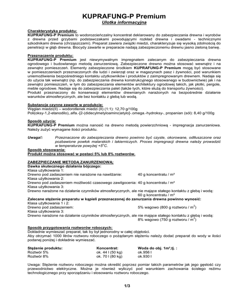 KUPRAFUNG-P Premium Ulotka informacyjna Charakterystyka produktu: KUPRAFUNG-P Premium to wodorozcieńczalny koncentrat deklarowany do zabezpieczania drewna i wyrobów z drewna przed grzybami podstawczakami powodującymi rozkład drewna i owadami - technicznymi szkodnikami drewna (chrząszczami). Preparat zawiera związki miedzi, charakteryzuje się wysoką zdolnością do penetracji w głąb drewna. Biocydy zawarte w preparacie nadają zabezpieczonemu drewnu jasno zieloną barwę. Przeznaczenie produktu: KUPRAFUNG-P Premium jest niewymywalnym impregnatem zalecanym do zabezpieczania drewna ogrodowego i budowlanego metodą zanurzeniową. Zabezpieczone drewno można stosować wewnątrz i na zewnątrz pomieszczeń. Elementy zabezpieczone środkiem KUPRAFUNG-P Premium mogą być stosowane w pomieszczeniach przeznaczonych dla ludzi i zwierząt oraz w magazynach pasz i żywności, pod warunkiem uniemożliwienia bezpośredniego kontaktu użytkowników i produktów z zaimpregnowanym drewnem. Nadaje się do użycia tak wewnątrz (np. do zabezpieczania drewna konstrukcyjnego stosowanego w budownictwie) jak i na zewnątrz pomieszczeń, w tym do zabezpieczania elementów architektury ogrodowej takich, jak płotki, pergole, meble ogrodowe. Nadaje się do zabezpieczania palet (także tych, które służą do transportu żywności). Produkt przeznaczony do konserwacji elementów drewnianych narażonych na bezpośrednie działanie warunków atmosferycznych, ale bez kontaktu z glebą lub wodą. Substancje czynne zawarte w produkcie: Węglan miedzi(II) – wodorotlenek miedzi (II) (1:1): 12,70 g/100g Poli(oksy-1,2-etanodilo),.alfa.-[2-(didecylmetyloamino)etylo]-.omega.-hydroksy-, propanian (sól): 8,40 g/100g Sposób użycia: KUPRAFUNG-P Premium można nanosić na drewno metodą powierzchniową - impregnacja zanurzeniowa. Należy zużyć wymagane ilości produktu. Przeznaczone do zabezpieczania drewno powinno być czyste, okorowane, odtłuszczone oraz pozbawione powłok malarskich i lakierniczych. Proces impregnacji drewna należy prowadzić o w temperaturze powyżej +5 C. Sposób stosowania: Produkt można stosować w postaci 5% lub 8% roztworów. Uwaga!: ZABEZPIECZANIE METODĄ ZANURZENIOWĄ: Dawka skutecznego działania bójczego: Klasa użytkowania 1: Drewno pod zadaszeniem nie narażone na nawilżanie: 40 g koncentratu / m² Klasa użytkowania 2: Drewno pod zadaszeniem możliwość czasowego zawilgocenia: 40 g koncentratu / m² Klasa użytkowania 3: Drewno narażone na działanie czynników atmosferycznych, ale nie mające stałego kontaktu z glebą i wodą: 60 g koncentratu / m² Zalecane stężenie preparatu w kąpieli przeznaczonej do zanurzania drewna powinno wynosić: Klasa użytkowania 1 i 2: 2 Drewno pod zadaszeniem: 5% wagowo (800 g roztworu / m ) Klasa użytkowania 3: Drewno narażone na działanie czynników atmosferycznych, ale nie mające stałego kontaktu z glebą i wodą: 2 8% wagowo (750 g roztworu / m ) Sposób przygotowania roztworów roboczych: Dokładnie wymieszać preparat, tak by był jednorodny w całej objętości. Aby otrzymać 1000 litrów roztworu roboczego o pożądanym stężeniu należy dodać preparat do wody w ilości podanej poniżej i dokładnie wymieszać. Stężenie produktu: Roztwór 5% Roztwór 8% Woda do obj. 1m³,tj. : ok.956 l ok.930 l Koncentrat: ok. 44 l (50 kg) ok. 70 l (80 kg) Uwaga: Stężenie roztworu roboczego można określić poprzez pomiar takich parametrów jak jego gęstość czy przewodnictwo elektryczne. Można je również wyliczyć pod warunkiem zachowania ścisłego reżimu technologicznego przy sporządzaniu i stosowaniu roztworu roboczego. 1/3 Uwaga: W trakcie pracy i w czasie suszenia drewna zapewnić prawidłową wentylację. Czas zanurzenia drewna: Czas zanurzenia drewna w kąpieli niezbędny do jego zabezpieczenia zgodnie z w/w zaleceniami zależy od geometrii zabezpieczanych elementów (stosunek powierzchni drewna do jego objętości), wilgotności drewna, jego stopnia odżywiczenia oraz innych czynników takich jak np. temperatura: otoczenia, impregnatu, zabezpieczanego drewna. Ilość wchłoniętego środka zależy również od proporcji drewna bielastego w stosunku do drewna twardzielowego. Drewno twardzielowe jest trudno nasycalne. Czas zanurzenia należy kontrolować na bieżąco obserwując ubytek roztworu roboczego. Im dłuższy będzie czas zanurzenia tym głębiej drewno zostanie zabezpieczone. Składowanie zabezpieczonego drewna: Wilgotność drewna powinna wynosić max. 25%. Bezpośrednio po impregnacji preparat nie jest utrwalony w drewnie i ulega wymywaniu, dlatego też zabezpieczone elementy należy chronić przed opadami atmosferycznymi przez minimum 48 godzin. Utrwalenie preparatu w wymagane dla zastosowań w klasie o zagrożenia 3 osiąga się po 20 dniach. Przy temperaturze otoczenia poniżej 5 C podane czasy należy wydłużyć (szybkość utrwalania preparatu zależy od temperatury i spada mniej więcej dwukrotnie na każdy spadek o temperatury o 10 C). Składowanie produktu: KUPRAFUNG-P Premium oraz jego roztwory należy przechowywać w pojemnikach w taki sposób, aby nie miały do nich dostępu osoby niepowołane, a w szczególności dzieci. Należy stosować się do przepisów o składowaniu substancji zagrażających wodom gruntowym i powierzchniowym oraz glebie. Nie wolno dopuścić, aby preparat przedostał się do gleby, wód gruntowych czy powierzchniowych. Preparat należy o przechowywać w temperaturze powyżej 0 C. Postępowanie z odpadami produktu i opakowaniami: Odpady produktu: Odpad produktu jest odpadem niebezpiecznym, jeżeli to możliwe należy go odzyskać i zawrócić do produkcji. Nie utylizować razem z odpadami komunalnymi. Nie usuwać do kanalizacji. Nie dopuszczać do zanieczyszczenia wód powierzchniowych, gruntowych i gleby. Utylizować zgodnie z obowiązującymi aktualnie przepisami odnoszącymi się do niebezpiecznych odpadów chemicznych. Poddać unieszkodliwieniu, wyłącznie w miejscach w