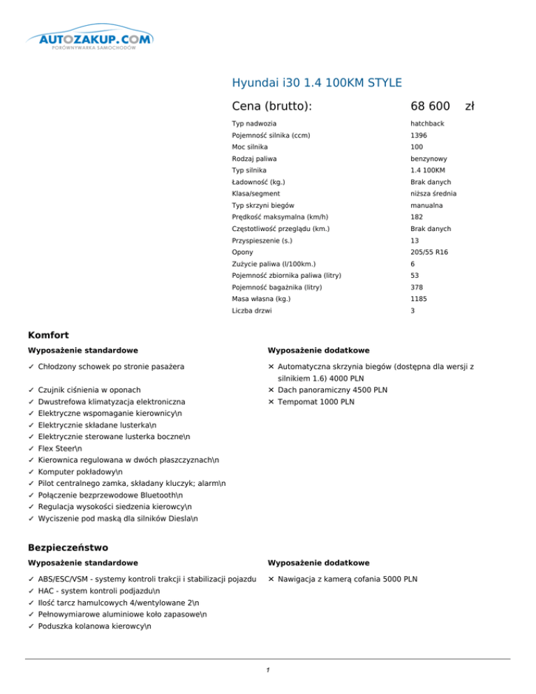 Hyundai i30 1.4 100KM STYLE Cena (brutto): 68 600 Typ nadwozia hatchback Pojemność silnika (ccm) 1396 Moc silnika 100 Rodzaj paliwa benzynowy Typ silnika 1.4 100KM Ładowność (kg.) Brak danych Klasa/segment niższa średnia Typ skrzyni biegów manualna Prędkość maksymalna (km/h) 182 Częstotliwość przeglądu (km.) Brak danych Przyspieszenie (s.) 13 Opony 205/55 R16 Zużycie paliwa (l/100km.) 6 Pojemność zbiornika paliwa (litry) 53 Pojemność bagażnika (litry) 378 Masa własna (kg.) 1185 Liczba drzwi 3 zł Komfort Wyposażenie standardowe Wyposażenie dodatkowe ✓ Chłodzony schowek po stronie pasażera ✕ Automatyczna skrzynia biegów (dostępna dla wersji z silnikiem 1.6) 4000 PLN ✓ Czujnik ciśnienia w oponach ✕ Dach panoramiczny 4500 PLN ✓ Dwustrefowa klimatyzacja elektroniczna ✕ Tempomat 1000 PLN ✓ Elektryczne wspomaganie kierownicy\n ✓ Elektrycznie składane lusterka\n ✓ Elektrycznie sterowane lusterka boczne\n ✓ Flex Steer\n ✓ Kierownica regulowana w dwóch płaszczyznach\n ✓ Komputer pokładowy\n ✓ Pilot centralnego zamka, składany kluczyk; alarm\n ✓ Połączenie bezprzewodowe Bluetooth\n ✓ Regulacja wysokości siedzenia kierowcy\n ✓ Wyciszenie pod maską dla silników Diesla\n Bezpieczeństwo Wyposażenie standardowe Wyposażenie dodatkowe ✓ ABS/ESC/VSM - systemy kontroli trakcji i stabilizacji pojazdu ✕ Nawigacja z kamerą cofania 5000 PLN ✓ HAC - system kontroli podjazdu\n ✓ Ilość tarcz hamulcowych 4/wentylowane 2\n ✓ Pełnowymiarowe aluminiowe koło zapasowe\n ✓ Poduszka kolanowa kierowcy\n 1 ✓ Poduszki bezpieczeństwa przednie, boczne – przednie i kurtynowe\n ✓ Przednie światła przeciwmgielne\n ✓ Statyczne doświetlanie zakrętów\n ✓ Sygnalizator niezapiętych pasów bezpieczeństwa\n ✓ Wszystkie szyby z funkcją bezpieczeństwa\n ✓ Wyłącznik poduszki bezpieczeństwa pasażera\n Dodatki Wyposażenie standardowe Wyposażenie dodatkowe ✓ Aluminiowe obręcze kół ✕ Ksenonowe światła adaptacyjne 4000 PLN ✓ Audio RDS/CD/MP3 ✕ Lakier metalik/perłowy 1700 PLN ✓ Centralny schowek na okulary nad głową ✕ Mistrzowski Pakiet Multimediów Blaupunkt New York 830 lub Clarion NX 502E (radio, DVD, nawigacja) –(opcjonalna kamera cofania 299 PLN) 2999 PLN ✓ Dzielone oparcie tylnego siedzenia 60:40\n ✓ Elektryczne i podgrzewane lusterka boczne w kolorze nadwozia z zintegrowanymi kierunkowskazami\n ✓ Gniazdko 12V w bagażniku\n ✓ Ilość głośników: 4 głośniki + 2 tweetery\n ✓ Klamki zewnętrzne w kolorze nadwozia\n ✓ Lampki do czytania z przodu\n ✓ Materiałowe wykończenie drzwi\n ✓ Mocowanie fotelików dziecięcych\n ✓ Podświetlana stacyjka\n ✓ Podświetlone lusterko do makijażu\n ✓ Podłączenie AUX, USB\n ✓ Podłokietnik przedni ze schowkiem\n ✓ Przednie szyby elektryczne\n ✓ Przyciemniane szyby\n ✓ Rozmiar opon i kół 205/55 R16\n ✓ Schowek pod podłogą bagażnika\n ✓ Siatka zabezpieczająca bagaż\n ✓ Skórzana kierownica i gałka zmiany biegów\n ✓ Skórzano-materiałowa tapicerka siedzeń\n ✓ Tubowa obudowa zegarów (Supervision)\n ✓ Tylne światła LED\n ✓ Uchwyt na kubek\n ✓ Wycieraczki z płaskim piórem\n ✓ Zdalne sterowanie audio na kierownicy\n Doprecyzowanie oferty Kontakt: Nazwa użytkownika: admin Nazwa firmy: qqq 2 Adres: qqq 12, 41-706 qqq1, NIP: 954 REGON: 1 Telefon: 123, 1 Fax: 1 Email: 1 www: 3