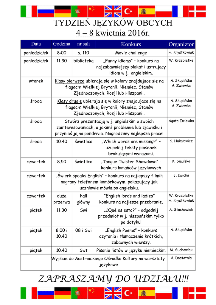 TYDZIEŃ JĘZYKÓW OBCYCH 4 – 8 kwietnia 2016r. Data Godzina nr sali Konkurs Organiztor poniedziałek 8:00 s. 110 Movie challenge H. Krystkowiak poniedziałek 11.30 biblioteka W. Krzebietke „Funny idioms“ – konkurs na najzabawniejszy plakat ilustrujący idiom w j. angielskim. wtorek Klasy pierwsze ubierają się w kolory znajdujące się na flagach: Wielkiej Brytanii, Niemiec, Stanów Zjednoczonych, Rosji lub Hiszpanii. A. Skupińska A. Zwiewka środa Klasy drugie ubierają się w kolory znajdujące się na flagach: Wielkiej Brytanii, Niemiec, Stanów Zjednoczonych, Rosji lub Hiszpanii. A. Skupińska A. Zwiewka środa Stwórz prezentację w j. angielskim o swoich zainteresowaniach, o jakimś problemie lub zjawisku i przynieś ją na pendrivie. Nagrodzimy najlepsze prace! Agata Zwiewka środa 10.40 świetlica „Which words are missing?“ – uzupełnij teksty piosenek brakującymi wyrazami. S. Hukałowicz czwartek 8.50 świetlica „Tongue Twister Showdown“ konkurs łamańców językowych K. Smulska czwartek „Świerk speaks English” – konkurs na najlepszy filmik nagrany telefonem komórkowym, pokazujący jak uczniowie mówią po angielsku. J. Iwicka czwartek duża przerwa hall główny “English lords and ladies” – konkurs na najlesze przebranie. W. Krzebietke H. Krystkowiak piątek 11.30 Swi „¿Qué es esto?” – odgadnij przedmiot w j. hiszpańskim tylko po dotyku! A. Stachowiak piątek 8.00 i 10.40 08 i Swi „English Poems” – konkurs czytania i tłumaczenia krótkich, zabawnych wierszy. A. Skupińska piątek 10.40 Swt Pisanie listów w języku niemieckim M. Suchowiak Wyjście do Austriackiego Ośrodka Kultury na warsztaty językowe. A. Dostatnia ZAPRASZAMY DO UDZIAŁU!!!