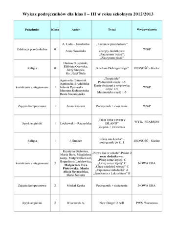 Wykaz podręczników dla klas I – III w roku szkolnym 2012/2013 Przedmiot Edukacja przedszkolna Religia Autor Tytuł A. Łada – Grodzicka „Razem w przedszkolu” 0 Anna Sowińska Zeszyty dodatkowe: „Zaczynam liczyć”, „Zaczynam pisać” 0 Dariusz Kurpiński, Elżbieta Osewska, Jerzy Snopek, Ks. Józef Stala Klasa Agnieszka Banasiak Agnieszka Brudzińska Jolanta Dymarska Marzena Kołaczyńska Beata Nadarzyńska „Kocham Dobrego Boga” „Tropiciele” Podręcznik część 1-5 Karty ćwiczeń z wyprawką część 1-5 Matematyka część 1-5 Wydawnictwo WSiP JEDNOŚĆ - Kielce kształcenie zintegrowane 1 Zajęcia komputerowe 1 Anna Kulesza Podręcznik + ćwiczenia WSiP Język angielski 1 Lochowski - Raczyńska „OUR DISCOVERY ISLAND” książka + ćwiczenia WYD. PEARSON Religia 1 J. Śmiech „Jezus nas kocha” – podręcznik do kl. I JEDNOŚĆ - Kielce Krystyna Bielenica, „Nowe Już w szkole”-Pakiet 2 Maria Bura, Magdalena oraz dodatkowo: Jasny, Małgorzata Kwil, „Piszę coraz lepiej” C Bogusława Lankiewicz, „Liczę coraz lepiej” C Małgorzata Ewa „Chcę wiedzieć więcej” C Piotrowska, Maria „Papierowe składanki” A Alicja Szymańska, „Spotkania z Lekturkiem” B Maria Szreder WSiP kształcenie zintegrowane 2 Zajęcia komputerowe 2 Michał Kęska Podręcznik + ćwiczenia NOWA ERA Język angielski 2 Wieczorek A. New Bingo! 2 A/B PWN Warszawa NOWA ERA Religia 2 J. Śmiech „Jezus jest z nami” Podręcznik + ćwiczenia Krystyna Bielenica, Maria Bura, Magdalena „Nowe Już w szkole” pakiet 3 Jasny, Małgorzata Kwil, Podręcznik sem. I i II Bogusława Lankiewicz, Ćwiczenia część 1,2,3,4 Małgorzata Ewa Matematyka część 1,2,3,4 Piotrowska, Maria Wycinanka część 1,2 Alicja Szymańska, Maria Szreder JEDNOŚĆ - Kielce kształcenie zintegrowane 3 Zajęcia komputerowe 3 Michał Kęska Podręcznik + ćwiczenia NOWA ERA Język angielski 3 Wieczorek A. New Bingo! 3 A/B PWN WARSZAWA Religia 3 J. Śmiech „Wzrastajmy w przyjaźni z Jezusem” Podręcznik + ćwiczenia JEDNOŚĆ - Kielce NOWA ERA
