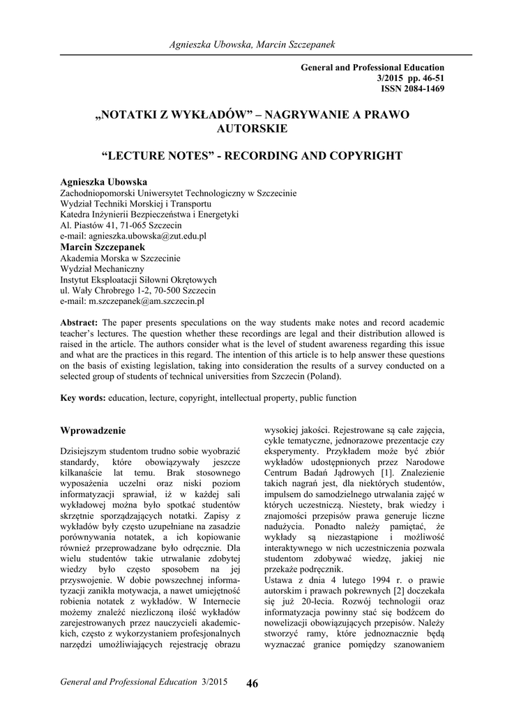 Agnieszka Ubowska, Marcin Szczepanek General and Professional Education 3/2015 pp. 46-51 ISSN 2084-1469 „NOTATKI Z WYKŁADÓW” – NAGRYWANIE A PRAWO AUTORSKIE “LECTURE NOTES” - RECORDING AND COPYRIGHT Agnieszka Ubowska Zachodniopomorski Uniwersytet Technologiczny w Szczecinie Wydział Techniki Morskiej i Transportu Katedra Inżynierii Bezpieczeństwa i Energetyki Al. Piastów 41, 71-065 Szczecin e-mail: [email protected] Marcin Szczepanek Akademia Morska w Szczecinie Wydział Mechaniczny Instytut Eksploatacji Siłowni Okrętowych ul. Wały Chrobrego 1-2, 70-500 Szczecin e-mail: [email protected] Abstract: The paper presents speculations on the way students make notes and record academic teacher’s lectures. The question whether these recordings are legal and their distribution allowed is raised in the article. The authors consider what is the level of student awareness regarding this issue and what are the practices in this regard. The intention of this article is to help answer these questions on the basis of existing legislation, taking into consideration the results of a survey conducted on a selected group of students of technical universities from Szczecin (Poland). Key words: education, lecture, copyright, intellectual property, public function wysokiej jakości. Rejestrowane są całe zajęcia, cykle tematyczne, jednorazowe prezentacje czy eksperymenty. Przykładem może być zbiór wykładów udostępnionych przez Narodowe Centrum Badań Jądrowych [1]. Znalezienie takich nagrań jest, dla niektórych studentów, impulsem do samodzielnego utrwalania zajęć w których uczestniczą. Niestety, brak wiedzy i znajomości przepisów prawa generuje liczne nadużycia. Ponadto należy pamiętać, że wykłady są niezastąpione i możliwość interaktywnego w nich uczestniczenia pozwala studentom zdobywać wiedzę, jakiej nie przekaże podręcznik. Ustawa z dnia 4 lutego 1994 r. o prawie autorskim i prawach pokrewnych [2] doczekała się już 20-lecia. Rozwój technologii oraz informatyzacja powinny stać się bodźcem do nowelizacji obowiązujących przepisów. Należy stworzyć ramy, które jednoznacznie będą wyznaczać granice pomiędzy szanowaniem Wprowadzenie Dzisiejszym studentom trudno sobie wyobrazić standardy, które obowiązywały jeszcze kilkanaście lat temu. Brak stosownego wyposażenia uczelni oraz niski poziom informatyzacji sprawiał, iż w każdej sali wykładowej można było spotkać studentów skrzętnie sporządzających notatki. Zapisy z wykładów były często uzupełniane na zasadzie porównywania notatek, a ich kopiowanie również przeprowadzane było odręcznie. Dla wielu studentów takie utrwalanie zdobytej wiedzy było często sposobem na jej przyswojenie. W dobie powszechnej informatyzacji zanikła motywacja, a nawet umiejętność robienia notatek z wykładów. W Internecie możemy znaleźć niezliczoną ilość wykładów zarejestrowanych przez nauczycieli akademickich, często z wykorzystaniem profesjonalnych narzędzi umożliwiających rejestrację obrazu General and Professional Education 3/2015 46 „NOTATKI Z WYKŁADÓW” – NAGRYWANIE A PRAWO AUTORSKIE wykładowcy). Według sondy przeprowadzonej przez DI notatki z wykładów nie powinny być chronione prawem autorskim (75,2% odpowiedzi – nie oraz 18,5% - raczej nie) [6]. W lutym tego roku Internet obiegł film zarejestrowany przez studentów na jednej z polskich uczelni, na którym po sprawdzeniu studentce notatek wykładowca przedziurawia je wiertarką [7]. Czy należy jednak sięgać po tak drastyczne środki? dostępu studentów do szeroko pojętej wiedzy, a prawem wykładowców do ochrony własności intelektualnej. „Praktyka studencka” Funkcjonowanie w realiach portali społecznościowych powoduje chęć dzielenia się wszystkim ze wszystkimi. Platformy takie są miejscem do przekazywania sobie informacji o zajęciach, opinii o prowadzących, umożliwiają również wymianę różnego rodzaju plików. Student wyposażony w telefon komórkowy z wbudowaną funkcją rejestracji dźwięku i obrazu, czy też dyktafon to dzisiaj codzienność. W przypadku, gdy mamy do czynienia z dużą grupą studentów zwrócenie uwagi na osoby wykorzystujące tego typu urządzenia do rejestracji wykładów jest trudne. Wiele uczelni próbuje ograniczyć stosowanie telefonów komórkowych i „smartfonów” w trakcie zajęć, z jednej strony, aby usunąć z sali wszelkie „pomoce naukowe”, z drugiej, aby uniemożliwić nagrywanie wykładów bez udzielenia zgody wykładowcy. W opinii studentów rejestracja podczas wykładów nie stoi w konflikcie z przepisami. Rejestrację bez zgody kadry akademickiej studenci traktują dosyć swobodnie, tłumacząc swoje zachowanie potrzebą uzupełnienia notatek, powtórzenia materiału przekazanego podczas zajęć (tzw. użytek osobisty). W przypadku gdy nagranie zostanie wykorzystane do tego celu, wykładowca często nie będzie sobie nawet zdawał sprawy z faktu, że jego wypowiedź została nagrana [3]. Problem pojawi się, gdy wykład trafia do Internetu, na dodatek bez zgody na jego rejestrację i rozpowszechnianie. Konflikty i dyskusje na tym polu pojawiają się w sieci coraz częściej. Z jednej strony ukazują się skargi wykładowców, co do naruszania ich własności intelektualnej, z drugiej pytania studentów, co do legalności procesu rejestrowania [4]. W dyskusjach na ten temat przytaczane są ostrzeżenia, które studenci usłyszeli od wykładowców: „informuję Państwa, że jeśli tylko przyłapię kogokolwiek na nagrywaniu wykładów to od razu sprawa prokuratorska” [5]. Bardziej kontrowersyjnym wydaje się być podejście wykładowców, iż ochroną powinny być objęte również notatki sporządzone przez studentów odręcznie (mogą mieć one charakter opracowania utworu, co oznacza, że można je rozpowszechniać jedynie za zgodą twórcy utworu pierwotnego, a więc Wykładowca – funkcja publiczna Zdaniem części studentów m
