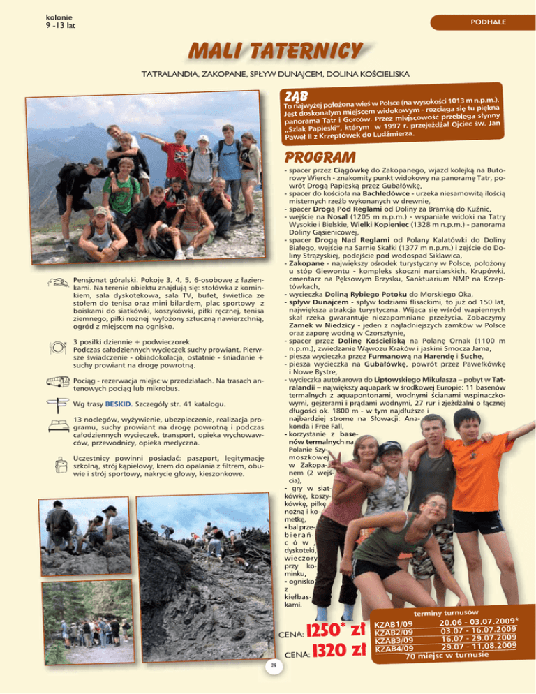 kolonie PODHALE 9 -13 lat MALI TATERNICY TATRALANDIA, ZAKOPANE, SPŁYW DUNAJCEM, DOLINA KOŚCIELISKA ZĄB ce (na wysokości 1013 m n.p.m.). To najwyżej położona wieś w Pols kowym - rozciąga się tu piękna Jest doskonałym miejscem wido miejscowość przebiega słynny z Prze ów. Gorc i panorama Tatr r. przejeżdżał Ojciec św. Jan 1997 w „Szlak Papieski”, którym mierza. Paweł II z Krzeptówek do Ludź PROGRAM - spacer przez Ciągówkę do Zakopanego, wjazd kolejką na Butorowy Wierch - znakomity punkt widokowy na panoramę Tatr, powrót Drogą Papieską przez Gubałówkę, - spacer do kościoła na Bachledówce - urzeka niesamowitą ilością misternych rzeźb wykonanych w drewnie, - spacer Drogą Pod Reglami od Doliny za Bramką do Kuźnic, - wejście na Nosal (1205 m n.p.m.) - wspaniałe widoki na Tatry Wysokie i Bielskie, Wielki Kopieniec (1328 m n.p.m.) - panorama Doliny Gąsienicowej, - spacer Drogą Nad Reglami od Polany Kalatówki do Doliny Białego, wejście na Sarnie Skałki (1377 m n.p.m.) i zejście do Doliny Strążyskiej, podejście pod wodospad Siklawica, - Zakopane - największy ośrodek turystyczny w Polsce, położony u stóp Giewontu - kompleks skoczni narciarskich, Krupówki, cmentarz na Pęksowym Brzysku, Sanktuarium NMP na Krzeptówkach, - wycieczka Doliną Rybiego Potoku do Morskiego Oka, - spływ Dunajcem - spływ łodziami flisackimi, to już od 150 lat, największa atrakcja turystyczna. Wijąca się wśród wapiennych skał rzeka gwarantuje niezapomniane przeżycia. Zobaczymy Zamek w Niedzicy - jeden z najładniejszych zamków w Polsce oraz zaporę wodną w Czorsztynie, - spacer przez Dolinę Kościeliską na Polanę Ornak (1100 m n.p.m.), zwiedzanie Wąwozu Kraków i jaskini Smocza Jama, - piesza wycieczka przez Furmanową na Harendę i Suche, - piesza wycieczka na Gubałówkę, powrót przez Pawełkówkę i Nowe Bystre, - wycieczka autokarowa do Liptowskiego Mikulasza – pobyt w Tatralandii – największy aquapark w środkowej Europie: 11 basenów termalnych z aquapontonami, wodnymi ścianami wspinaczkowymi, gejzerami i prądami wodnymi, 27 rur i zjeżdżalni o łącznej długości ok. 1800 m - w tym najdłuższe i najbardziej strome na Słowacji: Anakonda i Free Fall, - korzystanie z basenów termalnych na Polanie Szymoszkowej w Zakopanem (2 wejścia), - gry w siatkówkę, koszykówkę, piłkę nożną i kometkę, - bal przebierańc ó w , dyskoteki, wieczory przy kominku, - ognisko z kiełbaskami. terminy turnusów Pensjonat góralski. Pokoje 3, 4, 5, 6-osobowe z łazienkami. Na terenie obiektu znajdują się: stołówka z kominkiem, sala dyskotekowa, sala TV, bufet, świetlica ze stołem do tenisa oraz mini bilardem, plac sportowy z boiskami do siatkówki, koszykówki, piłki ręcznej, tenisa ziemnego, piłki nożnej wyłożony sztuczną nawierzchnią, ogród z miejscem na ognisko. 3 posiłki dziennie + podwieczorek. Podczas całodziennych wycieczek suchy prowiant. Pierwsze świadczenie - obiadokolacja, ostatnie - śniadanie + suchy prowiant na drogę powrotną. Pociąg - rezerwacja miejsc w przedziałach. Na trasach antenowych pociąg lub mikrobus. Wg trasy BESKID. Szczegóły str. 41 katalogu. 13 noclegów, wyżywienie, ubezpieczenie, realizacja programu, suchy prowiant na drogę powrotną i podczas całodziennych wycieczek, transport, opieka wychowawców, przewodnicy, opieka medyczna. Uczestnicy powinni posiadać: paszport, legitymację szkolną, strój kąpielowy, krem do opalania z filtrem, obuwie i strój sportowy, nakrycie głowy, kieszonkowe. * CENA: 1250 zł CENA: 1320 zł 29 20.06 - 03.07.2009* KZAB1/09 03.07 - 16.07.2009 KZAB2/09 16.07 - 29.07.2009 KZAB3/09 29.07 - 11.08.2009 KZAB4/09 w turnusie jsc mie 70