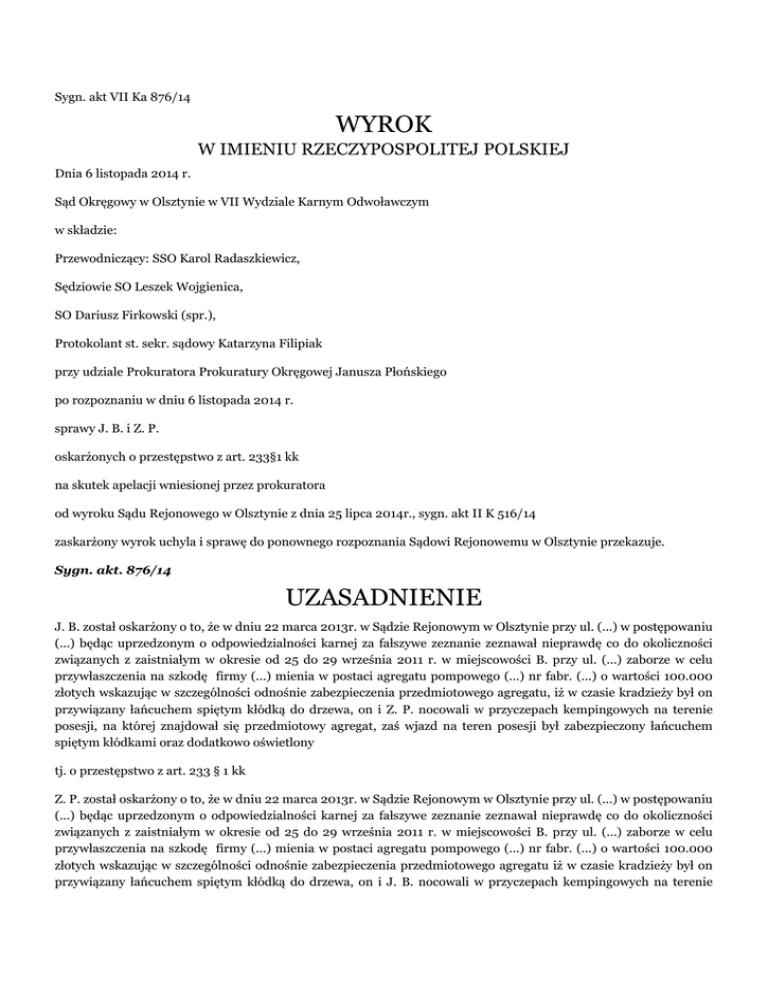 Sygn. akt VII Ka 876/14 WYROK W IMIENIU RZECZYPOSPOLITEJ POLSKIEJ Dnia 6 listopada 2014 r. Sąd Okręgowy w Olsztynie w VII Wydziale Karnym Odwoławczym w składzie: Przewodniczący: SSO Karol Radaszkiewicz, Sędziowie SO Leszek Wojgienica, SO Dariusz Firkowski (spr.), Protokolant st. sekr. sądowy Katarzyna Filipiak przy udziale Prokuratora Prokuratury Okręgowej Janusza Płońskiego po rozpoznaniu w dniu 6 listopada 2014 r. sprawy J. B. i Z. P. oskarżonych o przestępstwo z art. 233§1 kk na skutek apelacji wniesionej przez prokuratora od wyroku Sądu Rejonowego w Olsztynie z dnia 25 lipca 2014r., sygn. akt II K 516/14 zaskarżony wyrok uchyla i sprawę do ponownego rozpoznania Sądowi Rejonowemu w Olsztynie przekazuje. Sygn. akt. 876/14 UZASADNIENIE J. B. został oskarżony o to, że w dniu 22 marca 2013r. w Sądzie Rejonowym w Olsztynie przy ul. (...) w postępowaniu (...) będąc uprzedzonym o odpowiedzialności karnej za fałszywe zeznanie zeznawał nieprawdę co do okoliczności związanych z zaistniałym w okresie od 25 do 29 września 2011 r. w miejscowości B. przy ul. (...) zaborze w celu przywłaszczenia na szkodę firmy (...) mienia w postaci agregatu pompowego (...) nr fabr. (...) o wartości 100.000 złotych wskazując w szczególności odnośnie zabezpieczenia przedmiotowego agregatu, iż w czasie kradzieży był on przywiązany łańcuchem spiętym kłódką do drzewa, on i Z. P. nocowali w przyczepach kempingowych na terenie posesji, na której znajdował się przedmiotowy agregat, zaś wjazd na teren posesji był zabezpieczony łańcuchem spiętym kłódkami oraz dodatkowo oświetlony tj. o przestępstwo z art. 233 § 1 kk Z. P. został oskarżony o to, że w dniu 22 marca 2013r. w Sądzie Rejonowym w Olsztynie przy ul. (...) w postępowaniu (...) będąc uprzedzonym o odpowiedzialności karnej za fałszywe zeznanie zeznawał nieprawdę co do okoliczności związanych z zaistniałym w okresie od 25 do 29 września 2011 r. w miejscowości B. przy ul. (...) zaborze w celu przywłaszczenia na szkodę firmy (...) mienia w postaci agregatu pompowego (...) nr fabr. (...) o wartości 100.000 złotych wskazując w szczególności odnośnie zabezpieczenia przedmiotowego agregatu iż w czasie kradzieży był on przywiązany łańcuchem spiętym kłódką do drzewa, on i J. B. nocowali w przyczepach kempingowych na terenie posesji, na której znajdował się przedmiotowy agregat, zaś wjazd na teren posesji był zabezpieczony łańcuchem spiętym kłódkami oraz dodatkowo oświetlony tj. o przestępstwo z art. 233 § 1 kk. Sąd Rejonowy w Olsztynie wyrokiem z dnia 25 lipca 2014r. w sprawie II K 516/14 oskarżonych J. B. i Z. P. uniewinnił od popełnienia zarzucanych im czynów. Powyższy wyrok w całości na niekorzyść oskarżonych J. B. i Z. P. zaskarżył prokurator i zarzucił mu błąd w ustaleniach faktycznych, który miał wpływ na treść zapadłego orzeczenia polegający na przyjęciu, że oskarżeni J. B. i Z. P. nie popełnili zarzucanego im czynu i w dniu 22 marca 2013 r. w Sądzie Rejonowym w Olsztynie przy ul. (...) w postępowaniu (...) będąc uprzedzonymi o odpowiedzialności karnej za fałszywe zeznanie zeznawali prawdę co do okoliczności związanych z zaistniałym w okresie od 25 do 29 września 2011 r. w miejscowości B. przy ul. (...) zaborze w celu przywłaszczenia na szkodę firmy (...) mienia w postaci agregatu pompowego (...) nr fabr. (...) o wartości 100.000 złotych, podczas gdy prowadzone dowody oceniane swobodnie z uwzględnieniem prawidłowego rozumowania, wskazań wiedzy i doświadczenia życiowego przemawiają za uznaniem oskarżonych winnymi popełnienia czynów zarzucanych im aktem oskarżenia, tj. przestępstw z art. 233 § 1 kk. Podnosząc powyższy zarzut skarżący wniósł o uchylenie wyroku Sądu Rejonowego w Olsztynie i przekazanie sprawy do ponownego rozpoznania. Sąd Okręgowy zważył co następuje: Nie przesądzając ostatecznego rozstrzygnięcia w sprawie podnieść należy, że kolejna apelacja prokuratora jest o tyle zasadna o ile z jej treści wynika potrzeba uchylenia zaskarżonego wyroku i przekazanie sprawy do ponownego rozpoznania. W dalszym ciągu słuszne jest stanowisko oskarżyciela publicznego, iż wątpliwości budzi ocena dowodów dokonana przez Sąd Rejonowy w Olsztynie i oparte na jej podstawie ustalenia faktyczne, których następstwem jest uniewinnienie oskarżonych od popełnienia zarzucanych im czynów. Tym samym w odpowiednim zakresie aktualne pozostają uwagi poczynione w uzasadnieniu wyroku Sądu Okręgowego w O. z dnia 8 maja 2014 r. w sprawie (...) Zwrócić zatem należy ponownie uwagę na to, że w sprawie akt (...) Sądu Rejonowego w O.w dniu 22 marca 2013 r. po przesłuchaniu J. B. i Z. P. dostrzeżone zostały rozbieżności pomiędzy tymi twierdzeniami a zeznaniami składanymi we wrześniu i październiku 2011 r. w postępowaniu (...) Prokuratury Rejonowej w W.. Także i Sąd Okręgowy w O., który wyrokiem z dnia 17 grudnia 2013 r. sygn. akt (...) utrzymał w mocy wyrok wydany w sprawie (...), w swoim uzasadnieniu dostrzegł „pewną dysharmonię - pomimo upływu czasu świadkowie w postępowaniu przed Sądem Cywilnym dokładnie i szczegółowo zeznawali na okoliczności, których nie byli w stanie stwierdzić zaraz po ujawnieniu kradzieży agregatu, kiedy to nie byli w stanie podać podstawowych informacji - kiedy do kradzieży doszło, jak i czym był zabezpieczony agregat, itd.”. Tymczasem Sąd I instancji dał natomiast wiarę J. B. i Z. P., że składając zeznania przed Sądem Rejonowym podczas rozprawy w dniu 22 marca 2013 r. nie kłamali i mówili prawdę wskazując miedzy innymi, że należało dać wiarę oskarżonym co do tego, że zeznania i relacje złożone postępowaniu przygotowawczym w sprawie (...) były bardzo ogólne i nie zawierały szczegółów związanych z przechowywaniem i utratą urządzenia a nastąpiło to wobec określonych pytań zadawanych przez przesłuchujący