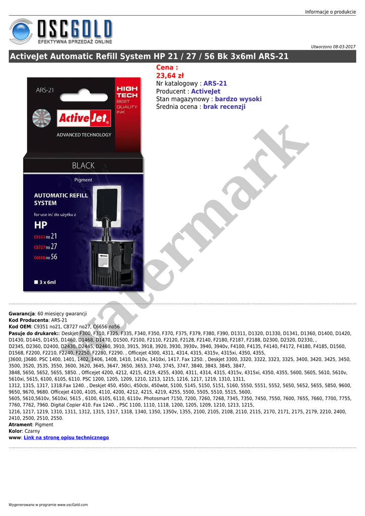 Informacje o produkcie Utworzono 08-03-2017 ActiveJet Automatic Refill System HP 21 / 27 / 56 Bk 3x6ml ARS-21 Cena : 23,64 zł at er m ar k Nr katalogowy : ARS-21 Producent : ActiveJet Stan magazynowy : bardzo wysoki Średnia ocena : brak recenzji w Gwarancja: 60 miesięcy gwarancji Kod Producenta: ARS-21 Kod OEM: C9351 no21, C8727 no27, C6656 no56 Pasuje do drukarek:: Deskjet F300, F310, F325, F335, F340, F350, F370, F375, F379, F380, F390, D1311, D1320, D1330, D1341, D1360, D1400, D1420, D1430, D1445, D1455, D1460, D1468, D1470, D1500, F2100, F2110, F2120, F2128, F2140, F2180, F2187, F2188, D2300, D2320, D2330, , D2345, D2360, D2400, D2430, D2445, D2460, 3910, 3915, 3918, 3920, 3930, 3930v, 3940, 3940v, F4100, F4135, F4140, F4172, F4180, F4185, D1560, D1568, F2200, F2210, F2240, F2250, F2280, F2290. , Officejet 4300, 4311, 4314, 4315, 4315v, 4315xi, 4350, 4355, J3600, J3680. PSC 1400, 1401, 1402, 1406, 1408, 1410, 1410v, 1410xi, 1417. Fax 1250. , Deskjet 3300, 3320, 3322, 3323, 3325, 3400, 3420, 3425, 3450, 3500, 3520, 3535, 3550, 3600, 3620, 3645, 3647, 3650, 3653, 3740, 3745, 3747, 3840, 3843, 3845, 3847, 3848, 5650, 5652, 5655, 5850. , Officejet 4200, 4212, 4215, 4219, 4255, 4300, 4311, 4314, 4315, 4315v, 4315xi, 4350, 4355, 5600, 5605, 5610, 5610v, 5610xi, 5615, 6100, 6105, 6110. PSC 1200, 1205, 1209, 1210, 1213, 1215, 1216, 1217, 1219, 1310, 1311, 1312, 1315, 1317, 1318.Fax 1240. , Deskjet 450, 450ci, 450cbi, 450wbt, 5100, 5145, 5150, 5151, 5160, 5550, 5551, 5552, 5650, 5652, 5655, 5850, 9600, 9650, 9670, 9680. Officejet 4100, 4105, 4110, 4200, 4212, 4215, 4219, 4255, 5500, 5505, 5510, 5515, 5600, 5605, 5610,5610v, 5610xi, 5615 , 6100, 6105, 6110, 6110v. Photosmart 7150, 7200, 7260, 7268, 7345, 7350, 7450, 7550, 7600, 7655, 7660, 7700, 7755, 7760, 7762, 7960. Digital Copier 410. Fax 1240. , PSC 1100, 1110, 1118, 1200, 1205, 1209, 1210, 1213, 1215, 1216, 1217, 1219, 1310, 1311, 1312, 1315, 1317, 1318, 1340, 1350, 1350v, 1355, 2100, 2105, 2108, 2110, 2115, 2170, 2171, 2175, 2179, 2210, 2400, 2410, 2500, 2510, 2550. Atrament: Pigment Kolor: Czarny www: Link na stronę opisu technicznego Wygenerowano w programie www.oscGold.com