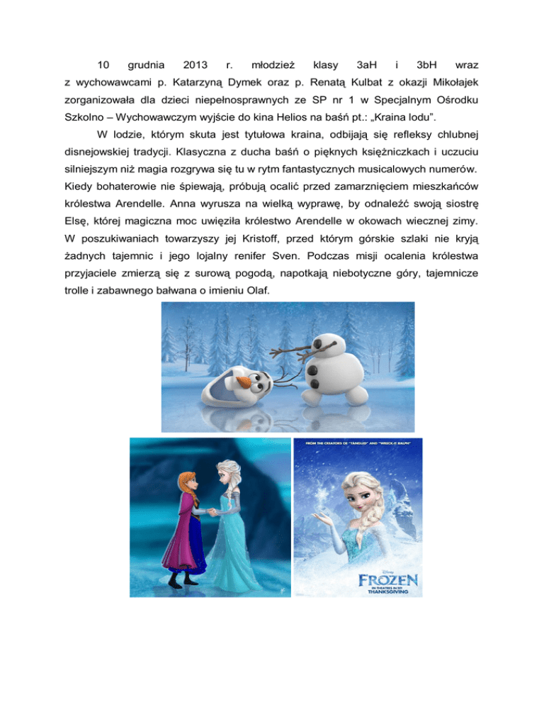 10 grudnia 2013 r. młodzież klasy 3aH i 3bH wraz z wychowawcami p. Katarzyną Dymek oraz p. Renatą Kulbat z okazji Mikołajek zorganizowała dla dzieci niepełnosprawnych ze SP nr 1 w Specjalnym Ośrodku Szkolno – Wychowawczym wyjście do kina Helios na baśń pt.: „Kraina lodu”. W lodzie, którym skuta jest tytułowa kraina, odbijają się refleksy chlubnej disnejowskiej tradycji. Klasyczna z ducha baśń o pięknych księżniczkach i uczuciu silniejszym niż magia rozgrywa się tu w rytm fantastycznych musicalowych numerów. Kiedy bohaterowie nie śpiewają, próbują ocalić przed zamarznięciem mieszkańców królestwa Arendelle. Anna wyrusza na wielką wyprawę, by odnaleźć swoją siostrę Elsę, której magiczna moc uwięziła królestwo Arendelle w okowach wiecznej zimy. W poszukiwaniach towarzyszy jej Kristoff, przed którym górskie szlaki nie kryją żadnych tajemnic i jego lojalny renifer Sven. Podczas misji ocalenia królestwa przyjaciele zmierzą się z surową pogodą, napotkają niebotyczne góry, tajemnicze trolle i zabawnego bałwana o imieniu Olaf. Animacja i efekty 3D sprawiły poruszyły wiele serc młodszych jak i starszych widzów. Celem naszego mikołajkowego spotkania było między innymi: kontynuowanie tradycji związanych z „Mikołajkami” w Polsce, uświadomienie konieczności pielęgnowania tradycji świątecznych; dostarczenie dzieciom radości poprzez obdarowanie ich prezentami; zachęcenie uczniów do dzielenia się „dobrocią" i dobrami materialnymi z bliźnimi.