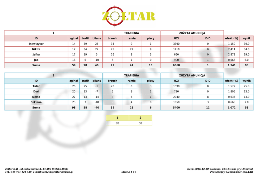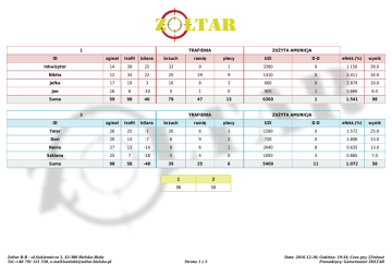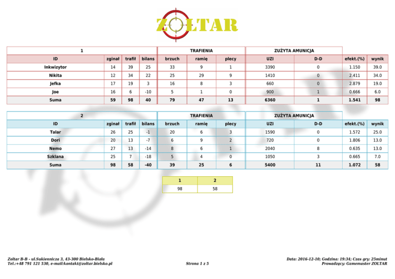 1 TRAFIENIA ZUŻYTA AMUNICJA ID zginał trafił bilans brzuch ramię plecy UZI D-D efekt.(%) wynik Inkwizytor 14 39 25 33 9 1 3390 0 1.150 39.0 Nikita 12 34 22 25 29 9 1410 0 2.411 34.0 Jefka 17 19 3 16 8 3 660 0 2.879 19.0 Joe 16 6 -10 5 1 0 900 1 0.666 6.0 Suma 59 98 40 79 47 13 6360 1 1.541 98 2 TRAFIENIA ZUŻYTA AMUNICJA ID zginał trafił bilans brzuch ramię plecy UZI D-D efekt.(%) wynik Talar 26 25 -1 20 6 3 1590 0 1.572 25.0 Dori 20 13 -7 6 9 2 720 0 1.806 13.0 Nemo 27 13 -14 8 6 1 2040 8 0.635 13.0 Szklana 25 7 -18 5 4 0 1050 3 0.665 7.0 Suma 98 58 -40 39 25 6 5400 11 1.072 58 Zoltar B-B - ul.Sukiennicza 3, 43-300 Bielsko-Biała Tel.:+48 791 121 530, e-mail:[email protected] 1 2 98 58 Strona 1 z 5 Data: 2016-12-10; Godzina: 19:34; Czas gry: 25minut Prowadzący: Gamemaster ZOLTAR 1 TRAFIENIA ZUŻYTA AMUNICJA ID zginał trafił bilans brzuch ramię plecy UZI D-D efekt.(%) wynik Inkwizytor 15 30 15 24 9 2 3180 0 0.943 30.0 Nikita 17 20 3 17 11 4 1920 0 1.042 20.0 Jefka 9 20 11 16 7 0 1350 0 1.481 20.0 Joe 15 8 -7 8 2 0 1440 0 0.556 8.0 Suma 56 78 22 65 29 6 7890 0 0.989 78 2 TRAFIENIA ZUŻYTA AMUNICJA ID zginał trafił bilans brzuch ramię plecy UZI D-D efekt.(%) wynik Talar 27 19 -8 14 3 2 2640 2 0.719 19.0 Nemo 22 14 -8 8 8 2 3090 38 0.448 14.0 Dori 17 13 -4 8 9 0 1980 1 0.656 13.0 Szklana 12 10 -2 6 3 1 2580 0 0.388 10.0 Suma 78 56 -22 36 23 5 10290 41 0.542 56 Zoltar B-B - ul.Sukiennicza 3, 43-300 Bielsko-Biała Tel.:+48 791 121 530, e-mail:[email protected] 1 2 78 56 Strona 2 z 5 Data: 2016-12-10; Godzina: 20:03; Czas gry: 25minut Prowadzący: Gamemaster ZOLTAR Drużyny Miejsce Nazwa Zoltar B-B - ul.Sukiennicza 3, 43-300 Bielsko-Biała Tel.:+48 791 121 530, e-mail:[email protected] Rozgrywki 1 2 Suma 1 98 78 176 2 58 56 114 Strona 3 z 5 Data: 2016-12-10 Prowadzący: Gamemaster ZOLTAR Zestawienie wg wyniku Miejsce TRAFIENIA ZUŻYTA AMUNICJA ID zginał trafił bilans brzuch ramię plecy UZI D-D efekt.(%) wynik Inkwizytor 34.80 82.80 48.00 68.40 21.60 3.60 7884.00 0.00 1.050 82.80 Nikita 34.80 64.80 30.00 50.40 48.00 15.60 3996.00 0.00 1.622 64.80 Talar 63.60 52.80 -10.80 40.80 10.80 6.00 5076.00 2.40 1.040 52.80 4 Jefka 31.20 46.80 15.60 38.40 18.00 3.60 2412.00 0.00 1.940 46.80 5 Nemo 58.80 32.40 -26.40 19.20 16.80 3.60 6156.00 55.20 0.522 32.40 6 Dori 44.40 31.20 -13.20 16.80 21.60 2.40 3240.00 1.20 0.963 31.20 7 Szklana 44.40 20.40 -24.00 13.20 8.40 1.20 4356.00 3.60 0.468 20.40 8 Joe 37.20 16.80 -20.40 15.60 3.60 0.00 2808.00 1.20 0.598 16.80 Zestawienie wg bilansu Miejsce TRAFIENIA ZUŻYTA AMUNICJA ID zginał trafił bilans brzuch ramię plecy UZI D-D efekt.(%) wynik Inkwizytor 34.80 82.80 48.00 68.40 21.60 3.60 7884.00 0.00 1.050 82.80 Nikita 34.80 64.80 30.00 50.40 48.00 15.60 3996.00 0.00 1.622 64.80 Jefka 31.20 46.80 15.60 38.40 18.00 3.60 2412.00 0.00 1.940 46.80 4 Talar 63.60 52.80 -10.80 40.80 10.80 6.00 5076.00 2.40 1.040 52.80 5 Dori 44.40 31.20 -13.20 16.80 21.60 2.40 3240.00 1.20 0.963 31.20 6 Joe 37.20 16.80 -20.40 15.60 3.60 0.00 2808.00 1.20 0.598 16.80 7 Szklana 44.40 20.40 -24.00 13.20 8.40 1.20 4356.00 3.60 0.468 20.40 8 Nemo 58.80 32.40 -26.40 19.20 16.80 3.60 6156.00 55.20 0.522 32.40 Zoltar B-B - ul.Sukiennicza 3, 43-300 Bielsko-Biała Tel.:+48 791 121 530, e-mail:[email protected] Strona 4 z 5 Data: 2016-12-10 Prowadzący: Gamemaster ZOLTAR Zestawienie wg efektywności Miejsce TRAFIENIA ZUŻYTA AMUNICJA ID zginał trafił bilans brzuch ramię plecy UZI D-D efekt.(%) wynik Jefka 31.20 46.80 15.60 38.40 18.00 3.60 2412.00 0.00 1.940 46.80 Nikita 34.80 64.80 30.00 50.40 48.00 15.60 3996.00 0.00 1.622 64.80 Inkwizytor 34.80 82.80 48.00 68.40 21.60 3.60 7884.00 0.00 1.050 82.80 4 Talar 63.60 52.80 -10.80 40.80 10.80 6.00 5076.00 2.40 1.040 52.80 5 Dori 44.40 31.20 -13.20 16.80 21.60 2.40 3240.00 1.20 0.963 31.20 6 Joe 37.20 16.80 -20.40 15.60 3.60 0.00 2808.00 1.20 0.598 16.80 7 Nemo 58.80 32.40 -26.40 19.20 16.80 3.60 6156.00 55.20 0.522 32.40 8 Szklana 44.40 20.40 -24.00 13.20 8.40 1.20 4356.00 3.60 0.468 20.40 Zoltar B-B - ul.Sukiennicza 3, 43-300 Bielsko-Biała Tel.:+48 791 121 530, e-mail:[email protected] Strona 5 z 5 Data: 2016-12-10 Prowadzący: Gamemaster ZOLTAR