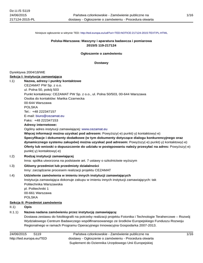 Dz.U./S S119 24/06/2015 217124-2015-PL Państwa członkowskie - Zamówienie publiczne na dostawy - Ogłoszenie o zamówieniu - Procedura otwarta 1/16 Niniejsze ogłoszenie w witrynie TED: http://ted.europa.eu/udl?uri=TED:NOTICE:217124-2015:TEXT:PL:HTML Polska-Warszawa: Maszyny i aparatura badawcza i pomiarowa 2015/S 119-217124 Ogłoszenie o zamówieniu Dostawy Dyrektywa 2004/18/WE Sekcja I: Instytucja zamawiająca I.1) Nazwa, adresy i punkty kontaktowe CEZAMAT PW Sp. z o.o. ul. Polna 50, pokój 503 Punkt kontaktowy: CEZAMAT PW Sp. z o.o., ul. Polna 50/503, 00-644 Warszawa Osoba do kontaktów: Marika Czarnecka 00-644 Warszawa POLSKA Tel.: +48 222347157 E-mail: [email protected] Faks: +48 222347153 Adresy internetowe: Ogólny adres instytucji zamawiającej: www.cezamat.eu Więcej informacji można uzyskać pod adresem: Powyższy(-e) punkt(-y) kontaktowy(-e) Specyfikacje i dokumenty dodatkowe (w tym dokumenty dotyczące dialogu konkurencyjnego oraz dynamicznego systemu zakupów) można uzyskać pod adresem: Powyższy(-e) punkt(-y) kontaktowy(-e) Oferty lub wnioski o dopuszczenie do udziału w postępowaniu należy przesyłać na adres: Powyższy(-e) punkt(-y) kontaktowy(-e) I.2) Rodzaj instytucji zamawiającej Inna: spółka utworzona na podstawie art. 7 ustawy o szkolnictwie wyższym I.3) Główny przedmiot lub przedmioty działalności Inny: zarządzanie procesem realizacji projektu CEZAMAT I.4) Udzielenie zamówienia w imieniu innych instytucji zamawiających Instytucja zamawiająca dokonuje zakupu w imieniu innych instytucji zamawiających: tak Politechnika Warszawska pl. Politechniki 1 00-661 Warszawa POLSKA Sekcja II: Przedmiot zamówienia II.1) Opis II.1.1) Nazwa nadana zamówieniu przez instytucję zamawiającą: Dostawa zestawu do fotolitografii na potrzeby realizacji projektu Fotonika i Technologie Terahercowe – Rozwój Wydziałowego Centrum Badawczego współfinansowanego ze środków Europejskiego Funduszu Rozwoju Regionalnego w ramach Programu Operacyjnego Innowacyjna Gospodarka 2007-2013. 24/06/2015 S119 http://ted.europa.eu/TED Państwa członkowskie - Zamówienie publiczne na dostawy - Ogłoszenie o zamówieniu - Procedura otwarta Suplement do Dziennika Urzędowego Unii Europejskiej 1/16 Dz.U./S S119 24/06/2015 217124-2015-PL Państwa członkowskie - Zamówienie publiczne na dostawy - Ogłoszenie o zamówieniu - Procedura otwarta 2/16 II.1.2) Rodzaj zamówienia oraz lokalizacja robót budowlanych, miejsce realizacji dostawy lub świadczenia usług Dostawy Kupno Główne miejsce lub lokalizacja robót budowlanych, miejsce realizacji dostawy lub świadczenia usług: Urządzenie zostanie dostarczone do Laboratorium Centralnego CEZAMAT, ul. Poleczki 19, 02-822 Warszawa, budynek technologiczny, piętro 3, platforma technologii struktur, przyrządów i układów, pracownia litografii dla krzemowych materiałów półprzewodnikowych, miejsca B3.1. – B3.2. (Projekt wykonawczy, budynek technologiczny, rzut kondygnacji +3, plansza A i B). Kod NUTS PL127 II.1.3) Informacje na temat zamówienia publicznego, umowy ramowej lub dynamicznego systemu zakupów (DSZ) Ogłoszenie dotyczy zamówienia publicznego II.1.4) Informacje na temat umowy ramowej II.1.5) Krótki opis zamówienia lub zakupu Przedmiotem zamówienia objętym niniejszym postępowaniem jest dostawa zestawu do fotolitografii na potrzeby realizacji projektu Fotonika i Technologie Terahercowe – Rozwój Wydziałowego Centrum Badawczego współfinansowanego ze środków Europejskiego Funduszu Rozwoju Regionalnego w ramach Programu Operacyjnego Innowacyjna Gospodarka 2007-2013 na warunkach określonych w Szczegółowym opisie przedmiotu zamówienia (SOPZ), stanowiącym załącznik nr 3 do SIWZ oraz wzorze umowy, stanowiącym załącznik nr 9 do SIWZ. II.1.6) Wspólny Słownik Zamówień (CPV) 38540000, 42931100, 39180000 II.1.7) Informacje na temat Porozumienia w sprawie zamówień rządowych (GPA) Zamówienie jest objęte Porozumieniem w sprawie zamówień rządowych (GPA): tak II.1.8) Części To zamówienie podzielone jest na części: nie II.1.9) Informacje o ofertach wariantowych Dopuszcza się składanie ofert wariantowych: nie II.2) Wielkość lub zakres zamówienia II.2.1) Całkowita wielkość lub zakres: Wartość szacunkowa zamówienia przekracza kwotę określoną w przepisach wydanych na podstawie art. 11 ust. 8 ustawy Prawo zamówień publicznych. II.2.2) Informacje o opcjach Opcje: tak Proszę podać opis takich opcji: Urządzenia i ich konfiguracja muszą umożliwić doposażenie i rozbudowę urządzeń w ramach opcji o urządzenie typu „wafer bonder” wraz z dodatkowymi elementami. II.2.3) Informacje o wznowieniach Jest to zamówienie podlegające wznowieniu: nie II.3) Czas trwania zamówienia lub termin realizacji Rozpoczęcie 24.8.2015. Zakończenie 30.11.2015 Sekcja III: Informacje o charakterze prawnym, ekonomicznym, finansowym i technicznym III.1) Warunki dotyczące zamówienia 24/06/2015 S119 http://ted.europa.eu/TED Państwa członkowskie - Zamówienie publiczne na dostawy - Ogłoszenie o zamówieniu - Procedura otwarta Suplement do Dziennika Urzędowego Unii Europejskiej 2/16 Dz.U./S S119 24/06/2015 217124-2015-PL III.1.1) Państwa członkowskie - Zamówienie publiczne na dostawy - Ogłoszenie o zamówieniu - Procedura otwarta 3/16 Wymagane wadia i gwarancje: 1. Wykonawca zobowiązany jest przed upływem terminu składania ofert wskazanym w pkt 22.1. SIWZ wnieść wadium w kwocie 210 000 zł. 2. Wadium może być wnoszone w następujących formach: 2.1 w pieniądzu, 2.2 w poręczeniach bankowych lub poręczeniach spółdzielczej kasy oszczędnościowo-kredytowej, z tym że poręczenie kasy jest zawsze poręczeniem pieniężnym, 2.3 w gwarancjach bankowych, 2.4 w gwarancjach ubezpieczeniowych, 2.5 w poręczeniach udzielanych przez podmioty, o których mowa w art. 6b ust. 5 pkt 2 ustawy z dnia 9 listopada 2000 r. o utworzeniu Polskiej Agencji Rozwoju Przedsiębiorczości (Dz. U. z 2007 r. Nr 42, poz. 