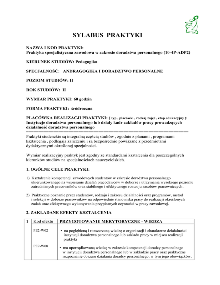 SYLABUS PRAKTYKI NAZWA I KOD PRAKTYKI: Praktyka specjalistyczna zawodowa w zakresie doradztwa personalnego (10-4P-ADP2) KIERUNEK STUDIÓW: Pedagogika SPECJALNOŚĆ: ANDRAGOGIKA I DORADZTWO PERSONALNE POZIOM STUDIÓW: II ROK STUDIÓW: II WYMIAR PRAKTYKI: 60 godzin FORMA PEAKTYKI: śródroczna PLACÓWKA REALIZACJI PRAKTYKI: ( typ , placówki , rodzaj zajęć , etap edukacyjny ): Instytucje doradztwa personalnego lub działy kadr zakładów pracy prowadzących działalność doradztwa personalnego ================================================================= Praktyki studenckie są integralną częścią studiów , zgodnie z planami , programami kształcenia , podlegają zaliczeniu i są bezpośrednio powiązane z przedmiotami dydaktycznymi określonej specjalności. Wymiar realizacyjny praktyk jest zgodny ze standardami kształcenia dla poszczególnych kierunków studiów na specjalnościach nauczycielskich. 1. OGÓLNE CELE PRAKTYKI: 1) Kształcenie kompetencji zawodowych studentów w zakresie doradztwa personalnego ukierunkowanego na wspieranie działań pracodawców w doborze i utrzymania wysokiego poziomu zatrudnianych pracowników oraz stabilnego i efektywnego rozwoju zasobów pracowniczych . 2) Praktyczne poznanie przez studentów, rodzaju i zakresu działalności oraz programów, metod i selekcji w doborze pracowników na odpowiednie stanowiska pracy do realizacji określonych zadań oraz efektywnego wykonywania przypisanych czynności w pracy zawodowej. 2. ZAKŁADANE EFEKTY KSZTAŁCENIA 1 Kod efektu PRZYGOTOWANIE MERYTORYCZNE - WIEDZA PE2-W02 ▪ na pogłębioną i rozszerzoną wiedzę o organizacji i charakterze działalności instytucji doradztwa personalnego lub zakładu pracy w miejscu realizacji praktyki PE2-W08 • ma uporządkowaną wiedzę w zakresie kompetencji doradcy personalnego w instytucji doradztwa personalnego lub w zakładzie pracy oraz praktyczne rozpoznanie obszaru działania doradcy personalnego, w tym jego obowiązków, zadań i uprawnień w strukturze zarządzania zasobami i talentami ludzkimi. PE2-W08 2 3 • ma uporządkowaną wiedzę o systemach , metodach , programach rekrutacji i selekcji pracowników o metodach bezpośredniego docierania do wysokokwalifikowanych pracowników , badaniach (np. testowych ) poziomu kwalifikacji i motywacji do pracy zasobów pracowniczych i inne . Kod efektu PRZYGOTOWANIE MERYTORYCZNE - UMIEJĘTNOŚCI PE2-U03 ▪ potrafi dokonać obserwacji z obszaru działalności i pracy doradcy personalnego oraz rozpoznać i scharakteryzować kwalifikację, potrzebę i motywację osoby pragnącej podjąć prace zawodową. PE2- U08 • potrafi wykorzystać podstawowa terminologię oraz przepisy prawne związane z rekrutacja i selekcją oraz z badaniami psychologicznymi i merytorycznymi osób pozyskiwanych na pracowników , jak zatrudnionych jako pracowników na stanowiskach pracy. PE2- U12 • posiada podstawowe umiejętności w rozpoznawaniu i stosowaniu oraz wykorzystywaniu w praktyce odpowiednie systemy, metody i programy elektroniczne dla doboru i selekcji osób na odpowiednie stanowiska pracy , PE2- U13 • posiada podstawowe umiejętności w rozpoznawaniu zatrudnionych pracowników odnośnie efektywności ich pracy zawodowej w miejscu zatrudnienia kompletacji danych o zatrudnionych pracownikach oraz przetwarzaniu tych danych dla potrzeb efektywnego zarządzania zasobami ludzkimi. Kod efektu KOMPETENCJE SPOŁECZNE PE2- K01 ▪ ma pogłębioną świadomość poziomu swojej wiedzy i umiejętności oraz rozumie i docenia potrzebę rozwoju osobistego w ramach dalszego kształcenia zawodowego w zakresie doradztwa personalnego i zarządzania zasobami ludzkimi w zakładzie pracy i w ogóle. PE1-K03 ▪ docenia znaczenie moralnego postępowania w odniesieniu do własnej i cudzej pracy zgodnie z podstawowymi zasadami etyki zachowań w społeczeństwie. 3. ZADANIA PRAKTYKI TREŚCI ZADAŃ PRAKTYKI 1. Zapoznanie się z strukturą organizacyjną placówki w której odbywa się praktyka , w tym z miejscem lokalizacji i podległości kadrowej stanowiska doradcy personalnego 2. Poznanie rodzaju i zakresu pracy oraz zasad i metod w działalności doradcy personalnego , w tym jego współpracy z innymi komórkami danego zakładu pracy. Liczba godzin 5 10 3 . Poznanie podstawowej dokumentacji z obszaru pracy doradcy personalnego, w tym instrukcji , regulaminów , systemów , metod i programów komputerowych oraz wydruków istotnej dokumentacji z obszaru doboru i selekcji osób na pracowników oraz przebiegu pracy , nagradzania , awansów i kar zatrudnionych pracowników . 15 4. Poznanie różnych form i metod działania doradcy personalnego odnośnie bezpośredniego docierania do wysokokwalifikowanych pracowników , w tym poprzez działania marketingowe. 15 5. Poznanie rodzaju , zakresu , systemu współpracy doradcy personalnego z instytucjami pośrednictwa pracy w kraju i w krajach UE w zakresie poszukiwania i doboru pracowników wg aktualnych i rozwojowych potrzeb zakładu pracy. 5 6. Uczestnictwo praktyczne – bezpośrednie w różnych formach działalności i bezpośredniej pracy doradcy personalnego dla praktycznej weryfikacji posiadanej wiedzy oraz poznania nowych zagadnień rozwiązywanych w praktyce obszaru działalności doradcy personalnego . 10 4. REALIZACJA PRAKTYKI 4.1 Metody pracy : pokaz z objaśnieniem 4.2. Obowiązki : Do obowiązków studenta w miejscu praktyki należy : • godne reprezentowanie uczelni i postępowanie wg regulaminów placówki, w której realizowana jest praktyka • wykonywanie zadań praktyki • prowadzenie dokumentacji tj. samodzielne wpisanie w Karcie praktykanta miejsca praktyk, wypełnienie rubryk harmonogramu (przeniesienie zadań wyszczególnionych w powyższej tabeli (zadania praktyki), oraz dbałość o kompletność dokumentacji przewidzianej programem oraz uzyskanie potwierdzeń wykonywanych czynności (stosowne podpisy i pieczęcie w miejscu odbywanej praktyki wskazane w dokumentacji). Opiekun zakł