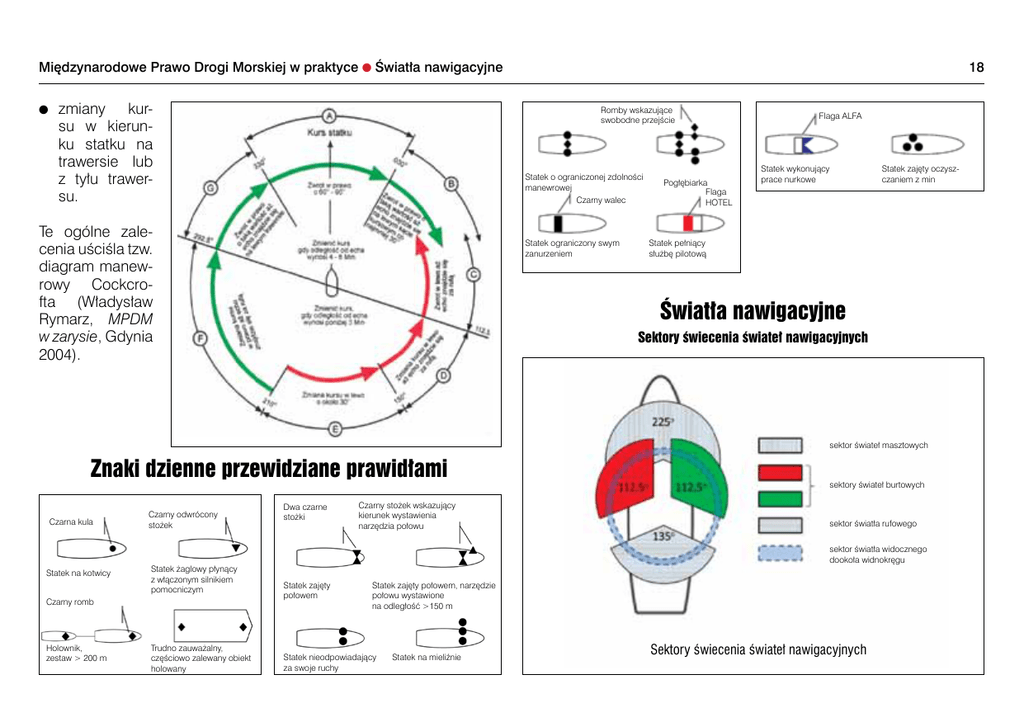 Międzynarodowe Prawo Drogi Morskiej w praktyce l Światła nawigacyjne lzmiany kursu w kierunku statku na trawersie lub z tyłu trawersu. 18 Romby wskazujące swobodne przejście Statek o ograniczonej zdolności manewrowej Czarny walec Te ogólne zalecenia uściśla tzw. diagram manewrowy Cockcrofta (Władysław Rymarz, MPDM w zarysie, Gdynia 2004). Statek ograniczony swym zanurzeniem Pogłębiarka Flaga hotel Flaga ALFA Statek wykonujący prace nurkowe Statek zajęty oczyszczaniem z min Statek pełniący służbę pilotową Światła nawigacyjne Sektory świecenia świateł nawigacyjnych sektor świateł masztowych Znaki dzienne przewidziane prawidłami Czarna kula Statek na kotwicy Czarny odwrócony stożek Statek żaglowy płynący z włączonym silnikiem pomocniczym Czarny romb Holownik, zestaw > 200 m Trudno zauważalny, częściowo zalewany obiekt holowany Dwa czarne stożki Czarny stożek wskazujący kierunek wystawienia narzędzia połowu sektory świateł burtowych sektor światła rufowego sektor światła widocznego dookoła widnokręgu Statek zajęty połowem Statek zajęty połowem, narzędzie połowu wystawione na odległość >150 m Statek nieodpowiadający za swoje ruchy Statek na mieliźnie Sektory świecenia świateł nawigacyjnych
