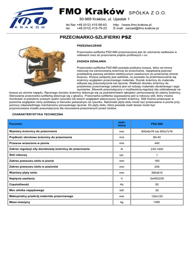 FMO Kraków SPÓŁKA Z O.O. 30-969 Kraków, ul. Ujastek 1 tel./fax +48 (012) 415-58-63 tel. +48 (012) 415-79-23 http: //www.fmo.krakow.pl E-mail: [email protected] PRZECINARKO-SZLIFIERKI PSZ PRZEZNACZENIE Przecinarko-szlifierka PSZ-680 przeznaczona jest do odcinania nadlewów w odlewach oraz do przecinania prętów profilowych i rur. ZASADA DZIAŁANIA Przecinarko-szlifierka PSZ-680 posiada podłuŜny korpus, który od strony roboczej ma zamocowaną ściernicę do przecinania, napędzaną poprzez przekładnię pasową silnikiem elektrycznym osadzonym po przeciwnej stronie korpusu. Korpus podparty jest wahliwie, co pozwala na przemieszczanie się ściernicy względem przecinanego materiału. Docisk ściernicy do materiału odbywa się pneumatycznie lub ręcznie. Wielkość docisku ściernicy do przedmiotu przecinanego zaleŜna jest od rodzaju materiału obrabianego i jego wymiarów. Siłownik pneumatyczny z moŜliwością regulacji siły oddziaływuje na korpus po stronie napędu. Ręcznego docisku ściernicy dokonuje się za pośrednictwem rękojeści zamocowanej do osłony ściernicy. Sterowania przecinarko-szlifierką dokonuje się z głowicy. Przecinarko-szlifierka wyposaŜona jest w roboczy stół, który moŜna montować w połoŜeniu prawym (patrz rysunek) lub lewym względem płaszczyzny symetrii ściernicy. Stół moŜna przesuwać w poziomie względem ramy podstawy w kierunku pokazanym na rysunku. Natomiast płyta stołu moŜe być przesuwana w pionie przy pomocy odpowiedniego mechanizmu poruszanego ręcznie. Do płyty stołu, która posiada rowki teowe moŜe być przymocowane imadło pneumatyczne dla mocowania przecinanych przed miotów. CHARAKTERYSTYKA TECHNICZNA Jedn. miary PSZ-680 Wymiary ściernicy do przecinania mm 600x6x76 lub 600x7x76 Prędkość obrotowa ściernicy do przecinania m/s 80-40 Przesuw wrzeciona w pionie mm 440 N 230-1400 Stół roboczy szt. 1 Zakres przesuwu stołu w pionie mm 160 Zakres przesuwu stołu w poziomie mm 255 Wymiary płyty stołu mm 380x615 Napięcie zasilania V 3x400/230 Częstotliwość Hz 50 Moc silnika napędowego kW 30 Maksymalny przekrój materiału przecinanego mm 120x120 kg 1390 Parametr Zakres regulacji siły dociskowej ściernicy do przecinania Masa maszyny