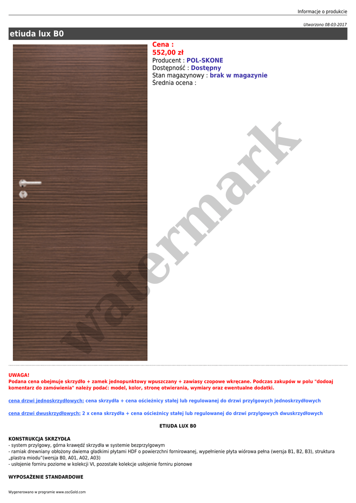 Informacje o produkcie Utworzono 08-03-2017 etiuda lux B0 Cena : 552,00 zł w at er m ar k Producent : POL-SKONE Dostępność : Dostępny Stan magazynowy : brak w magazynie Średnia ocena : UWAGA! Podana cena obejmuje skrzydło + zamek jednopunktowy wpuszczany + zawiasy czopowe wkręcane. Podczas zakupów w polu "dodoaj komentarz do zamówienia" należy podać: model, kolor, stronę otwierania, wymiary oraz ewentualne dodatki. cena drzwi jednoskrzydłowych: cena skrzydła + cena ościeżnicy stałej lub regulowanej do drzwi przylgowych jednoskrzydłowych cena drzwi dwuskrzydłowych: 2 x cena skrzydła + cena ościeżnicy stałej lub regulowanej do drzwi przylgowych dwuskrzydłowych ETIUDA LUX B0 KONSTRUKCJA SKRZYDŁA - system przylgowy, górna krawędź skrzydła w systemie bezprzylgowym - ramiak drewniany obłożony dwiema gładkimi płytami HDF o powierzchni fornirowanej, wypełnienie płyta wiórowa pełna (wersja B1, B2, B3), struktura „plastra miodu”(wersja B0, A01, A02, A03) - usłojenie forniru poziome w kolekcji VI, pozostałe kolekcje usłojenie forniru pionowe WYPOSAŻENIE STANDARDOWE Wygenerowano w programie www.oscGold.com - zamek jednopunktowy, wpuszczany, rozstaw 72 mm, na klucz (WK), na wkładkę (WB), lub do blokady łazienkowej (WC) - zawiasy: drzwi w kolorystyce retro, LiMBa (komplet: skrzydło z ościeżnicą drewnianą lub DiN) - czopowe wkręcane regulowane; drzwi fornirowane kolekcja I,II,III,IV (komplet: skrzydło z ościeżnicą drewnianą lub DIN) - czopowe wkręcane; skrzydła do standardowych ościeżnic metalowych - czopowe wkręcane („60”, „70”, „80” - 2 szt., „90” - 3 szt.) KOLORYSTYKA* FORNIROWANE - drzwi fornirowane POL-SKONE pokryte są ekologicznym lakierem UV. Ma on zdecydowanie większą odporność na zarysowania i działanie światła od lakierów standartowych kładzionych nawet kilkuwarstwowo. KOLEKCJA I 311 jasny dąb 312 limba 312 KOLEKCJA II 323 dąb rustikal 323 KOLEKCJA III 332 klon 334 dąb europejski 332 334 422 w 421 at LIMBA - fornir limba 421 cappucino 422 mokka 424 teak er m ar k 311 424 RETRO - fornir dąb 340 heban 404 ciemny orzech 405 jasny orzech 340 404 KOLEKCJA IV 351 marrone 352 nero 351 352 405 Informacje o produkcie KOLEKCJA VI 602 teak 612 biały dąb 622 wenge 602 612 622 * z uwagi na jakość druku wielkonakładowego prezentowane kolory mogą różnić się od rzeczywistych. Dopuszczalna różnica w odcieniu skrzydeł, ościeżnic i ramek. w at er m ar k WYPOSAŻENIE DODATKOWE - ZA DOPŁATĄ - rozmiar „100” +20% - rozmiar „110” +40% - wypełnienie z płyty wiórowej pełnej - 178,35 zł butto - zawiasy czopowe regulowane, trzeci zawias w skrzydle („60”, „70”, „80”) - 18,45 zł butto - dodatkowy ramiak (umożliwiający samodzielne skrócenie do 50 mm) (wersja B0) - 24,60 zł butto - dwa dodatkowe ramiaki (umożliwiające samodzielne skrócenie do 90 mm)(wersja B0) - 49,20 zł butto - wzmocnienie pod samozamykacz (nie dotyczy wersji A01, A02, A03) - 30,75 zł butto - zabezpieczenie dolnego ramiaka przed nadmiernym działaniem wilgoci (nie dotyczy skrzydeł z podcięciem wentylacyjnym, nie dotyczy wersji A01, A02, A03) - 24,60 zł butto - maksymalne fabryczne skrócenie drzwi o 100 mm (nie dotyczy wersji A01, A02, A03) +20% - skrzydło o nietypowej głębokości przylgi min. 20 mm +100% - podcięcie wentylacyjne (wersja B0, B1, B2, B3) - 61,50 zł brutto - próg dębowy lakierowany do drzwi jednoskrzydłowych - 61,50 zł brutto - system przesuwny do zabudowy, naścienny, premium (nie dotyczy wersji A01) - cena indywidualna - dodatkowe akcesoria: osłonki na zawiasy, bulaje (wersja B0), kratki wentylacyjne (nie dotyczy A01, B1 - „60”, A02, A03), tuleje wentylacyjne (wersja A01, B0, B1) - cena indywidualna - klamki - cena indywidualna Wygenerowano w programie www.oscGold.com