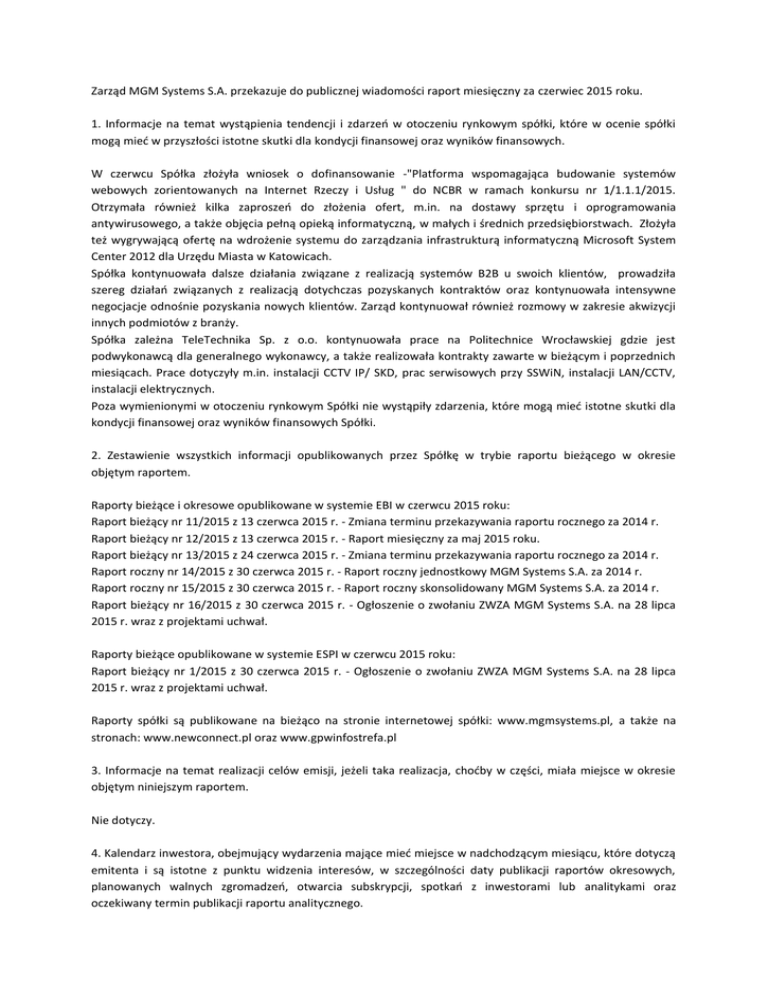 Zarząd MGM Systems S.A. przekazuje do publicznej wiadomości raport miesięczny za czerwiec 2015 roku. 1. Informacje na temat wystąpienia tendencji i zdarzeń w otoczeniu rynkowym spółki, które w ocenie spółki mogą mieć w przyszłości istotne skutki dla kondycji finansowej oraz wyników finansowych. W czerwcu Spółka złożyła wniosek o dofinansowanie -"Platforma wspomagająca budowanie systemów webowych zorientowanych na Internet Rzeczy i Usług " do NCBR w ramach konkursu nr 1/1.1.1/2015. Otrzymała również kilka zaproszeń do złożenia ofert, m.in. na dostawy sprzętu i oprogramowania antywirusowego, a także objęcia pełną opieką informatyczną, w małych i średnich przedsiębiorstwach. Złożyła też wygrywającą ofertę na wdrożenie systemu do zarządzania infrastrukturą informatyczną Microsoft System Center 2012 dla Urzędu Miasta w Katowicach. Spółka kontynuowała dalsze działania związane z realizacją systemów B2B u swoich klientów, prowadziła szereg działań związanych z realizacją dotychczas pozyskanych kontraktów oraz kontynuowała intensywne negocjacje odnośnie pozyskania nowych klientów. Zarząd kontynuował również rozmowy w zakresie akwizycji innych podmiotów z branży. Spółka zależna TeleTechnika Sp. z o.o. kontynuowała prace na Politechnice Wrocławskiej gdzie jest podwykonawcą dla generalnego wykonawcy, a także realizowała kontrakty zawarte w bieżącym i poprzednich miesiącach. Prace dotyczyły m.in. instalacji CCTV IP/ SKD, prac serwisowych przy SSWiN, instalacji LAN/CCTV, instalacji elektrycznych. Poza wymienionymi w otoczeniu rynkowym Spółki nie wystąpiły zdarzenia, które mogą mieć istotne skutki dla kondycji finansowej oraz wyników finansowych Spółki. 2. Zestawienie wszystkich informacji opublikowanych przez Spółkę w trybie raportu bieżącego w okresie objętym raportem. Raporty bieżące i okresowe opublikowane w systemie EBI w czerwcu 2015 roku: Raport bieżący nr 11/2015 z 13 czerwca 2015 r. - Zmiana terminu przekazywania raportu rocznego za 2014 r. Raport bieżący nr 12/2015 z 13 czerwca 2015 r. - Raport miesięczny za maj 2015 roku. Raport bieżący nr 13/2015 z 24 czerwca 2015 r. - Zmiana terminu przekazywania raportu rocznego za 2014 r. Raport roczny nr 14/2015 z 30 czerwca 2015 r. - Raport roczny jednostkowy MGM Systems S.A. za 2014 r. Raport roczny nr 15/2015 z 30 czerwca 2015 r. - Raport roczny skonsolidowany MGM Systems S.A. za 2014 r. Raport bieżący nr 16/2015 z 30 czerwca 2015 r. - Ogłoszenie o zwołaniu ZWZA MGM Systems S.A. na 28 lipca 2015 r. wraz z projektami uchwał. Raporty bieżące opublikowane w systemie ESPI w czerwcu 2015 roku: Raport bieżący nr 1/2015 z 30 czerwca 2015 r. - Ogłoszenie o zwołaniu ZWZA MGM Systems S.A. na 28 lipca 2015 r. wraz z projektami uchwał. Raporty spółki są publikowane na bieżąco na stronie internetowej spółki: www.mgmsystems.pl, a także na stronach: www.newconnect.pl oraz www.gpwinfostrefa.pl 3. Informacje na temat realizacji celów emisji, jeżeli taka realizacja, choćby w części, miała miejsce w okresie objętym niniejszym raportem. Nie dotyczy. 4. Kalendarz inwestora, obejmujący wydarzenia mające mieć miejsce w nadchodzącym miesiącu, które dotyczą emitenta i są istotne z punktu widzenia interesów, w szczególności daty publikacji raportów okresowych, planowanych walnych zgromadzeń, otwarcia subskrypcji, spotkań z inwestorami lub analitykami oraz oczekiwany termin publikacji raportu analitycznego. 28 lipca 2015 r., o godzinie 10:00 ,w siedzibie Spółki przy ul. Krakowskiej 141-155, 50-428 Wrocław, odbędzie się Walne Zgromadzenie Akcjonariuszy. 14 sierpnia 2015 r. Spółka opublikuje raport kwartalny skonsolidowany i jednostkowy za II kw. 2015 roku. Do 14 sierpnia 2015 r. Spółka opublikuje raport miesięczny za lipiec 2015 r. Podstawa prawna: Pkt. 16 Dobrych Praktyk Spółek Notowanych na NewConnect Osoby reprezentujące spółkę: Andrzej Matuła - Członek Zarządu Grzegorz Sawicki - Członek Zarządu