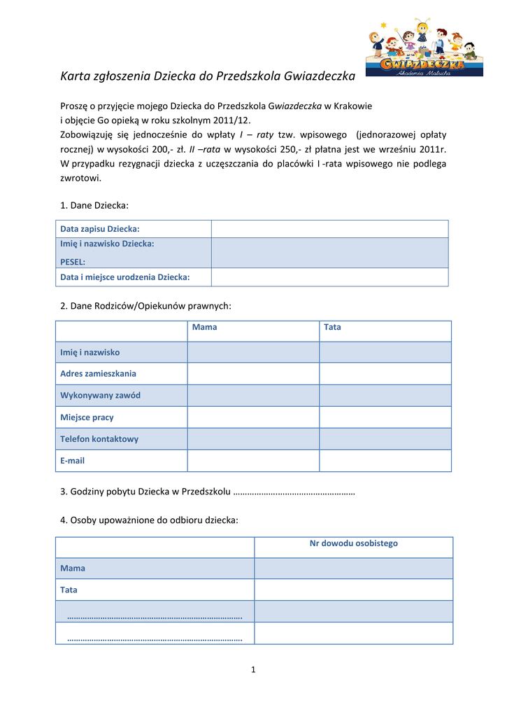 Karta zgłoszenia Dziecka do Przedszkola Gwiazdeczka