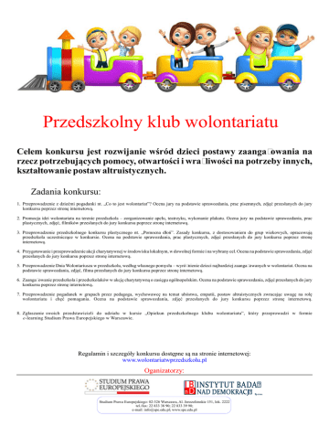 Przedszkolny klub wolontariatu Celem konkursu jest rozwijanie wśród dzieci postawy zaangażowania na rzecz potrzebujących pomocy, otwartości i wrażliwości na potrzeby innych, kształtowanie postaw altruistycznych. Zadania konkursu: 1. Przeprowadzenie z dziećmi pogadanki nt. „Co to jest wolontariat”? Ocena jury na podstawie sprawozdania, prac pisemnych, zdjęć przesłanych do jury konkursu poprzez stronę internetową. 2. Promocja idei wolontariatu na terenie przedszkola – zorganizowanie apelu, teatrzyku, wykonanie plakatu. Ocena jury na podstawie sprawozdania, prac plastycznych, zdjęć, filmików przesłanych do jury konkursu poprzez stronę internetową. 3. Przeprowadzenie przedszkolnego konkursu plastycznego nt. „Pomocna dłoń”. Zasady konkursu, z dostosowaniem do grup wiekowych, opracowują przedszkola uczestniczące w konkursie. Ocena na podstawie sprawozdania, prac plastycznych, zdjęć przesłanych do jury konkursu poprzez stronę internetową. 4. Przygotowanie i przeprowadzenie akcji charytatywnej w środowisku lokalnym, w dowolnej formie i na wybrany cel. Ocena na podstawie sprawozdania, zdjęć przesłanych do jury konkursu poprzez stronę internetową. 5. Przeprowadzenie Dnia Wolontariusza w przedszkolu, według własnego pomysłu – wyróżnienie dzieci najbardziej zaangażowanych w wolontariat. Ocena na podstawie sprawozdania, zdjęć, filmu przesłanych do jury konkursu poprzez stronę internetową. 6. Zaangażowanie przedszkola i przedszkolaków w akcję charytatywną o zasięgu ogólnopolskim. Ocena na podstawie sprawozdania, zdjęć przesłanych do jury konkursu poprzez stronę internetową. 7. Przeprowadzenie pogadanek w grupach przez pedagoga, wychowawcę na temat ubóstwa, empatii, postaw altruistycznych zwracając uwagę na rolę wolontariatu i chęć pomagania. Ocena na podstawie sprawozdania, zdjęć przesłanych do jury konkursu poprzez stronę internetową. 8. Zgłaszanie swoich przedstawicieli do udziału w kursie „Opiekun przedszkolnego klubu wolontariatu”, który przeprowadzi w formie e-learning Studium Prawa Europejskiego w Warszawie. Regulamin i szczegóły konkursu dostępne są na stronie internetowej: www.wolontariatwprzedszkolu.pl Oganizatorzy: IB INSTYTUT BADAŃ n D NAD DEMOKRACJĄ Studium Prawa Europejskiego: 02-326 Warszawa, Al. Jerozolimskie 151, lok. 2222 tel./fax: 22 833 38 90; 22 833 39 90; e-mail: [email protected]; www.spe.edu.pl Sp. z o.o.