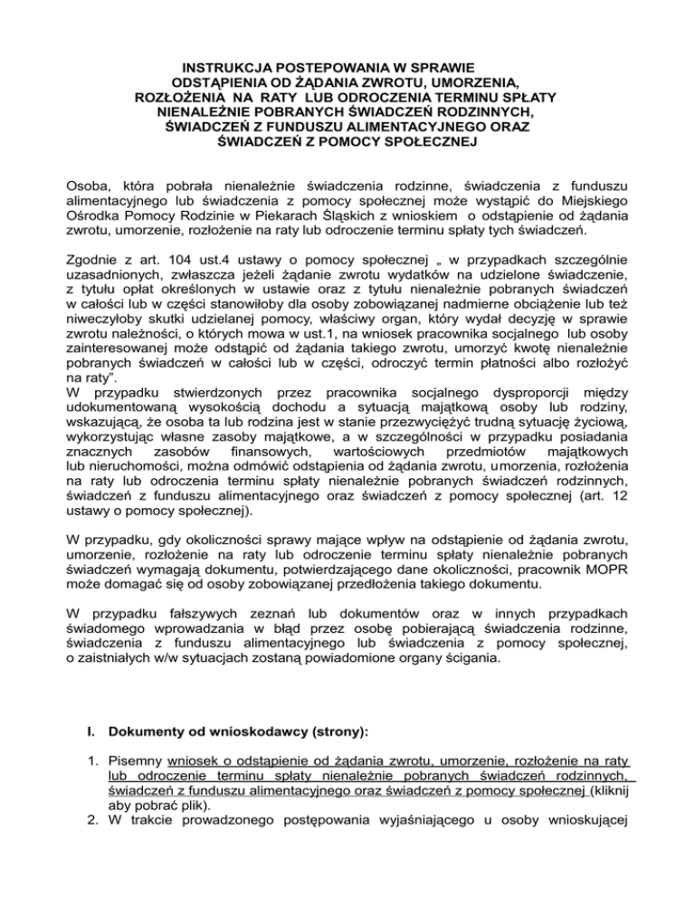 INSTRUKCJA POSTEPOWANIA W SPRAWIE ODSTĄPIENIA OD ŻĄDANIA ZWROTU, UMORZENIA, ROZŁOŻENIA NA RATY LUB ODROCZENIA TERMINU SPŁATY NIENALEŻNIE POBRANYCH ŚWIADCZEŃ RODZINNYCH, ŚWIADCZEŃ Z FUNDUSZU ALIMENTACYJNEGO ORAZ ŚWIADCZEŃ Z POMOCY SPOŁECZNEJ Osoba, która pobrała nienależnie świadczenia rodzinne, świadczenia z funduszu alimentacyjnego lub świadczenia z pomocy społecznej może wystąpić do Miejskiego Ośrodka Pomocy Rodzinie w Piekarach Śląskich z wnioskiem o odstąpienie od żądania zwrotu, umorzenie, rozłożenie na raty lub odroczenie terminu spłaty tych świadczeń. Zgodnie z art. 104 ust.4 ustawy o pomocy społecznej „ w przypadkach szczególnie uzasadnionych, zwłaszcza jeżeli żądanie zwrotu wydatków na udzielone świadczenie, z tytułu opłat określonych w ustawie oraz z tytułu nienależnie pobranych świadczeń w całości lub w części stanowiłoby dla osoby zobowiązanej nadmierne obciążenie lub też niweczyłoby skutki udzielanej pomocy, właściwy organ, który wydał decyzję w sprawie zwrotu należności, o których mowa w ust.1, na wniosek pracownika socjalnego lub osoby zainteresowanej może odstąpić od żądania takiego zwrotu, umorzyć kwotę nienależnie pobranych świadczeń w całości lub w części, odroczyć termin płatności albo rozłożyć na raty”. W przypadku stwierdzonych przez pracownika socjalnego dysproporcji między udokumentowaną wysokością dochodu a sytuacją majątkową osoby lub rodziny, wskazującą, że osoba ta lub rodzina jest w stanie przezwyciężyć trudną sytuację życiową, wykorzystując własne zasoby majątkowe, a w szczególności w przypadku posiadania znacznych zasobów finansowych, wartościowych przedmiotów majątkowych lub nieruchomości, można odmówić odstąpienia od żądania zwrotu, umorzenia, rozłożenia na raty lub odroczenia terminu spłaty nienależnie pobranych świadczeń rodzinnych, świadczeń z funduszu alimentacyjnego oraz świadczeń z pomocy społecznej (art. 12 ustawy o pomocy społecznej). W przypadku, gdy okoliczności sprawy mające wpływ na odstąpienie od żądania zwrotu, umorzenie, rozłożenie na raty lub odroczenie terminu spłaty nienależnie pobranych świadczeń wymagają dokumentu, potwierdzającego dane okoliczności, pracownik MOPR może domagać się od osoby zobowiązanej przedłożenia takiego dokumentu. W przypadku fałszywych zeznań lub dokumentów oraz w innych przypadkach świadomego wprowadzania w błąd przez osobę pobierającą świadczenia rodzinne, świadczenia z funduszu alimentacyjnego lub świadczenia z pomocy społecznej, o zaistniałych w/w sytuacjach zostaną powiadomione organy ścigania. I. Dokumenty od wnioskodawcy (strony): 1. Pisemny wniosek o odstąpienie od żądania zwrotu, umorzenie, rozłożenie na raty lub odroczenie terminu spłaty nienależnie pobranych świadczeń rodzinnych, świadczeń z funduszu alimentacyjnego oraz świadczeń z pomocy społecznej (kliknij aby pobrać plik). 2. W trakcie prowadzonego postępowania wyjaśniającego u osoby wnioskującej o odstąpienie od żądania zwrotu, umorzenie, rozłożenie na raty lub odroczenie terminu spłaty nienależnie pobranych świadczeń rodzinnych, świadczeń z funduszu alimentacyjnego oraz świadczeń z pomocy społecznej wydana zostanie opinia pracownika socjalnego dotycząca sytuacji materialno-bytowej wnioskodawcy w miejscu zamieszkania. II. Informacje na temat opłat: Postępowanie nie podlega opłatom zgodnie z art.2 ust.1 pkt.1c ustawy z 16 listopada 2006r. o opłacie skarbowej (z późn. zm.). III. Forma załatwienia: Decyzja administracyjna lub pismo informujące o pozostawieniu wniosku bez rozpatrzenia. IV. Przewidywany termin załatwienia: Do 30 dni od daty wydania opinii przez pracownika socjalnego i skompletowania dokumentacji. V. Informacje na temat trybu odwoławczego: Od decyzji administracyjnej wydanej przez MOPR przysługuje prawo wniesienia odwołania do Samorządowego Kolegium Odwoławczego za pośrednictwem Dyrektora Miejskiego Ośrodka Pomocy Rodzinie w Piekarach Śląskich w terminie 14 dni od dnia doręczenia decyzji stronie. Odwołanie nie podlega opłatom. VI. Podstawa prawna: 1. Art. 30 ust. 9 ustawy z dnia 28 listopada 2003r. o świadczeniach rodzinnych (Dz.U. z 2006r. Nr 139, poz.922 z późń.zm.). 2. Art. 23, art.41 i art.42 ustawy z dnia 7 września 2007r. o pomocy osobom uprawnionym do alimentów (Dz.U. Nr 192, poz. 1378 z późn.zm.). 3. Art.104 ustawy z dnia 12 marca 2004r. o pomocy społecznej (t.j. Dz.U. z 2009r. Nr 175, poz. 1362, z późn.zm.). 4. Ustawa z dnia 16 listopada 2006r. o opłacie skarbowej (Dz.U. Nr 225, poz. 1635 z późn. zm.). 5. Rozporządzenie Rady Ministrów z dnia 29 lipca 2009r. w sprawie zweryfikowanych kryteriów dochodowych oraz kwot świadczeń pieniężnych z pomocy społecznej (Dz.U. Nr 127, poz. 1055).