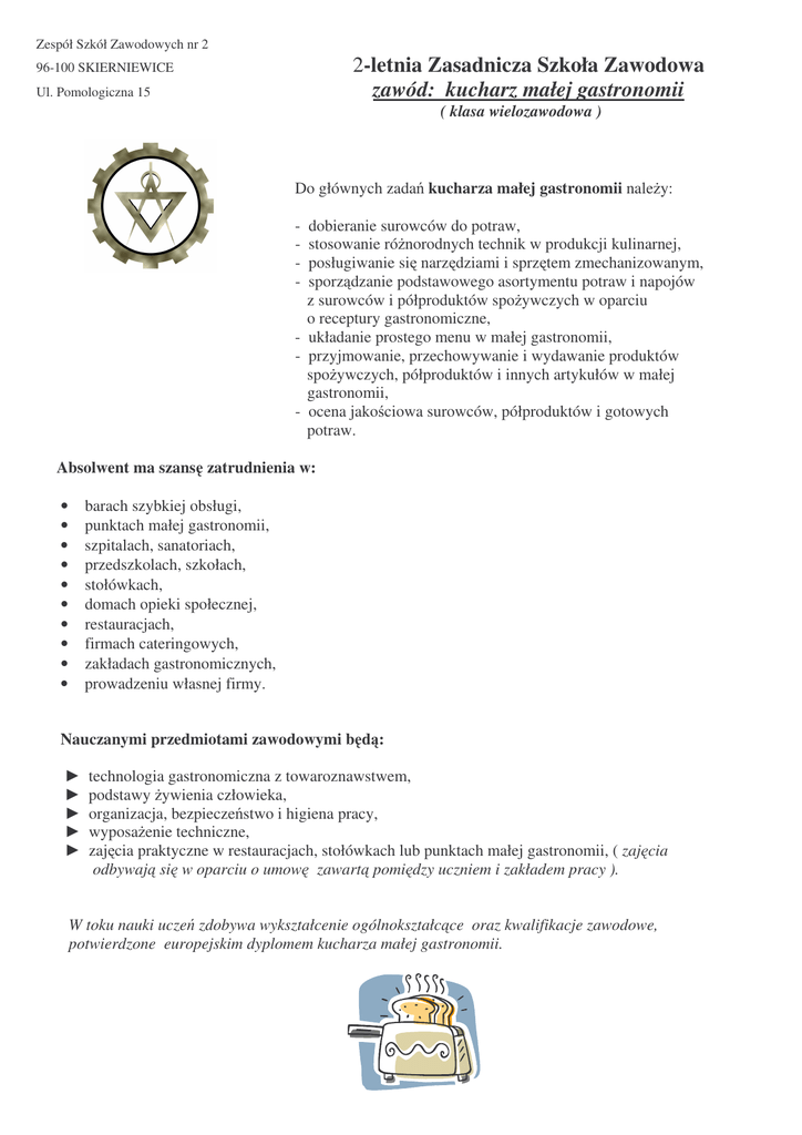 Zespół Szkół Zawodowych nr 2 2-letnia Zasadnicza Szkoła Zawodowa zawód: kucharz małej gastronomii 96-100 SKIERNIEWICE Ul. Pomologiczna 15 ( klasa wielozawodowa ) Do głównych zada kucharza małej gastronomii nale y: - dobieranie surowców do potraw, stosowanie ró norodnych technik w produkcji kulinarnej, posługiwanie si narz dziami i sprz tem zmechanizowanym, sporz dzanie podstawowego asortymentu potraw i napojów z surowców i półproduktów spo ywczych w oparciu o receptury gastronomiczne, - układanie prostego menu w małej gastronomii, - przyjmowanie, przechowywanie i wydawanie produktów spo ywczych, półproduktów i innych artykułów w małej gastronomii, - ocena jako ciowa surowców, półproduktów i gotowych potraw. Absolwent ma szans zatrudnienia w: • • • • • • • • • • barach szybkiej obsługi, punktach małej gastronomii, szpitalach, sanatoriach, przedszkolach, szkołach, stołówkach, domach opieki społecznej, restauracjach, firmach cateringowych, zakładach gastronomicznych, prowadzeniu własnej firmy. Nauczanymi przedmiotami zawodowymi b d : technologia gastronomiczna z towaroznawstwem, podstawy ywienia człowieka, organizacja, bezpiecze stwo i higiena pracy, wyposa enie techniczne, zaj cia praktyczne w restauracjach, stołówkach lub punktach małej gastronomii, ( zaj cia odbywaj si w oparciu o umow zawart pomi dzy uczniem i zakładem pracy ). W toku nauki ucze zdobywa wykształcenie ogólnokształc ce oraz kwalifikacje zawodowe, potwierdzone europejskim dyplomem kucharza małej gastronomii.