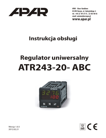 APAR - Biuro Handlowe 05-090 Raszyn, ul. Gałczyńskiego 6 tel. +48 22 101-27-31, 22 853-48-56 email: [email protected] www.apar.pl Instrukcja obsługi Regulator uniwersalny ATR243-20- ABC Wersja 1.0.5 2012.02.21 1 . OGÓLNA CHARAKTERYSTYKA REGULATORA ATR243 n uniwersalne wejście termometryczne i analogowe + wejście cyfrowe n 2 progi o charakterystykach: - próg sterujący ON-OFF, P, PD, PI, PID lub AUTOTUNING PID - próg alarmowy ON-OFF n 2 wyjścia Q1 i Q2 konfigurowane w 7 wariantach: n obudowa 48 x 48 x 133,5mm n programowanie z klawiatury 3-przyciskowej IP65 n podwójny odczyt cyfrowy wskazania odczytu cyfrowego w czasie pomiarów: - górny - wartość mierzona - dolny - wartość 1progu sterującego lub alarmu wskazania odczytu cyfrowego w czasie programowania: - górny - wartość parametru programowanego - dolny - nazwa parametru programowanego n funkcja 3-krokowego kontrolera procesu - programowany gradient i czas trwania przetrzymania n produkcja PIXSYS 2. DANE TECHNICZNE (firmowe ustawienie wejścia - termopara K) . Wejścia temp: Pt100 ............ -50 ÷ 600°C Pt500 ............ -50 ÷ 600°C Pt1000 .......... -50 ÷ 600°C Ni100 ............ -50 ÷ 200°C J .................... -200 ÷ 1200°C K ................... -260 ÷ 1360°C S ................... -40 ÷ 1760°C R ................... -40 ÷ 1760°C PTC(1K)........ -50 ÷ 150°C NTC(10K)...... -50 ÷ 600°C Wejścia analog: 0÷10V, 0/4÷20mA, 0÷40mV Odczyt cyfrowy LED (górny)....... 4 cyfry, 10 mm, (dolny)........ 4 cyfry, 7 mm, Pozycja kropki dziesiętnej .......... 0 całkowite ........................ 0,0 dziesiętne ........................ 0,00 setne (tylko wejścia analogowe) ........................ 0,000 tysięczne (tylko wejścia analogowe) Dokładność (25 °C) ........................0,2 % ±1 cyfra Wyjścia: Q1....................................przekaźnikowe. 5A/250V~ (dla obc.rezystanc) Q2....................................przekaźnikowe. 5A/250V~ (dla obc.rezystanc) lub SSR 12V/30mA lub analogowe 0/4÷20mA, 0÷10V Zakres temperatur pracy ..............0 ÷ 45 °C Zakres wilgotności względnej .....0 ÷ 90 % Zasilanie ........................................24.....230V AC/DC , 3VA Klasy ochronności........................czołowa IP65, obudowa IP30, złącza IP20 Waga ..............................................ok. 270 g PARAMETRY KONFIGURACJI (programowane, chronione hasłem): Rodzaj wejścia ..............................Pt100, Ni100, J, K, S, R, PTC, NTC, 0÷10V, 0/4÷20mA, 0÷40mV Korekcja offsetu (zera) .................-200 ÷ 100 jedn. Korekcja wzmocnienia .................-10,0% ÷ 10,0 % zakresu Wyświetlanie temperatury ...........°C lub °F Rodzaj tuningu...............................manualny lub autotuning Zakres proporcjonalności ............1 ÷ 9999 jedn. (0 ustawia próg ster. w ON-OFF) Czas całkowania ...........................0,0 ÷ 999,9 sek. (0 wyłącza całkowanie) Czas różniczkowania ....................0,0 ÷ 999,9 sek. (0 wyłącza różniczkowanie) Czas impulsowania .......................1 ÷ 300 sek. Histereza (strefa martwa PID).......-999 ÷ 999 jedn. Gradient..........................................1 ÷ 9999°C/60min. Czas przetrzymania ......................00.00 ÷ 24.00 h. (tylko kontroler procesu) Stan styków w czasie pracy .........normalnie rozwarty (GRZANIE) lub normalnie zwarty (CHŁODZENIE) Tryby pracy progu alarmowego....praca niezależna lub alarmy wobec progu sterującego Aktywność diod sygnalizacji ........ze zwartym lub rozwartym stykiem -2- 3. OBUDOWA I SPOSÓB MONTAŻU . Materiał .....................samogasnący ABS UL94-V0 Wymiary .....................48 x 48 x 104 mm 48 11 48 105 45 48 Okno tablicy Sugerowana grubość 2÷8 mm MAX 19 mm 4. OPIS LISTWY ZACISKOWEJ Wejście termometryczne: do zacisków: - Pt100, Pt1000, Ni100 3-przewodowe.......3-2-1 - Pt100, Pt1000, Ni100, 2-przewodowe......3-2, zwora do 3-1 - PTC, NTC, 2-przewodowe........................3-2 - termopary J, K, S, R................................. 2-1 Wejście analogowe: do zacisków: - 0÷10V, 0/4÷20mA ......................1-2 - 0÷10V, 0/4÷20mA przetw. 3-przew....1-2-3 (zac.3 zasil.przetw. +12V) - 4÷20mA przetw. z zasil. w pętli prąd.....1-3 (zac.3 zasil.przetw. +12V ma potencjał wyższy niż zacisk 1) UWAGA! WYBORU RODZAJU WEJŚCIA - ANALOGOWE / TERMOMETRYCZNE DOKONUJE SIĘ ZWORĄ JP 3 (SZCZEGÓŁY - ROZDZIAŁ 8) Zasilanie 24÷230V AC/DC ...........9-10 Wyjścia - OUT1 .........................................6-7-8 - OUT2 .........................................4-5 UWAGA! WYBORU TRYBU PRACY WYJŚCIA OUT2 - PRZEKAŻNIK/SSR + 0/4÷20mA, 0÷10V DOKONUJE SIĘ ZWORAMI JP 5 , JP7 ORAZ JP9 (SZCZEGÓŁY - ROZDZIAŁ 8) -3- 5. FUNKCJE PRZYCISKÓW I WYŚWIETLACZY Wskazania wyświetlacza w czasie pomiarów: wartość mierzona (parametr 46 u i . t Y . ) Wskazania wyświetlacza w czasie programowania: wartość parametru programowanego 1. 2. C1 3. Sygnalizacja optyczna stanu wyjść sterujących C2 A1 4. A2 Sygnalizacja optyczna stanu wyjść alarmowych A3 8. MAN Sygnalizacja optyczna załączenia funkcji “MANUAL” TUN Sygnalizacja optyczna załączenia “AUTOTUNINGU” REM Sygnalizacja optyczna komunikacji poprzez serial port RS. SE T 5. 6. 7. 9. 10. Wejście w tryb zmiany wartości zadanej alarmu , wejście w tryb zmiany parametrów konfiguracji (w tekście oznaczono jako SET) Zwiększanie wartości parametru / progu (w tekście oznaczono jako s ) Zmniejszanie wartości parametru / progu (w tekście oznaczono jako t ) 6. ZMIANA WARTOŚCI PROGÓW W trybie pomiarowym regulatora na górnym (większym) odczycie cyfrowym wyświetlana jest wartość mierzonej temperatury, na dolnym (mniejszym) pokazywana jest wartość progu sterujacego. Wartość progu alarmowego można wyświetlić i zmienić, jeżeli parametr konfiguracji nr 23 A L . 1 - ma inną wartość niż d i S .oraz parametr nr 30 A . I . S . P .ma wartość F r E E (dostęp bezpośredni) - w przypadku braku dos