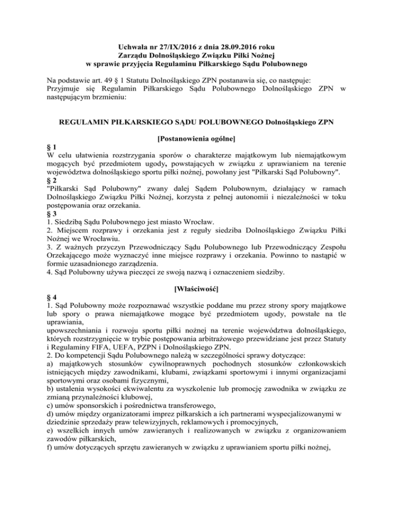 Uchwała nr 27/IX/2016 z dnia 28.09.2016 roku Zarządu Dolnośląskiego Związku Piłki Nożnej w sprawie przyjęcia Regulaminu Piłkarskiego Sądu Polubownego Na podstawie art. 49 § 1 Statutu Dolnośląskiego ZPN postanawia się, co następuje: Przyjmuje się Regulamin Piłkarskiego Sądu Polubownego Dolnośląskiego ZPN w następującym brzmieniu: REGULAMIN PIŁKARSKIEGO SĄDU POLUBOWNEGO Dolnośląskiego ZPN [Postanowienia ogólne] §1 W celu ułatwienia rozstrzygania sporów o charakterze majątkowym lub niemajątkowym mogących być przedmiotem ugody, powstających w związku z uprawianiem na terenie województwa dolnośląskiego sportu piłki nożnej, powołany jest "Piłkarski Sąd Polubowny". §2 "Piłkarski Sąd Polubowny" zwany dalej Sądem Polubownym, działający w ramach Dolnośląskiego Związku Piłki Nożnej, korzysta z pełnej autonomii i niezależności w toku postępowania oraz orzekania. §3 1. Siedzibą Sądu Polubownego jest miasto Wrocław. 2. Miejscem rozprawy i orzekania jest z reguły siedziba Dolnośląskiego Związku Piłki Nożnej we Wrocławiu. 3. Z ważnych przyczyn Przewodniczący Sądu Polubownego lub Przewodniczący Zespołu Orzekającego może wyznaczyć inne miejsce rozprawy i orzekania. Powinno to nastąpić w formie uzasadnionego zarządzenia. 4. Sąd Polubowny używa pieczęci ze swoją nazwą i oznaczeniem siedziby. [Właściwość] §4 1. Sąd Polubowny może rozpoznawać wszystkie poddane mu przez strony spory majątkowe lub spory o prawa niemajątkowe mogące być przedmiotem ugody, powstałe na tle uprawiania, upowszechniania i rozwoju sportu piłki nożnej na terenie województwa dolnośląskiego, których rozstrzygnięcie w trybie postępowania arbitrażowego przewidziane jest przez Statuty i Regulaminy FIFA, UEFA, PZPN i Dolnośląskiego ZPN. 2. Do kompetencji Sądu Polubownego należą w szczególności sprawy dotyczące: a) majątkowych stosunków cywilnoprawnych pochodnych stosunków członkowskich istniejących między zawodnikami, klubami, związkami sportowymi i innymi organizacjami sportowymi oraz osobami fizycznymi, b) ustalenia wysokości ekwiwalentu za wyszkolenie lub promocję zawodnika w związku ze zmianą przynależności klubowej, c) umów sponsorskich i pośrednictwa transferowego, d) umów między organizatorami imprez piłkarskich a ich partnerami wyspecjalizowanymi w dziedzinie sprzedaży praw telewizyjnych, reklamowych i promocyjnych, e) wszelkich innych umów zawieranych i realizowanych w związku z organizowaniem zawodów piłkarskich, f) umów dotyczących sprzętu zawieranych w związku z uprawianiem sportu piłki nożnej, g) umów o dzieło lub zlecenia zawieranych z trenerami i instruktorami piłkarskimi oraz innymi uczestnikami ruchu sportowego, w tym trenerami prowadzącymi własną działalność gospodarczą, h) ubezpieczeń w sporcie piłki nożnej. §5 Sąd Polubowny nie jest uprawniony do przeprowadzania kontroli decyzji organizacji sportowych podjętych w postępowaniu dyscyplinarnym i wewnątrzorganizacyjnym, przewidzianym przez inne przepisy związkowe lub klubowe. §6 Kluby i związki sportowe, osoby fizyczne uprawiające sport piłki nożnej lub zajmujące się jego organizacją, podmioty gospodarcze profesjonalnie zajmujące się futbolem oraz wszelkie inne osoby prawne prawa prywatnego lub publicznego, mogą poddać pod rozstrzygnięcie Sądu Polubownego każdy spór majątkowy, dotyczący uprawiania sportu piłki nożnej lub zwrócić się o wydanie w tym zakresie opinii konsultacyjnej. §7 1. Sąd Polubowny realizuje swoją podstawową funkcję przez wydawanie orzeczeń arbitrażowych w sprawach poddanych mu do rozpatrzenia na podstawie zapisu na Sąd Polubowny, którego przedmiotem są prawa pozostające w dyspozycji stron i nie objęte treścią stosunków prawa pracy. 2. Zapis na Sąd Polubowny obejmujący spory z zakresu prawa pracy może być sporządzony tylko po powstaniu sporu i wymaga zachowania formy pisemnej. §8 1. Sąd Polubowny jest właściwy do rozstrzygania sporów majątkowych i niemajątkowych wymienionych w § 4 i § 6 nin. Regulaminu, jeżeli: a) strony sporządziły zapis na sąd polubowny lub b) powód w pozwie poddał się kompetencji Sądu Polubownego, a pozwany na zapytanie Przewodniczącego lub Wiceprzewodniczącego Sądu wyraził zgodę na tę właściwość, c) stanowią tak przepisy Dolnośląskiego ZPN, PZPN, FIFA lub UEFA. 2. Wymaganie dotyczące formy zapisu na Sąd Polubowny jest spełnione także wtedy, gdy zapis zamieszczony został w wymienionych między stronami pismach lub oświadczeniach złożonych za pomocą środków porozumienia się na odległość, które pozwalają utrwalić ich treść. Powołanie się w umowie na dokument zawierający postanowienie o poddaniu sporu pod rozstrzygnięcie Sądu Polubownego spełnia wymagania dotyczące formy zapisu na Sąd Polubowny, jeżeli umowa ta jest sporządzona na piśmie, a to powołanie się jest tego rodzaju, że czyni zapis częścią składową umowy. §9 1. Zespół Orzekający może orzekać o swej właściwości, w tym o istnieniu, ważności albo skuteczności zapisu na Sąd Polubowny. Nieważność albo wygaśnięcie umowy podstawowej, w której zamieszczono zapis na Sąd Polubowny, samo przez się nie oznacza nieważności lub wygaśnięcia zapisu. 2. Zarzut braku właściwości Sądu Polubownego może być podniesiony nie później niż w odpowiedzi na pozew lub w innym terminie określonym przez strony, chyba że przed upływem terminu strona nie znała i przy dołożeniu należytej staranności nie mogła poznać podstawy takiego zarzutu albo jego podstawa powstała dopiero po upływie tego terminu. W obu wypadkach Zespół Orzekający może rozpoznać zarzut podniesiony po terminie, jeżeli uzna opóźnienie za usprawiedliwione. Wyznaczenie arbitra przez stronę lub uczestniczenie strony w jego wyznaczeniu nie pozbawia jej prawa do podniesienia tego zarzutu. Zarzut, że zgłoszone w toku postępowan