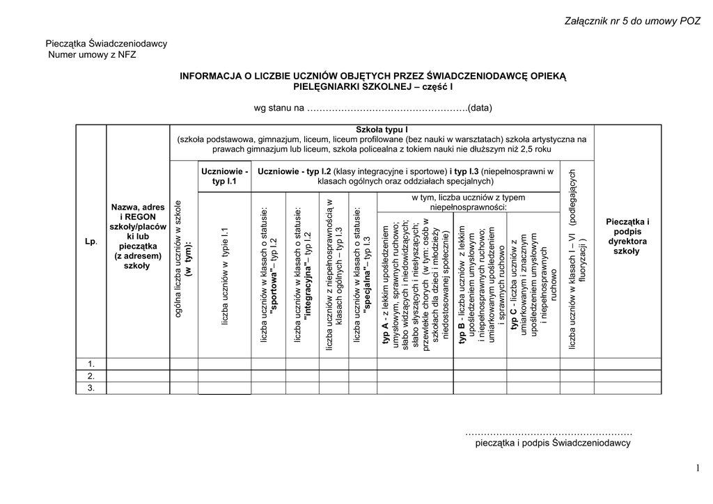 Lp. Nazwa, adres i REGON szkoły/placów ki lub pieczątka (z adresem) szkoły Uczniowie - typ I.2 (klasy integracyjne i sportowe) i typ I.3 (niepełnosprawni w klasach ogólnych oraz oddziałach specjalnych) w tym, liczba uczniów z typem niepełnosprawności: liczba uczniów w klasach I – VI (podlegających fluoryzacji ) typ B - liczba uczniów z lekkim upośledzeniem umysłowym i niepełnosprawnych ruchowo; umiarkowanym upośledzeniem i sprawnych ruchowo typ C - liczba uczniów z umiarkowanym i znacznym upośledzeniem umysłowym i niepełnosprawnych ruchowo typ A - z lekkim upośledzeniem umysłowym, sprawnych ruchowo; słabo widzących i niedowidzących; słabo słyszących i niesłyszących; przewlekle chorych (w tym: osób w szkołach dla dzieci i młodzieży niedostosowanej społecznie) liczba uczniów w klasach o statusie: "specjalna"– typ I.3 liczba uczniów z niepełnosprawnością w klasach ogólnych – typ I.3 liczba uczniów w klasach o statusie: "integracyjna"– typ I.2 Uczniowie typ I.1 liczba uczniów w klasach o statusie: "sportowa"– typ I.2 liczba uczniów w typie I.1 ogólna liczba uczniów w szkole (w tym): Załącznik nr 5 do umowy POZ Pieczątka Świadczeniodawcy Numer umowy z NFZ INFORMACJA O LICZBIE UCZNIÓW OBJĘTYCH PRZEZ ŚWIADCZENIODAWCĘ OPIEKĄ PIELĘGNIARKI SZKOLNEJ – część I wg stanu na …………………………………………….(data) Szkoła typu I (szkoła podstawowa, gimnazjum, liceum, liceum profilowane (bez nauki w warsztatach) szkoła artystyczna na prawach gimnazjum lub liceum, szkoła policealna z tokiem nauki nie dłuższym niż 2,5 roku Pieczątka i podpis dyrektora szkoły 1. 2. 3. ……………………………………………… pieczątka i podpis Świadczeniodawcy 1 Załącznik nr 5 do umowy POZ Pieczątka Świadczeniodawcy Numer umowy z NFZ INFORMACJA O LICZBIE UCZNIÓW OBJĘTYCH PRZEZ ŚWIADCZENIODAWCĘ OPIEKĄ PIELĘGNIARKI SZKOLNEJ – część II wg stanu na …………………………………………….(data) Szkoła typu III (szkoła specjalna dla dzieci i młodzieży) liczba uczniów w klasach I – VI (podlegających fluoryzacji ) typ C - liczba uczniów z umiarkowanym i znacznym upośledzeniem umysłowym i niepełnosprawnych ruchowo typ B - liczba uczniów z lekkim upośledzeniem umysłowym i niepełnosprawnych ruchowo; umiarkowanym upośledzeniem i sprawnych ruchowo typ A - z lekkim upośledzeniem umysłowym, sprawnych ruchowo; słabo widzących i niedowidzących; słabo słyszących i niesłyszących; przewlekle chorych (w tym: osób w szkołach dla dzieci i młodzieży niedostosowanej społecznie) Uczniowie – typ III w tym, liczba uczniów z typem niepełnosprawności: ogólna liczba uczniów w szkole Lp. Nazwa, adres i REGON szkoły/placówki lub pieczątka (z adresem) szkoły ogólna liczba uczniów w szkole Szkoła typu II (szkoła prowadząca naukę zawodu z warsztatami w szkole, szkoła sportowa) Uczniowie – typ II Pieczątka i podpis dyrektora szkoły 1. 2. 3. ……………………………………………… pieczątka i podpis Świadczeniodawcy 2