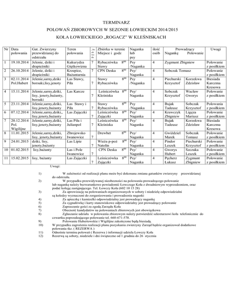 TERMINARZ POLOWAŃ ZBIOROWYCH W SEZONIE ŁOWIECKIM 2014/2015 KOŁA ŁOWIECKIEGO „ROGACZ” W KLEŚNISKACH Nr Data polowania 1 2 3 Gat. Zwierzyny przewidzianej do odstrzału 19.10.2014 Jelenie, dziki i drapieżniki 26.10.2014 Jelenie, dziki i drapieżniki 02.11.2014 Jelenie,sarny,dziki Pol.Hubert borsuki,lisy,jenoty 4 15.11.2014 Jelenie,sarny,dziki, lisy, jenoty,bażanty, borsuki 5 23.11.2014 Jelenie,sarny,dziki, lisy,jenoty,bażanty 6 07.12.2014 Jelenie,sarny,dziki,, lisy,jenoty,bażanty 7 20.12.2014 Jelenie,sarny,dziki, Pol. lisy,jenoty,bażanty Wigilijne 8 11.01.2015 Jelenie,sarny,dziki, lisy, jenoty,bażanty 9 24.01.2015 dziki, lisy, jenoty,bażanty 10 01.02.2015 lisy,bażanty 11 15.02.2015 lisy, bażanty Teren polowania .Nr Zbiórka w terenie ob Miejsce i godz wo du Kukurydza Giętkowizna Krzepice, Bażantarnia Las Stawy, Piła Zbrojewsko Iwanowice Las Lipie 4 Zygmunt Zbigniew 4 Sobczak Tomasz 4 Piechurski Krzysztof Korzekwa Zdzisław 7 800 7 Stawy Rybaczówka 4 7 Leśniczówka 800 Psy/ Kleśniska Naganka Sobczak Krzysztof Wacław Gworys 800 Psy /Naganka 800 Psy/ Naganka 800 Psy/ Naganka 4 Bujak Tadeusz Krawczyk Zbigniew Bujak Tadeusz Sobczak Krzysztof Ligęza Mariusz Korzekwa Zdzisław 800 Psy/ Naganka Wieża p-poż 800 Psy/ Natolin Naganka CPN Deska 800 Psy/ Naganka Leśniczówka 800 Psy/ Zajączki Naganka 4 Gwiździel Marek Pindor Leszek Gworys Hubert Pęcherz Łukasz Sobczak Tomasz Piechurski Krzysztof Szczuka Leszek Zygmunt Zbigniew 7 7 Stawy Rybaczówka Leśniczówka Zajączki Leśniczówka Kleśniska Drewbet 7 7 Las i Pole Iwanowice Las Zajączki Prowadzący Nagankę Polowanie 800 7 Las Piła i Julianpol ilość osób Rybaczówka Stawy CPN Deska 7 Las Karcze Las Stawy i Piła Las Zajączki Naganka lub psy Psy /Naganka Psy/ Naganka Psy /Naganka 7 7 800 4 4 4 4 4 Uwagi: 1) 2) 3) 4) 5) 6) 7) 8) 9) 10) 11) 12) W zależności od realizacji planu może być dokonana zmiana gatunków zwierzyny przewidzianej do odstrzału. W przypadku przewidywanej nieobecności na polowaniu prowadzącego polowanie lub nagankę należy bezwarunkowo powiadomić Łowczego Koła z dwudniowym wyprzedzeniem, oraz podać kolegę zastępującego. Tel. Łowczy Koła (602 10 15 28) Za aprowizację na polowaniach organizowanych w soboty i niedzielę odpowiedzialni są koledzy wyznaczeni do zorganizowania i prowadzenia naganki Za apteczkę i kamizelki odpowiedzialny jest prowadzący nagankę Za sygnałówkę i karty stanowiskowe odpowiedzialny jest prowadzący polowanie Zapraszanie gości za zgodą Zarządu Koła Obecność kandydatów na polowaniach zbiorowych jest obowiązkowa Zgłaszanie udziału w polowaniu zbiorowym należy potwierdzić sekretarzowi koła telefonicznie do czwartku poprzedzającego polowanie tel. 660-671-570. Polowanie Hubertowskie i Wigilijne zakończone będą biesiadą. W przypadku zagrożenia realizacji planu pozyskania zwierzyny Zarząd będzie organizował dodatkowe polowania tkz. ( REZERWA ) Odnośnie terminu polowań ( Rezerwa ) informacji udziela Łowczy Koła Rezerwą są soboty, niedziele i dni świąteczne od 1 grudnia do 26 stycznia Uwagi Polowanie z posiłkiem Polowanie z posiłkiem Biesiada Karczma Kresowa Polowanie z posiłkiem Polowania z posiłkiem Polowanie z posiłkiem Biesiada Karczma Kresowa Polowanie z posiłkiem Polowanie z posiłkiem Polowanie z posiłkiem Polowanie z posiłkiem